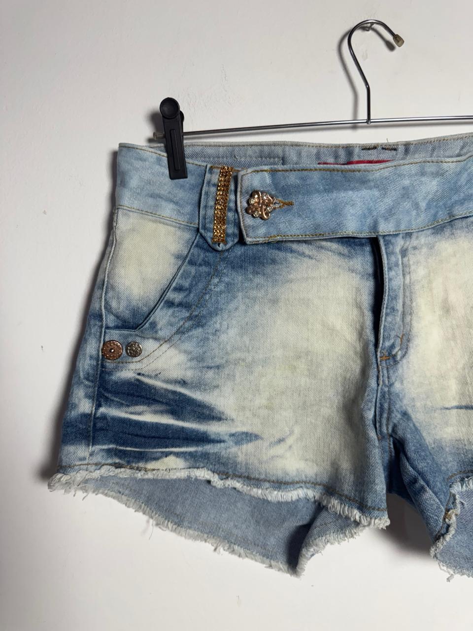 Short Jeans Hot Pants Acid Wash: Curto e com modelagem de cintura alta, apresenta lavagem clara (acid wash ou cloud wash) e barra desfiada. Os detalhes dourados com strass e o botão decorativo conferem um toque glam e fun ao clássico denim.