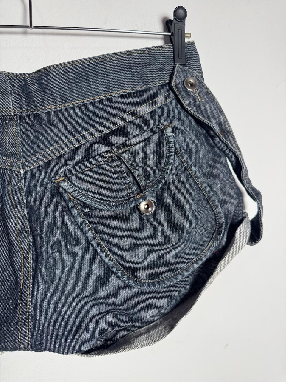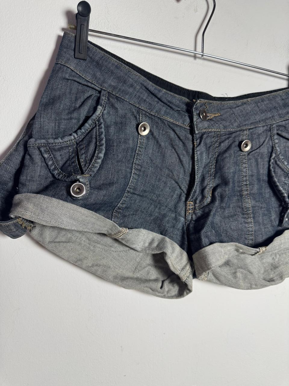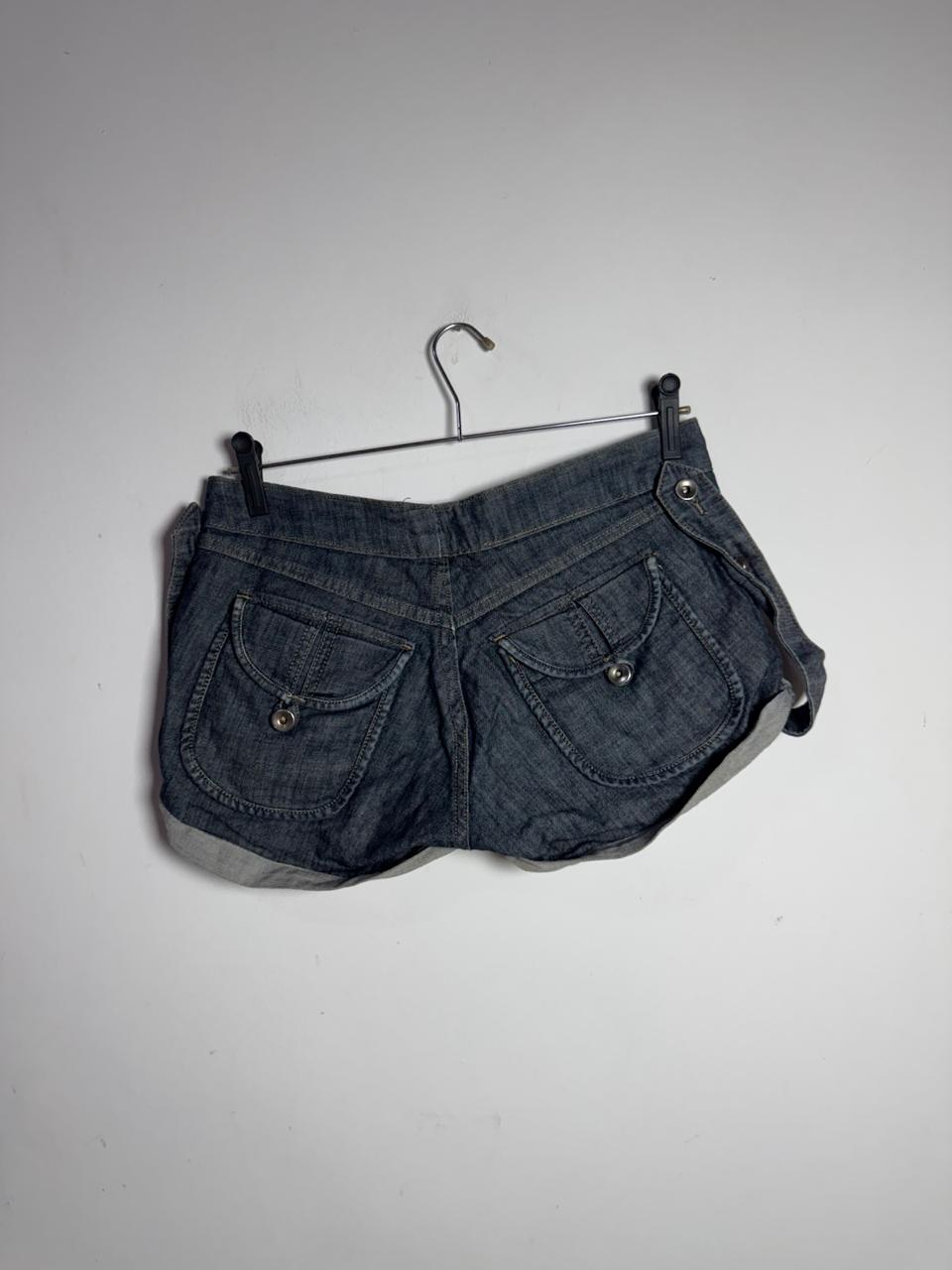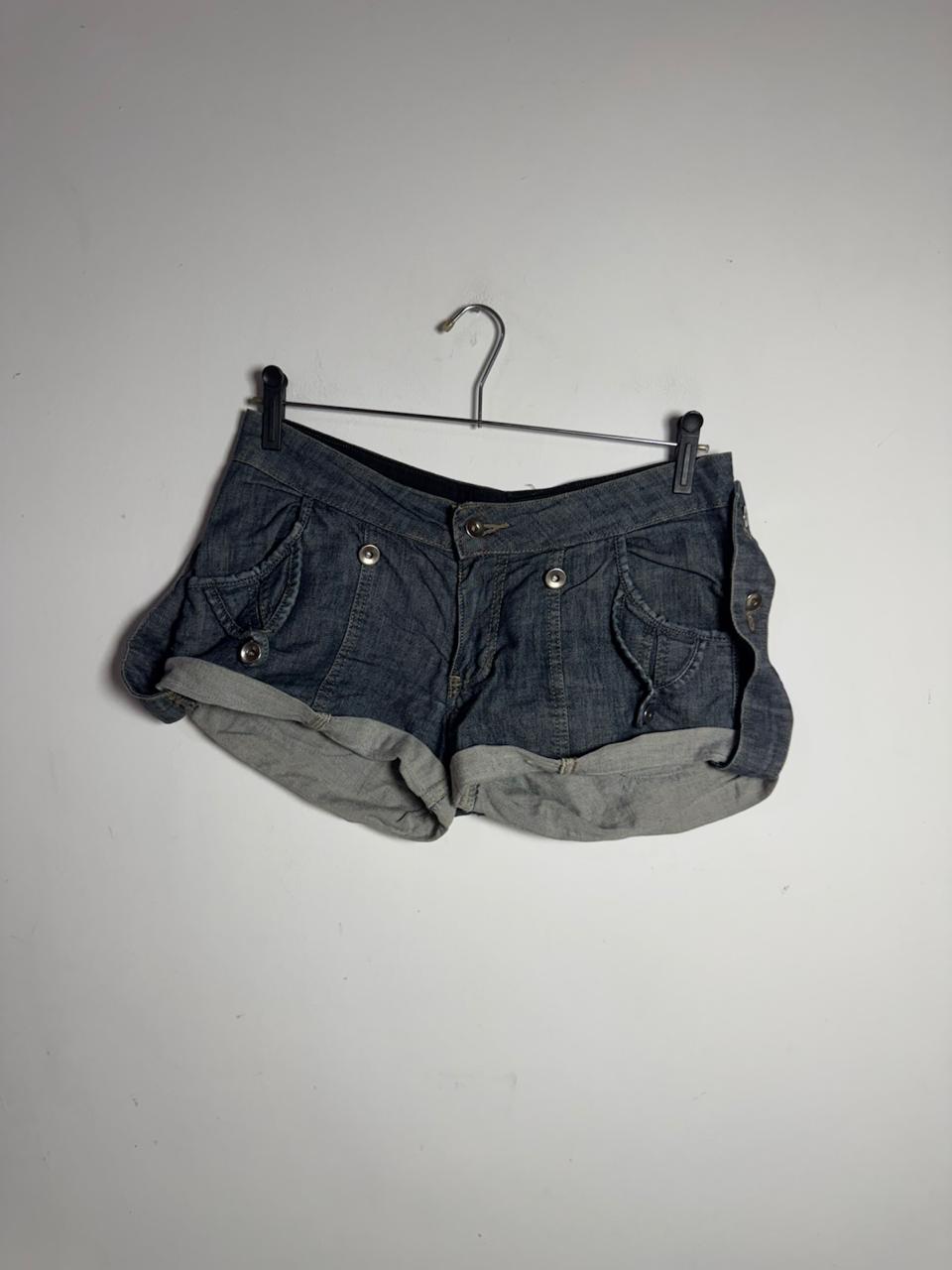 Short de lavagem escura com bolsos frontais utilitários e botões metálicos decorativos. Uma peça despojada e confortável para compor looks de verão ou festivais.