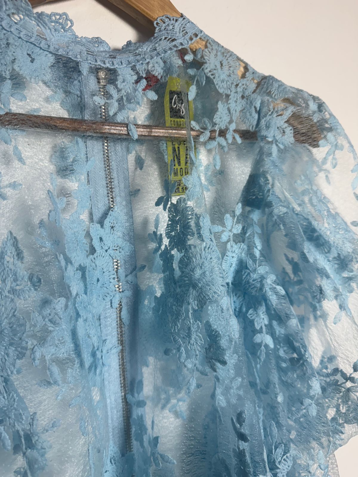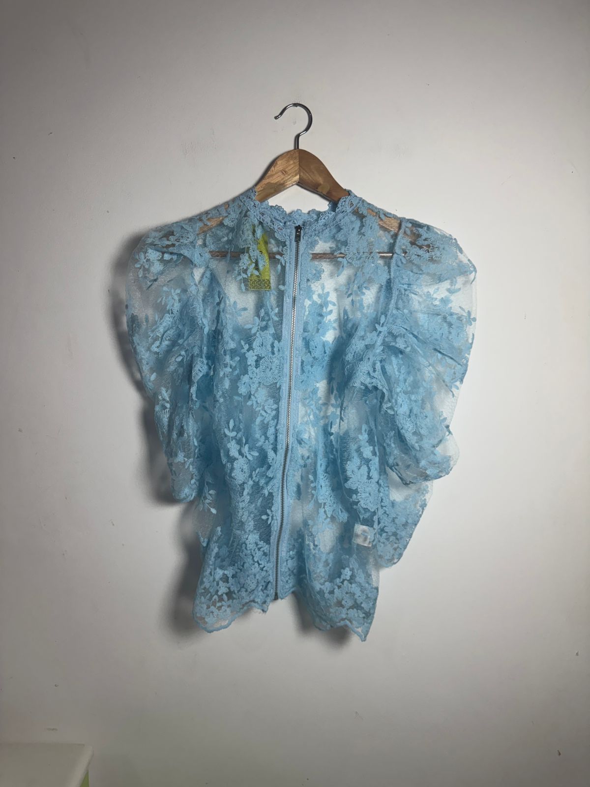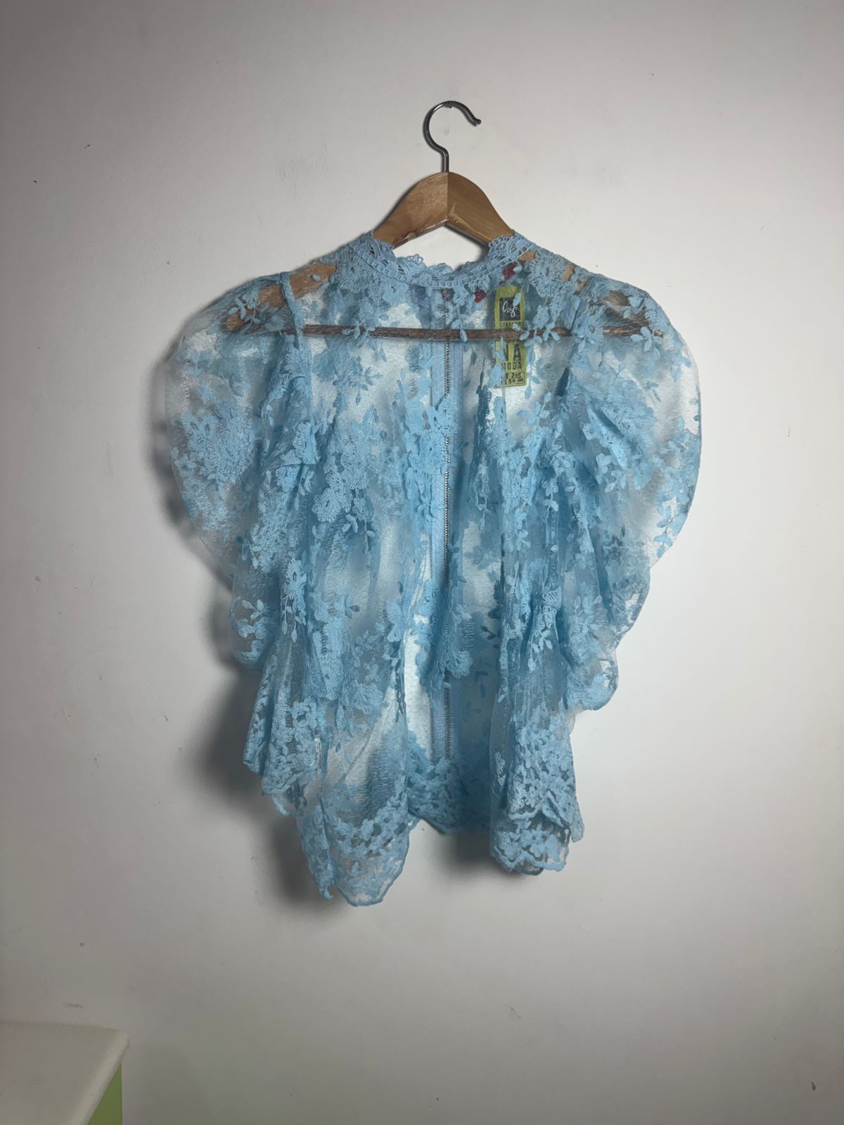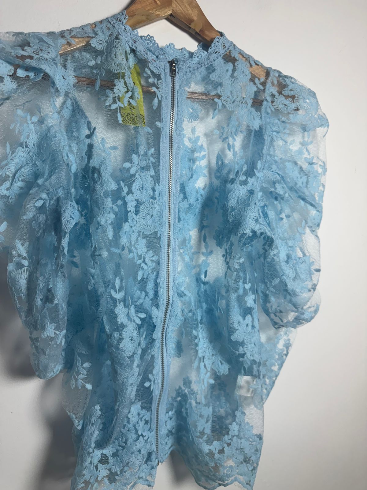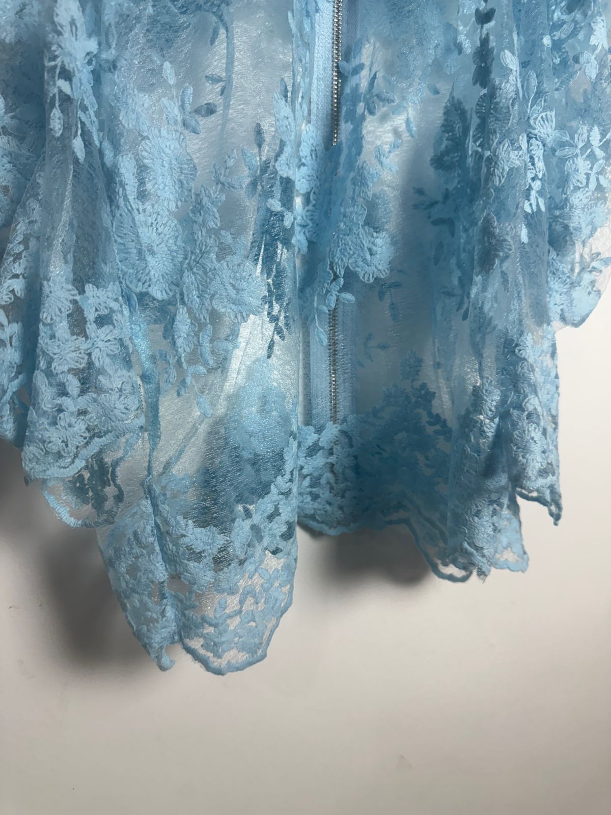 Blusa ou Casaquinho de renda (ou guipir) floral no tom azul bebê, com gola alta discreta, mangas bufantes/volumosas e fechamento em zíper frontal. Uma terceira peça romântica e delicada para um look sofisticado.