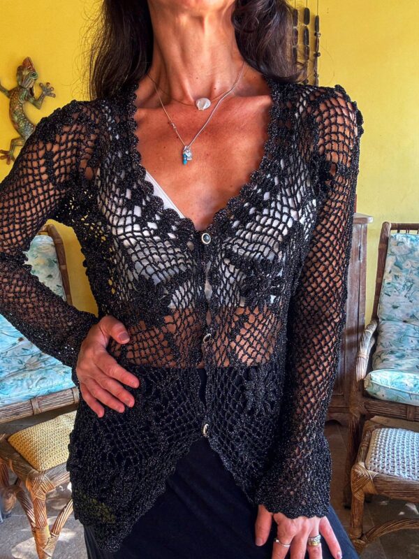 Artesanal e sofisticado, este casaco/cardigã em crochê preto com brilho tem um belo desenho floral vazado nas costas e fechamento frontal com botão. Uma peça única e versátil para sobrepor o seu look com muito estilo e personalidade!