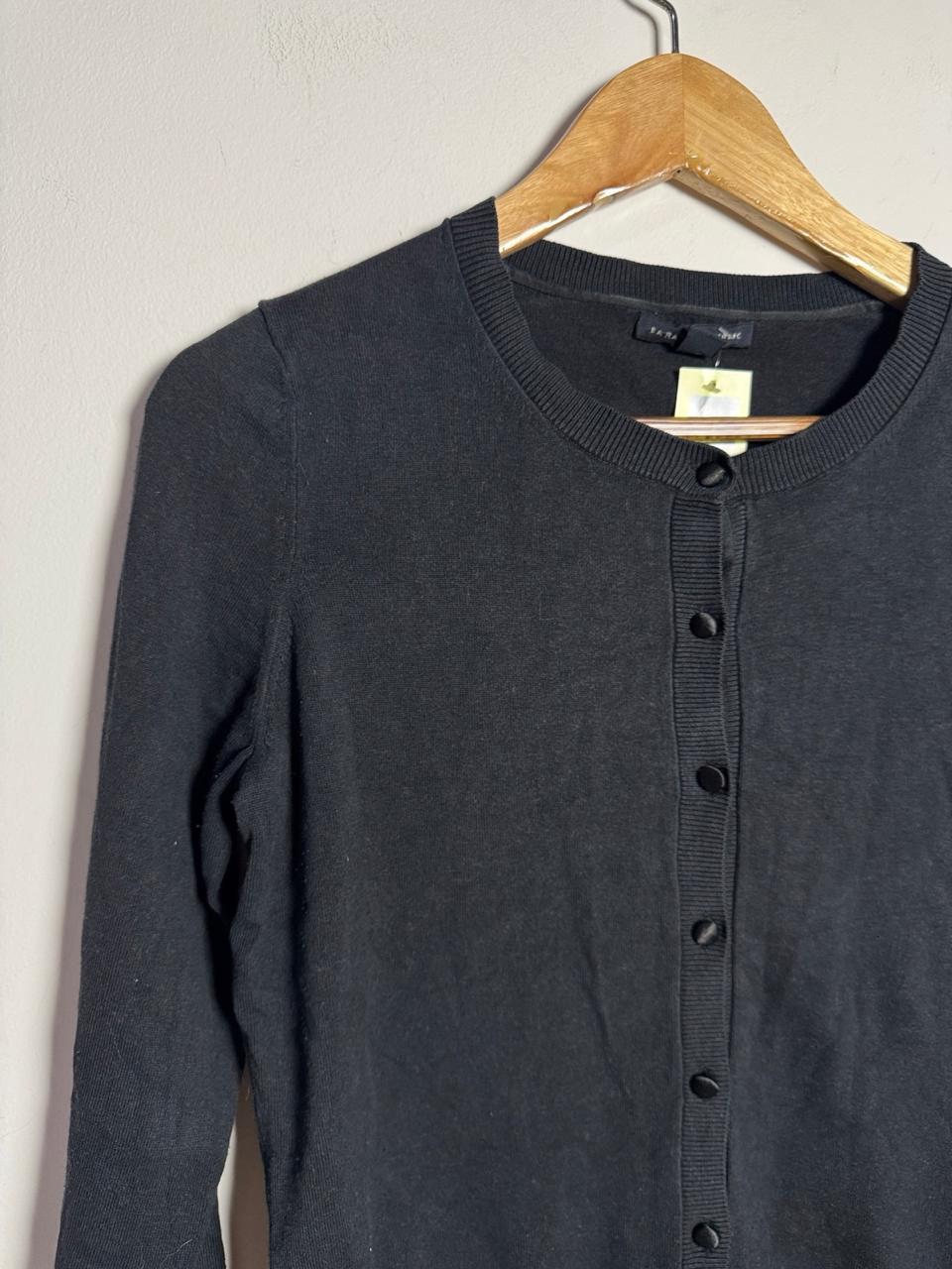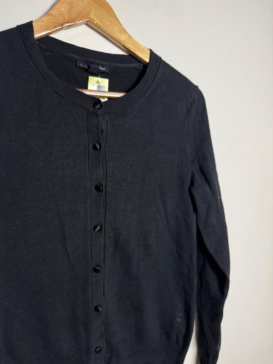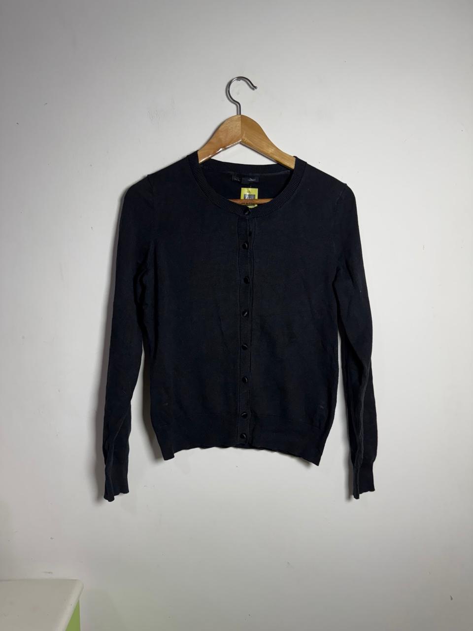 Sueter / Cardigã clássico preto de malha leve e caimento ajustado, com decote redondo e fechamento por botões discretos. Peça atemporal, perfeita para sobreposições versáteis e um toque de sofisticação em qualquer estação.
