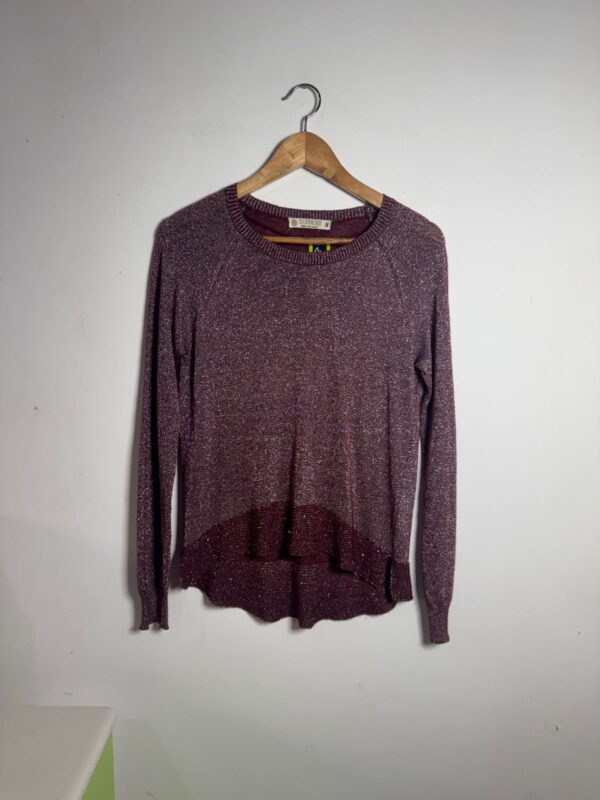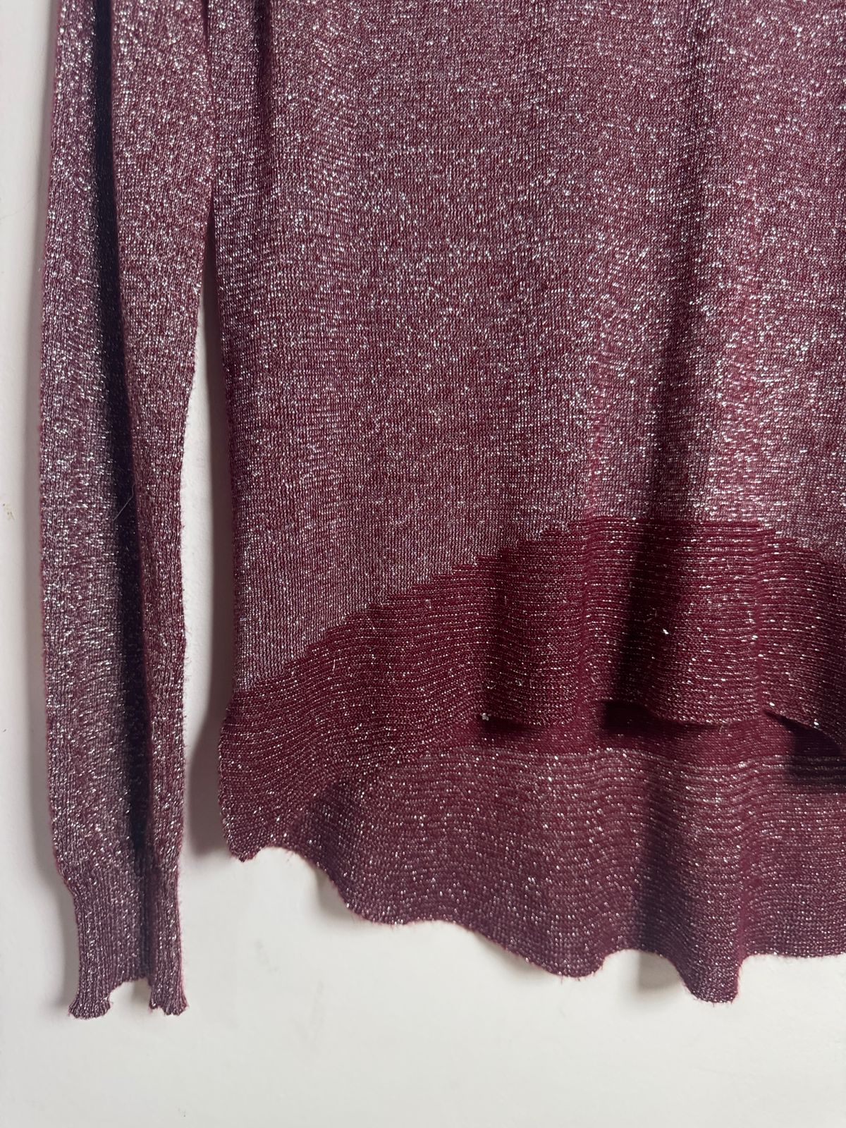 Dê um toque de brilho ao seu look com este suéter em tom de vinho, perfeito para noites frias. Com um caimento elegante e bainha em camadas, essa peça única combina conforto e estilo para qualquer ocasião.