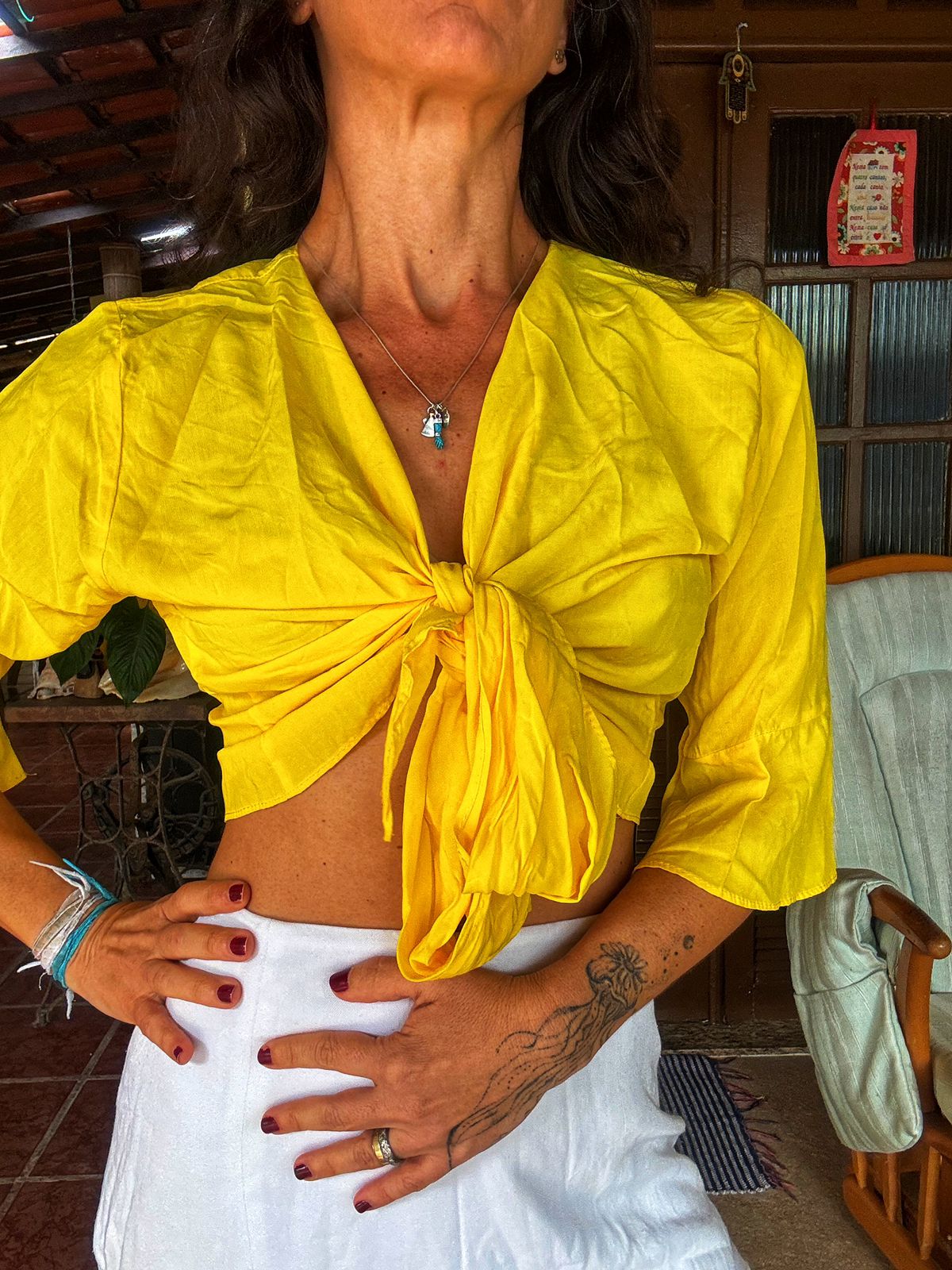 Top cropped amarelo vibrante de manga ampla e amarração frontal ajustável.