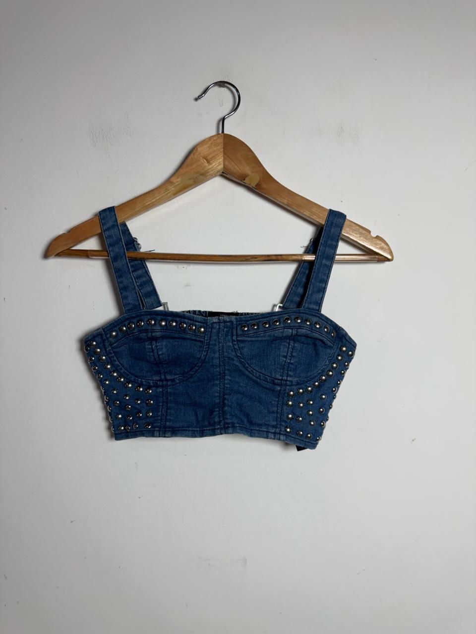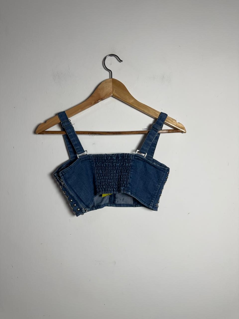 Top curto azul com lavagem média, alças largas e aplicação de esferas prateadas nas laterais. Possui elástico posterior para ajuste ao corpo, sendo ideal para looks casuais noturnos.