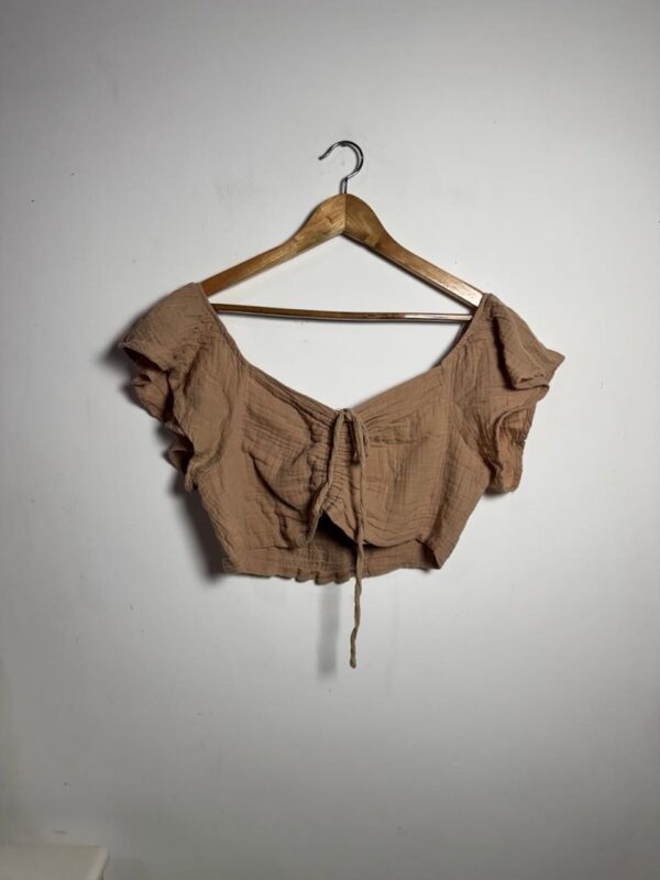Cropped de musseline nude/cappuccino com decote coração e ombros com babado, possui amarração frontal e lastex na cintura para um ajuste perfeito e charme boho-chic.