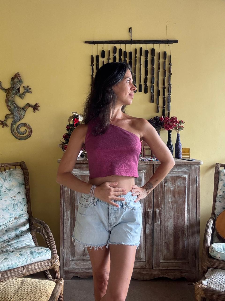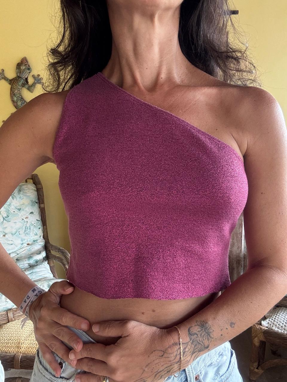 Cropped em malha cintilante de tom magenta que apresenta modelagem assimétrica com apenas uma alça larga e caimento ajustado ao corpo. Esta peça de brilho sutil cria um ponto focal moderno em produções noturnas quando combinada a itens de alfaiataria ou jeans despojados.