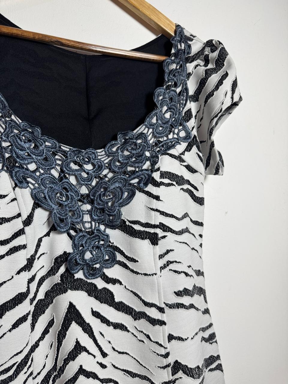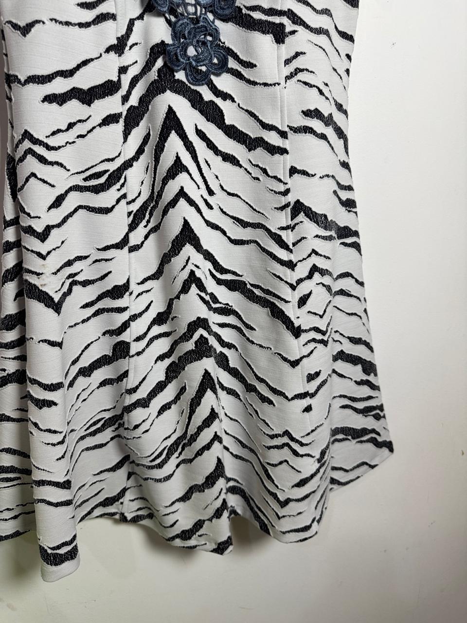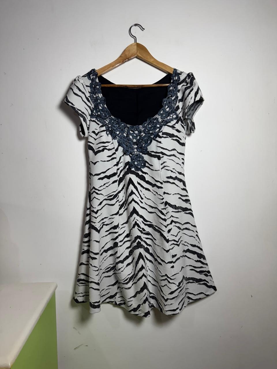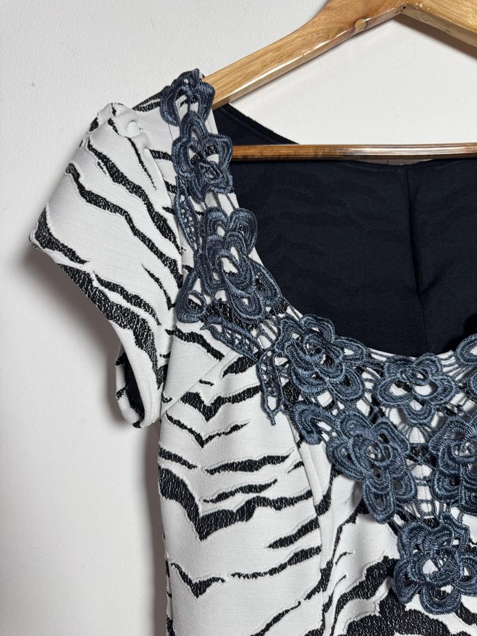 Vestido Mini Animal Print Zebra: Design acinturado com estampa preto e branco e mangas curtas. O detalhe de renda guipir/soutache escura no decote adiciona um toque sofisticado e único ao look.