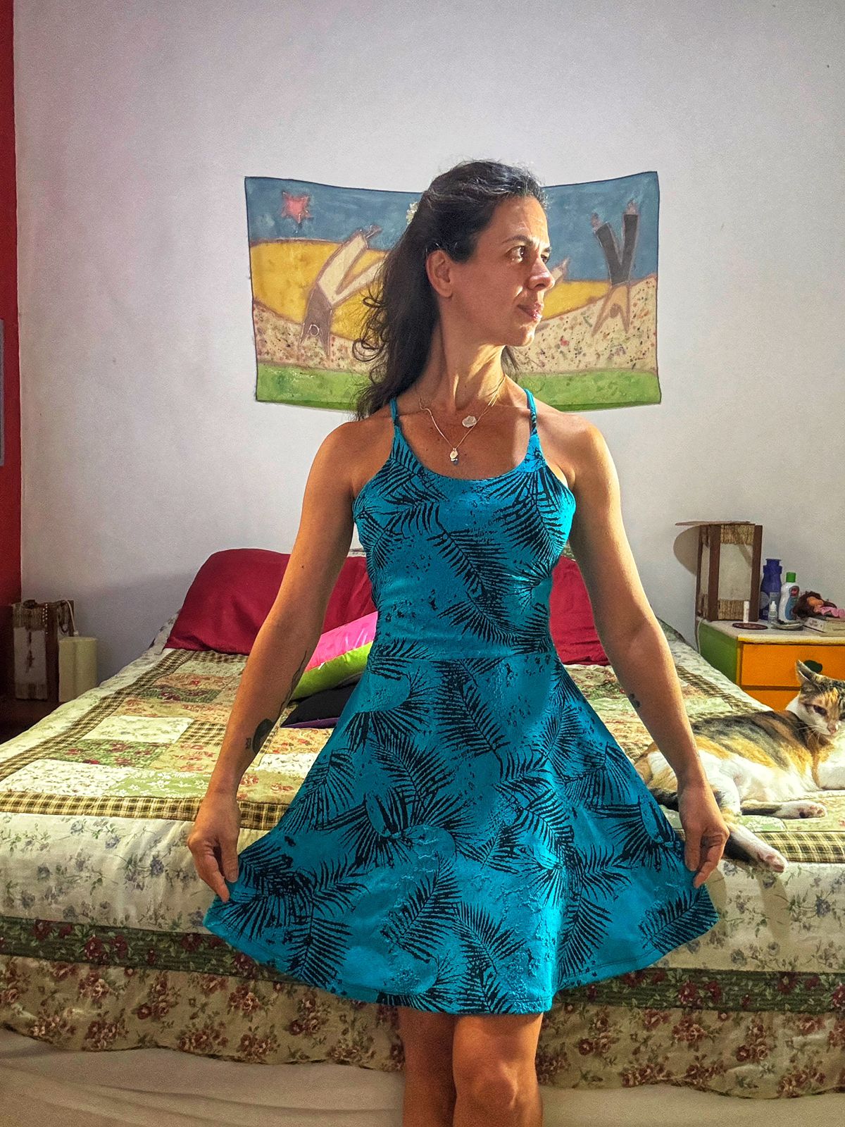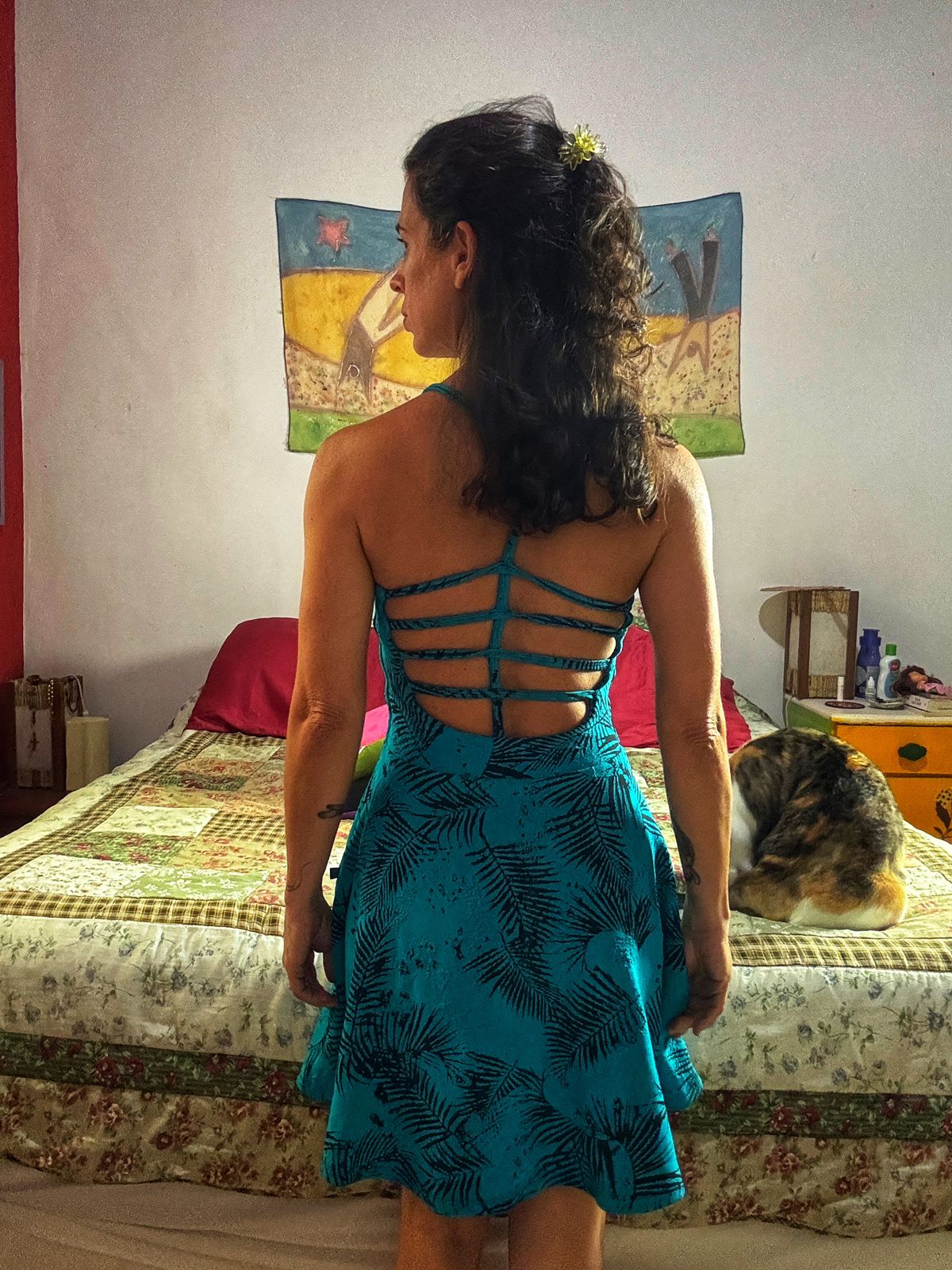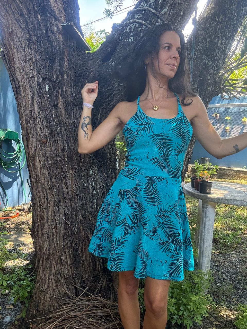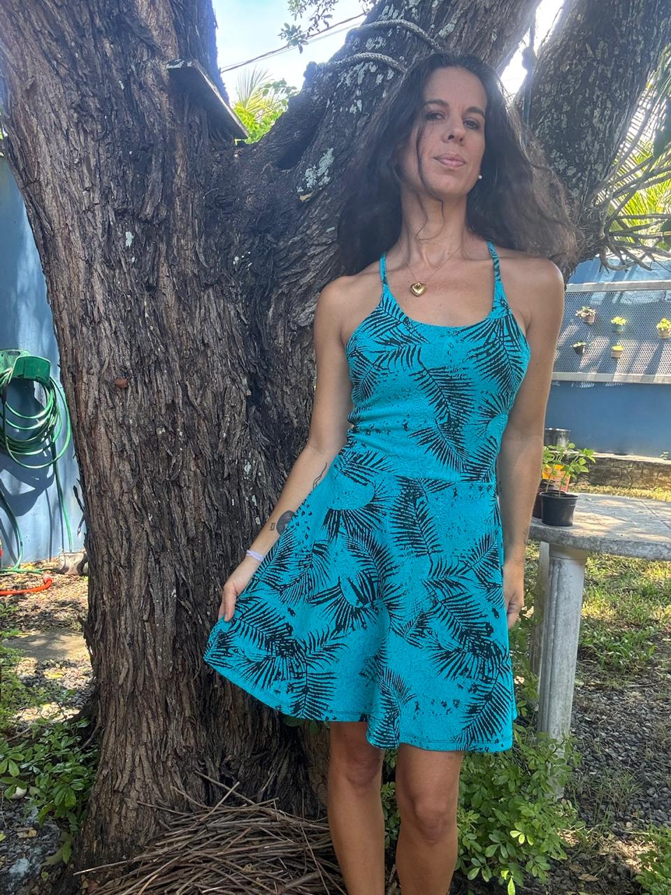 Vibrante azul-turquesa com estampa de palmeiras em preto, este vestido de alça fina e costas vazadas é a peça chave para um verão estiloso e sustentável.