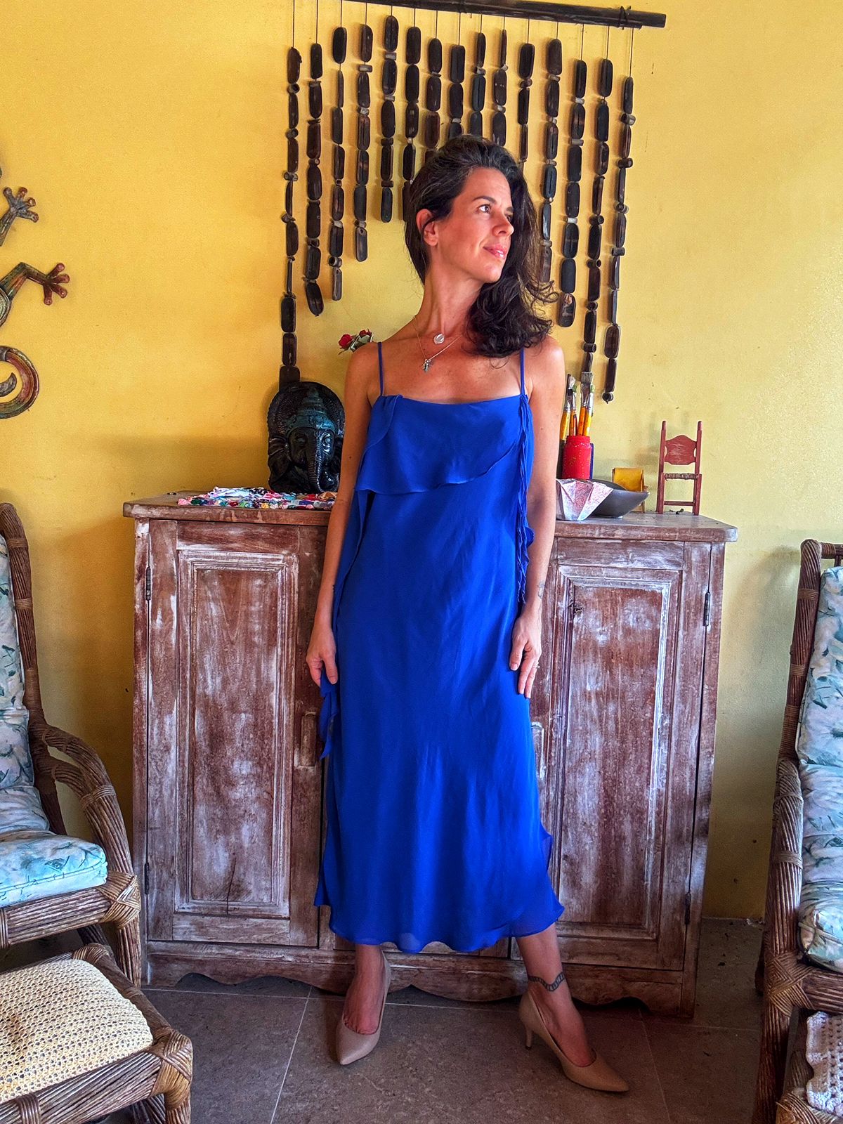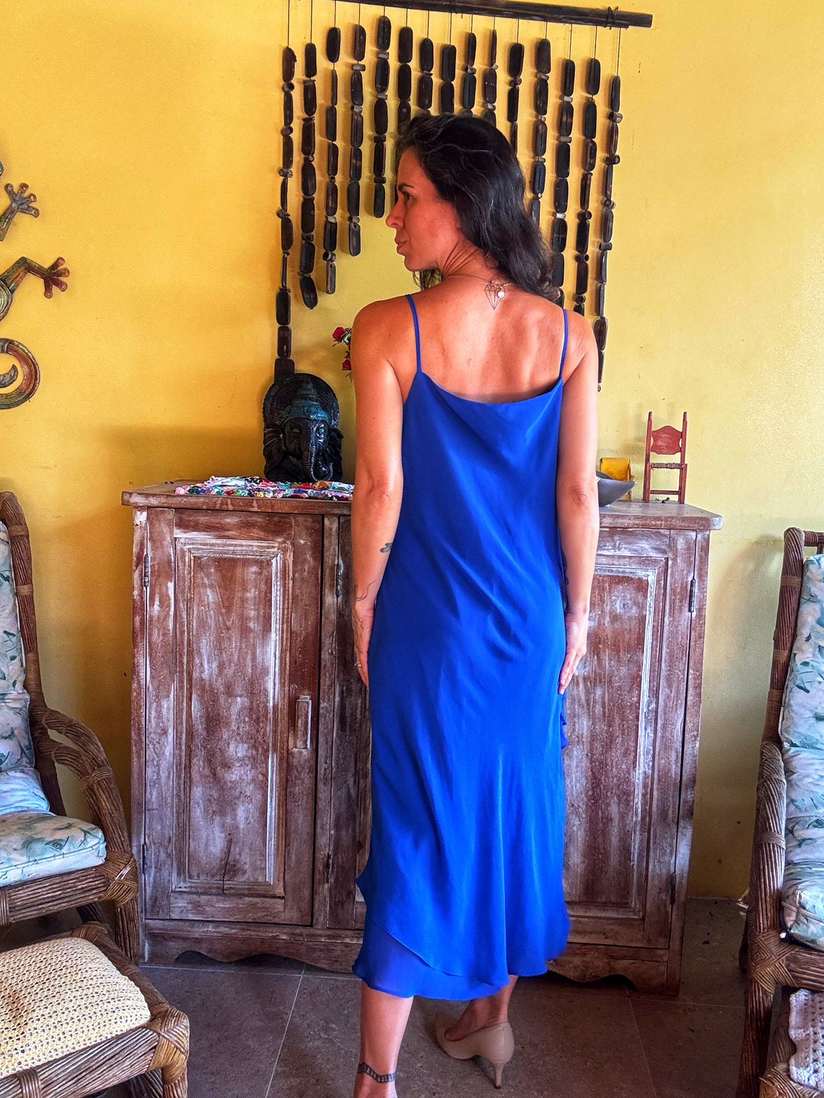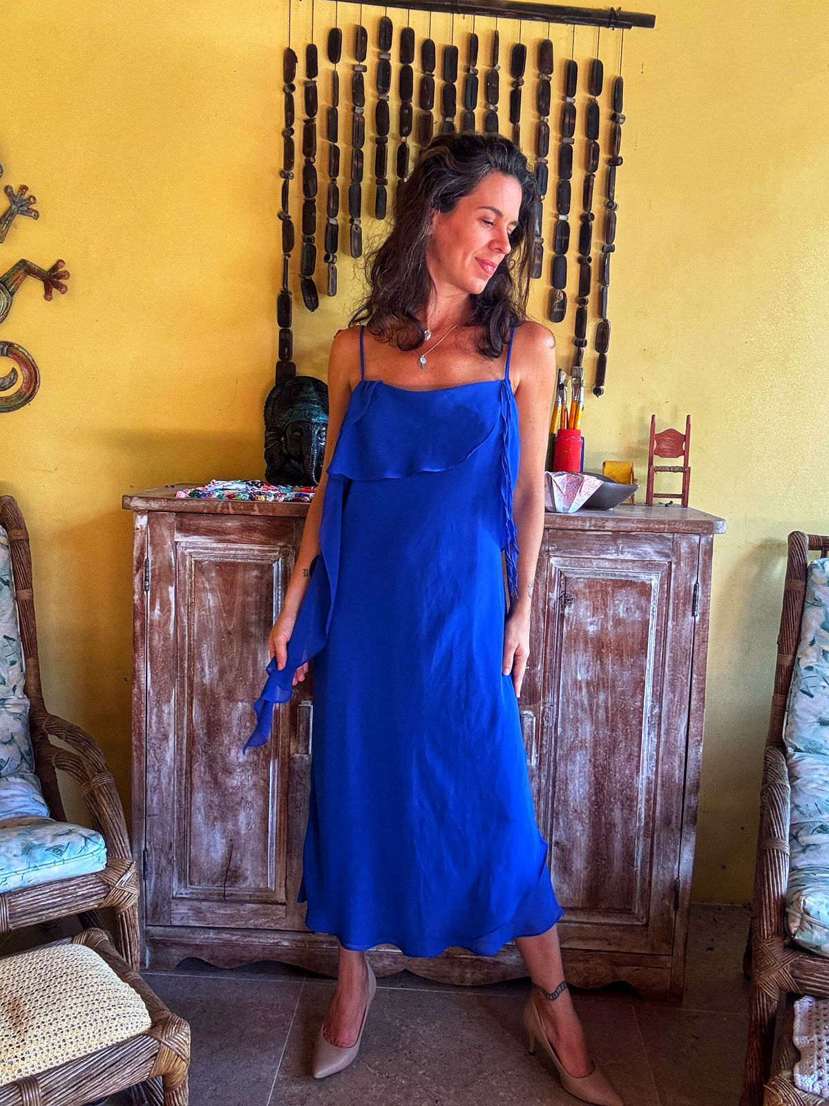 Vestido Midi Alças Finas em Azul Royal Vibrante: Toque sedoso e elegante, com detalhe de babado assimétrico para um charme despojado.