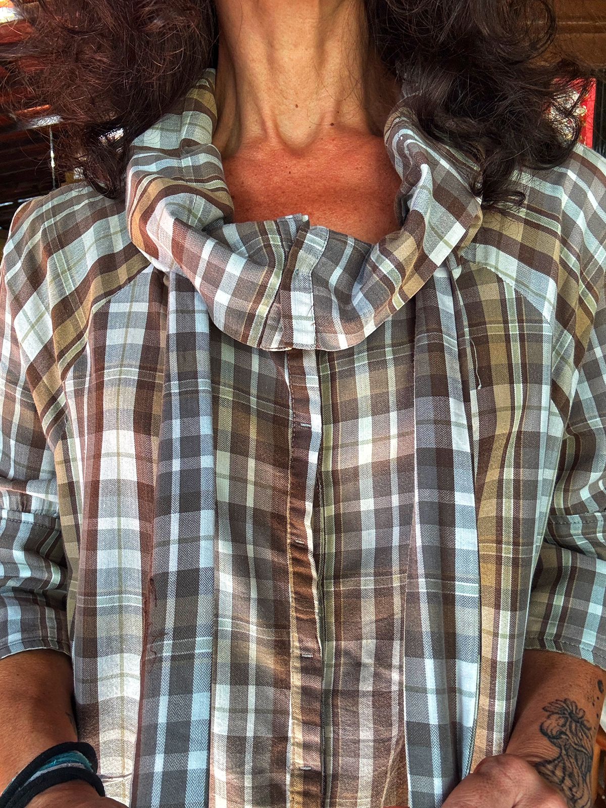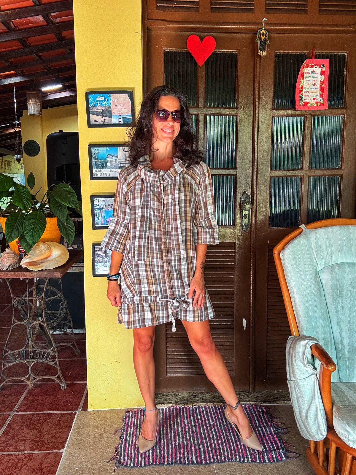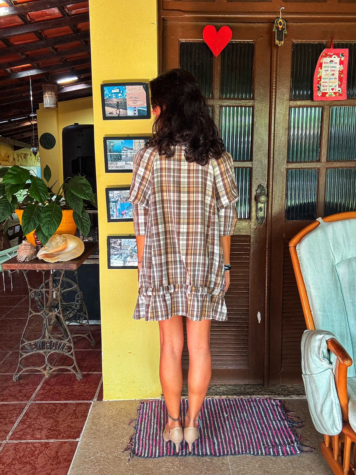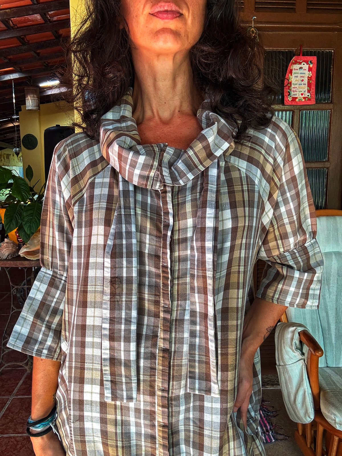 Bata xadrez em tons terrosos, com gola ampla e detalhe de amarração na cintura. Peça versátil e confortável.