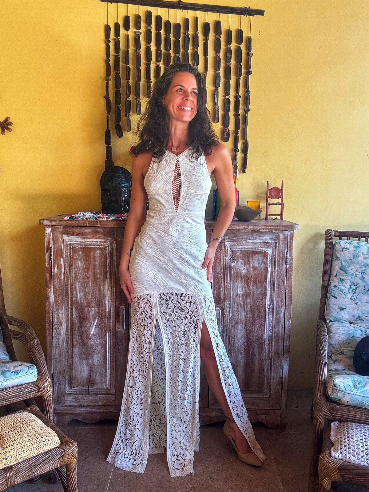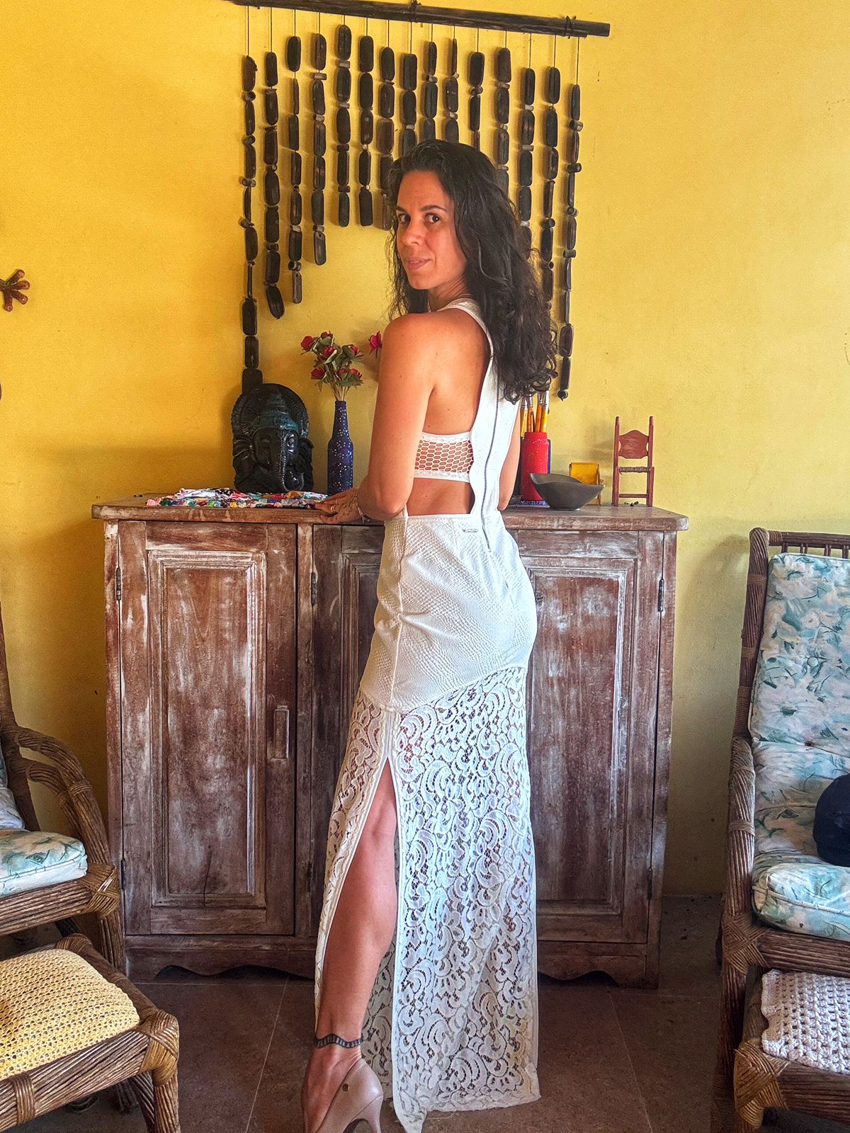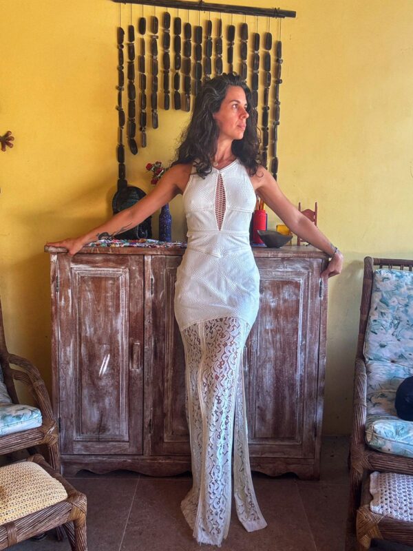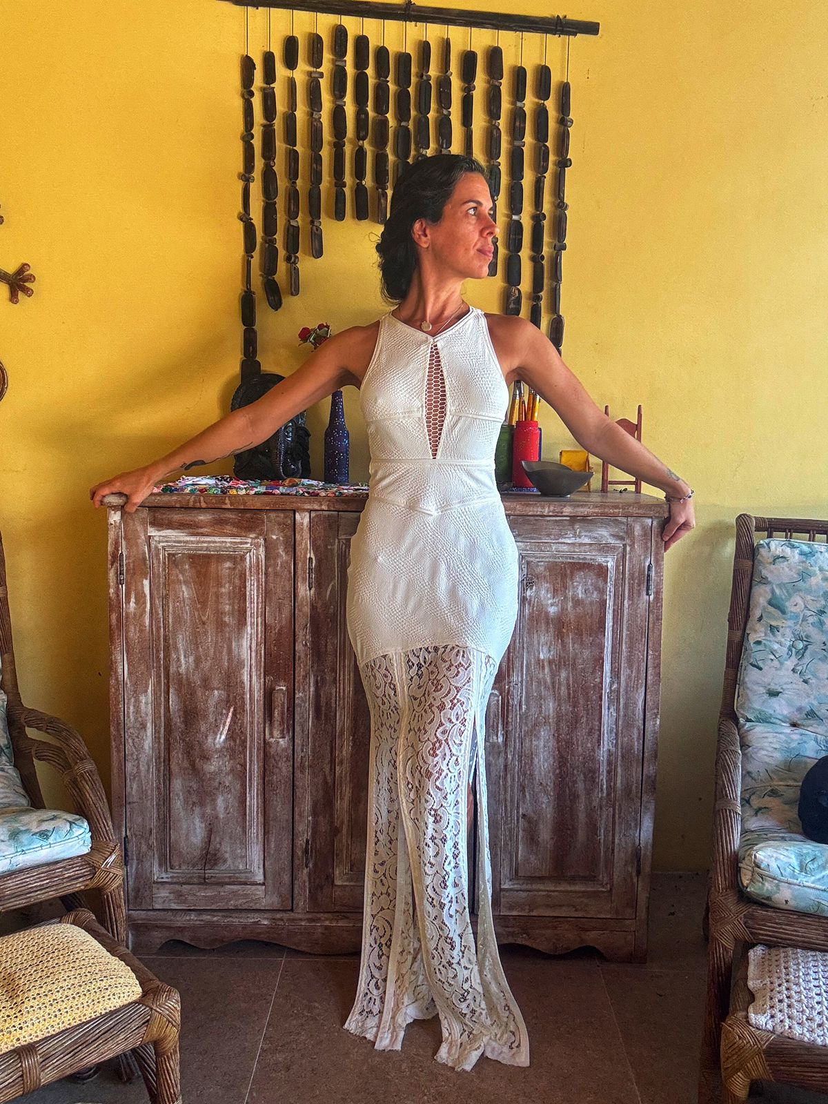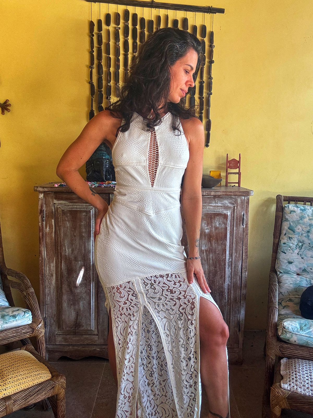 Vestido longo sereia branco (off-white) com tecido texturizado no busto e rendado na saia. Decote halterneck com cut-out e fendas frontais, ideal para um look luxuoso e impactante em eventos de gala.