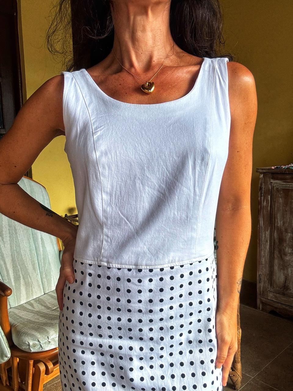 Vestido Bicolor Poá: Peça com modelagem ajustada e acinturada, combinando blusa branca básica e saia lápis com estampa de poá preto e branco. Destaque para o decote quadrado na frente e o charmoso decote V nas costas.