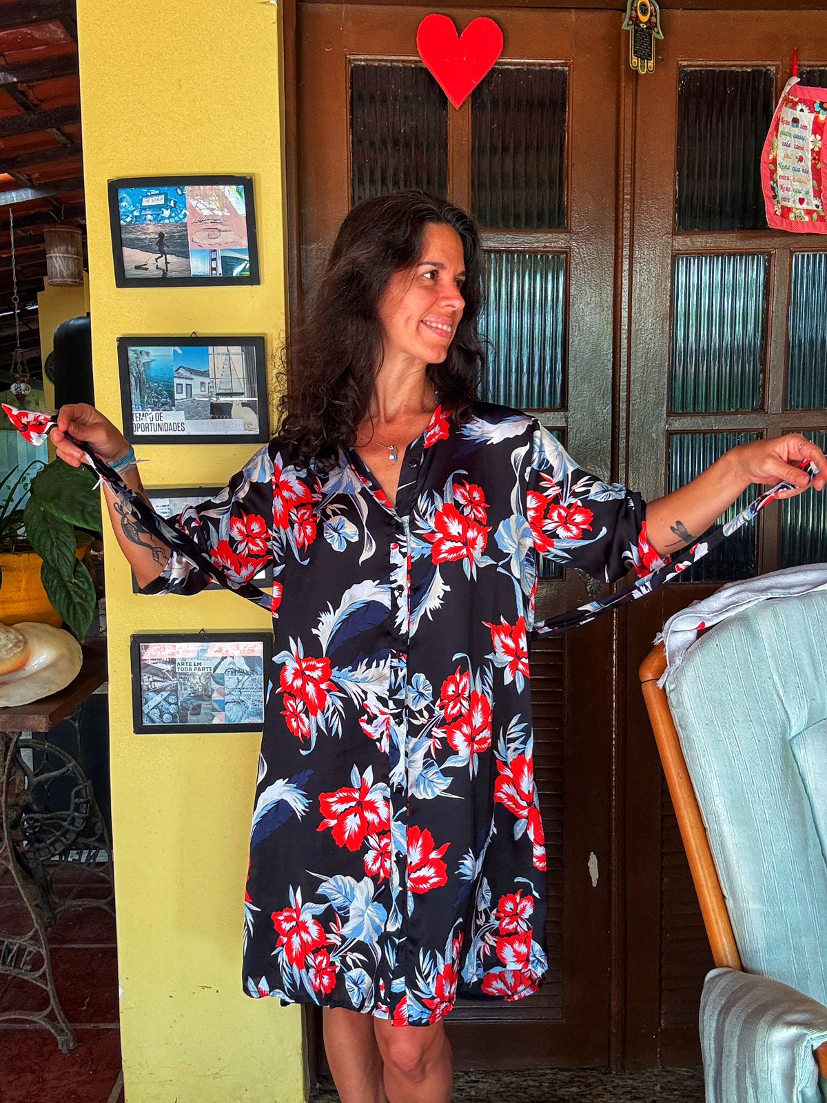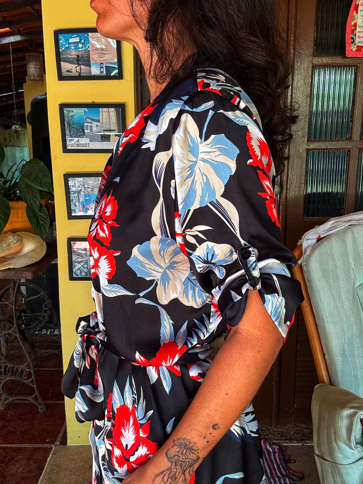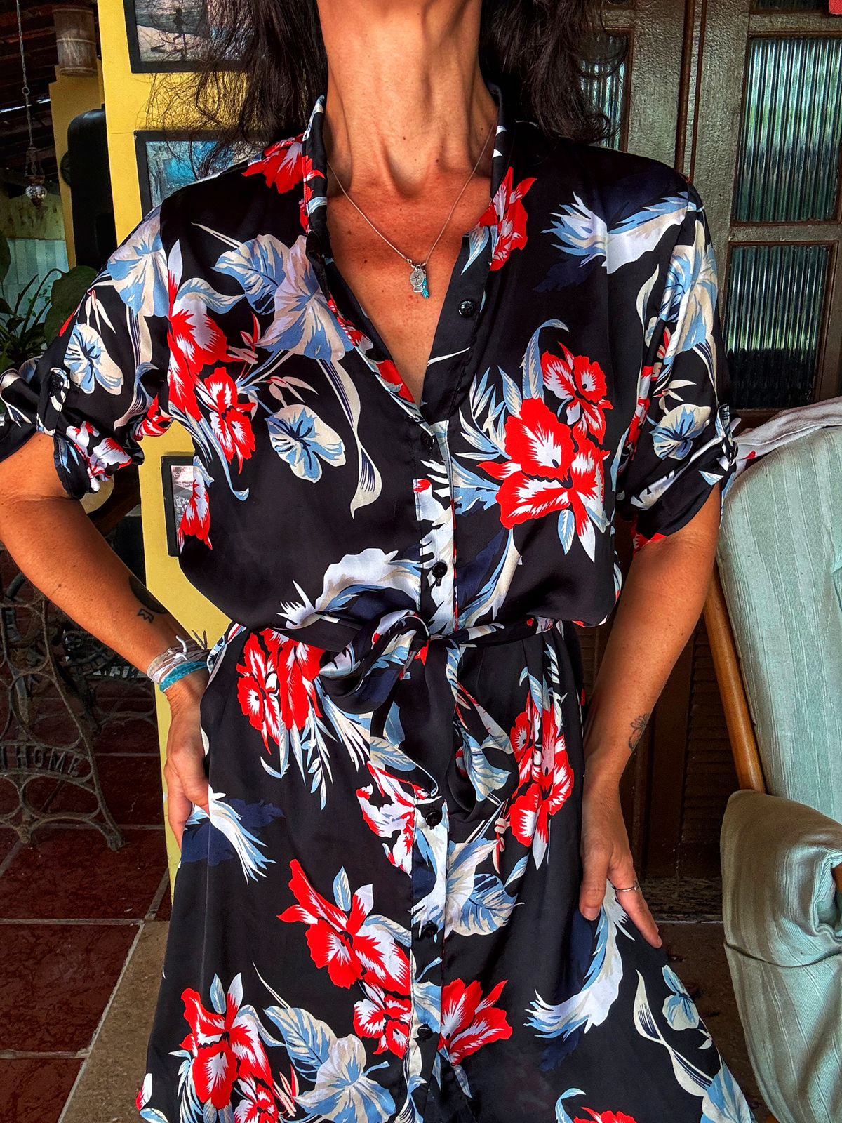 Cheio de vivacidade, este vestido chemise curto em fundo preto destaca-se pela estampa de flores tropicais em vermelho e azul. Com botões frontais e amarração na cintura, é a peça ideal para um visual fresco e elegante.