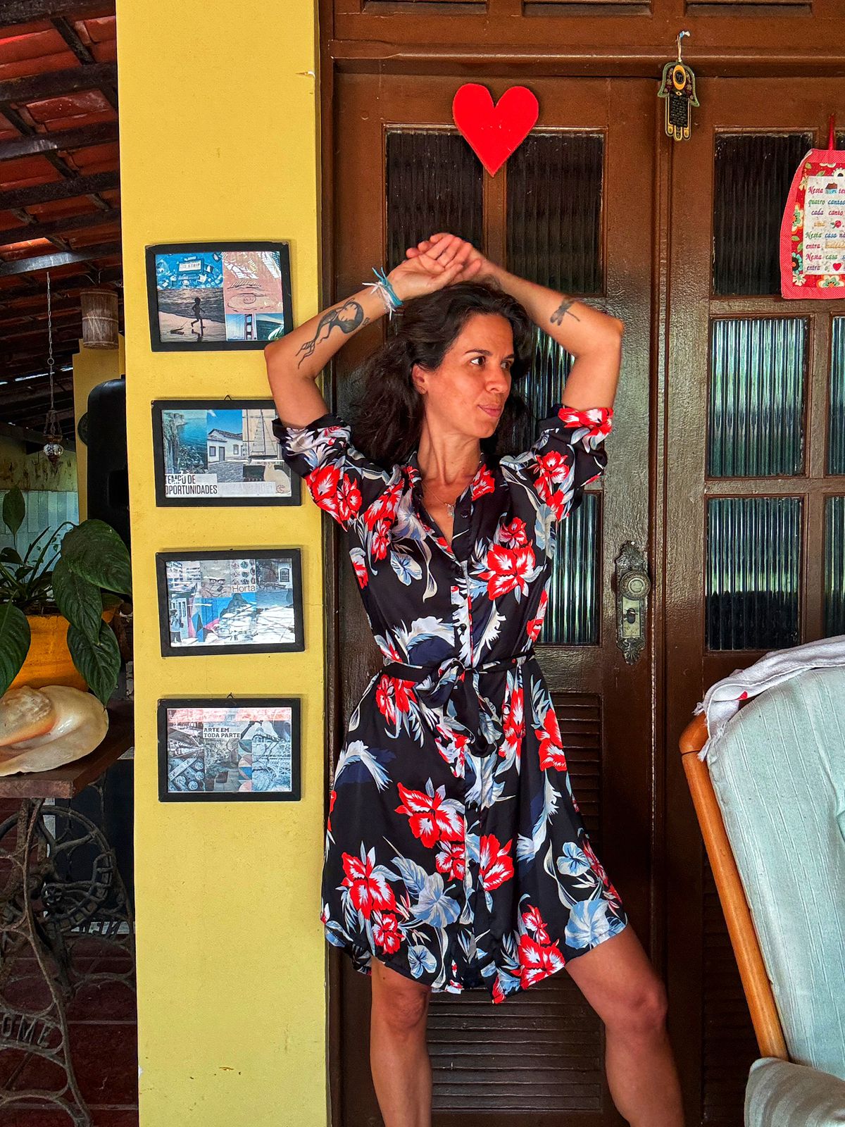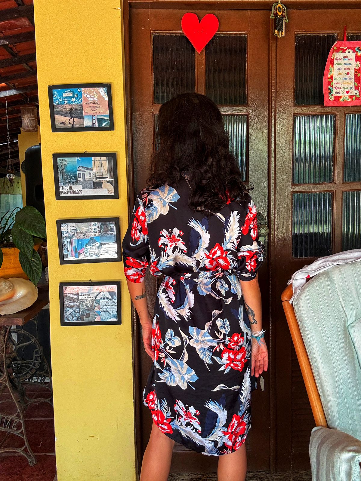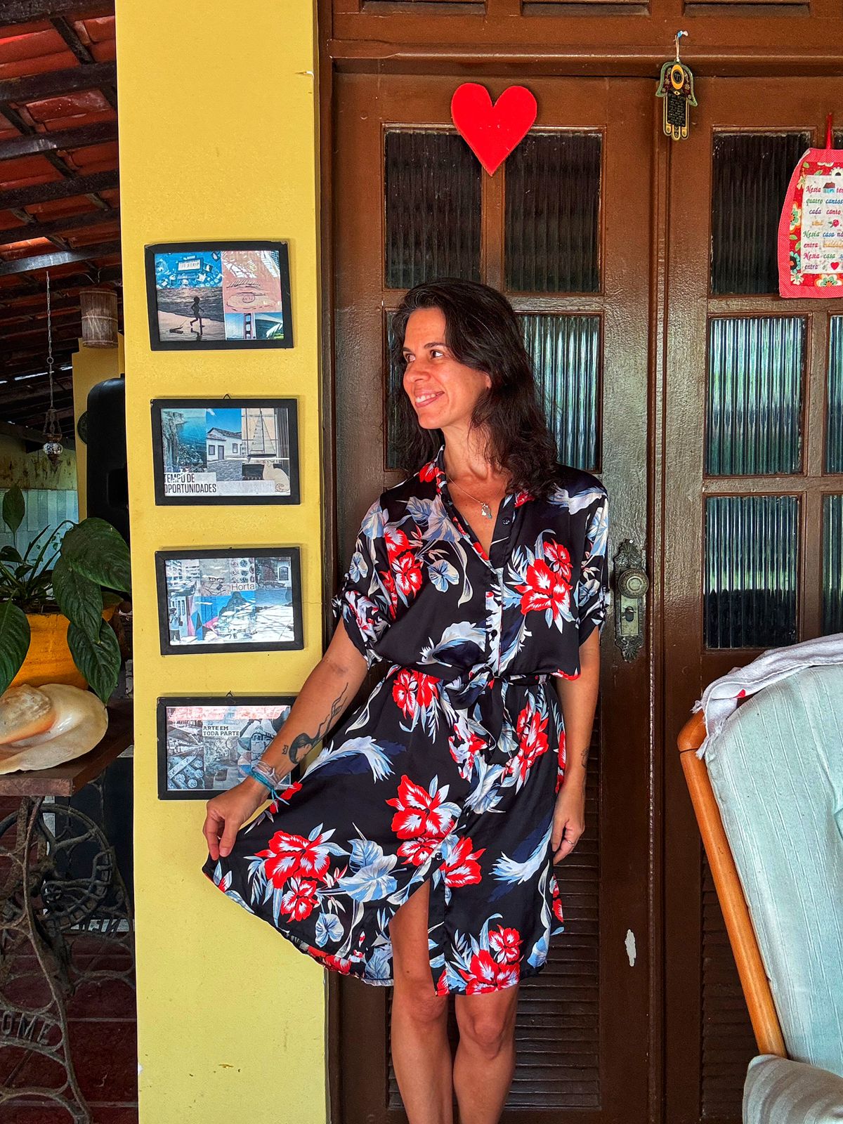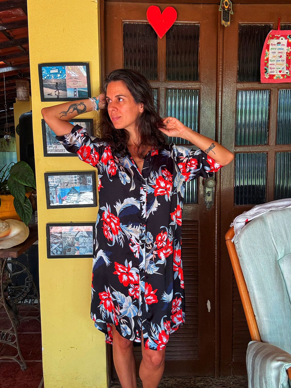 Cheio de vivacidade, este vestido chemise curto em fundo preto destaca-se pela estampa de flores tropicais em vermelho e azul. Com botões frontais e amarração na cintura, é a peça ideal para um visual fresco e elegante.
