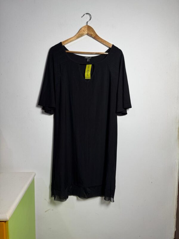 Vestido Zinzane preto em malha canelada de caimento fluido e toque suave, com detalhe keyhole no decote e barra de tule delicada. Perfeito para um look elegante e versátil que transita do casual ao sofisticado.