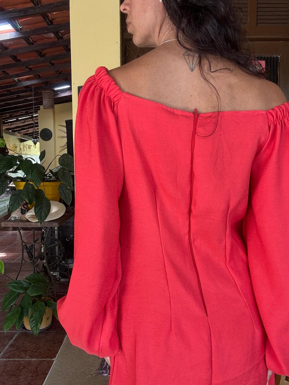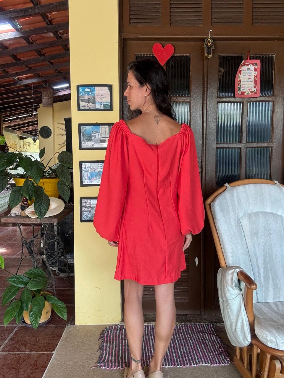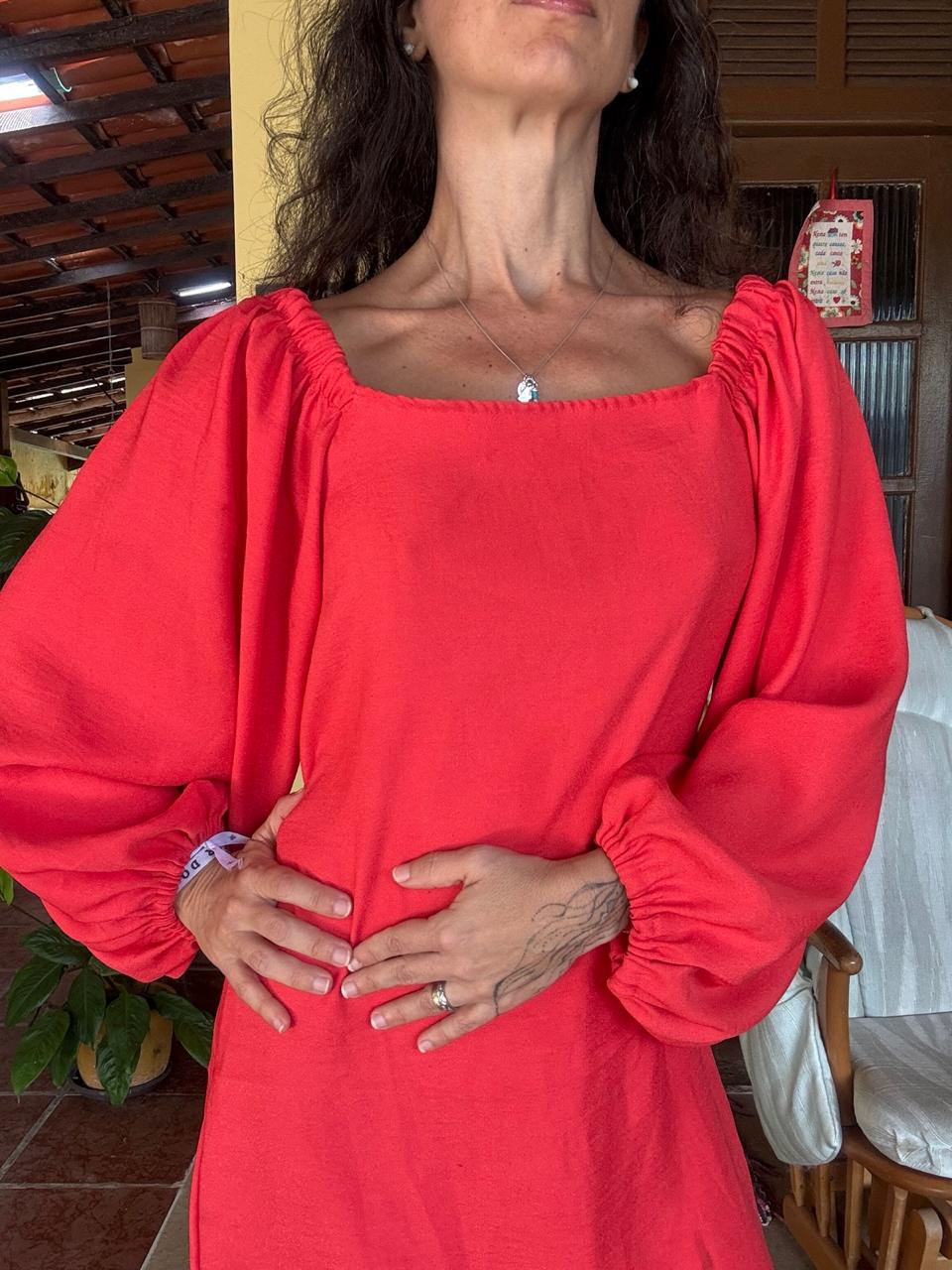 Vestido mini na cor coral vibrante com decote quadrado/ombro a ombro e mangas bufantes longas, uma peça romântica e despojada para adicionar cor e volume ao seu look casual.