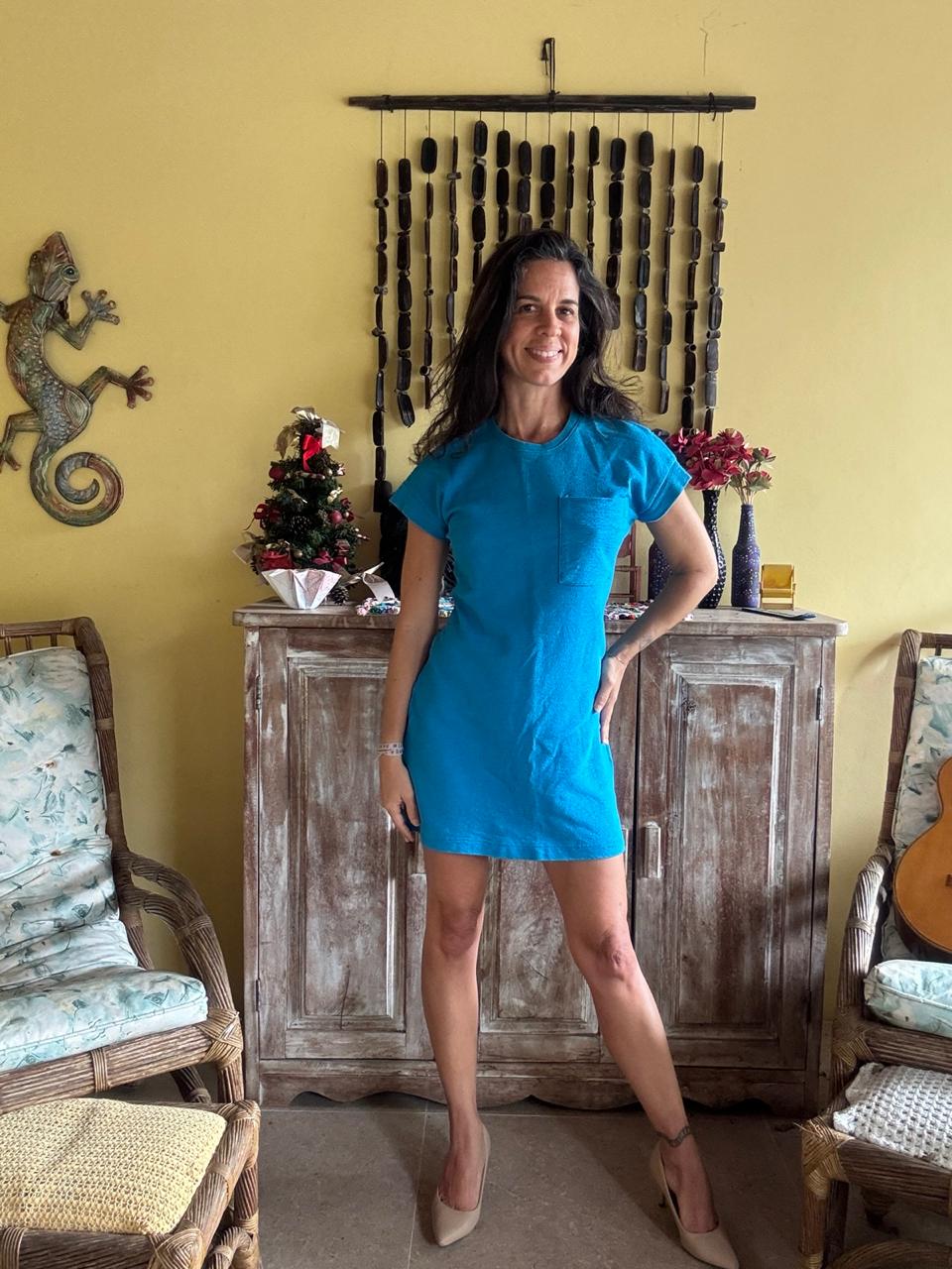 Vestido confeccionado em malha de algodão com textura granulada que apresenta modelagem reta e mangas curtas dobradas. Esta peça exibe um tom azul vibrante e bolso único no busto.