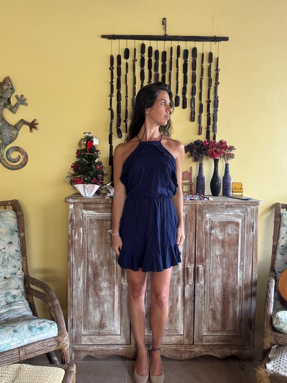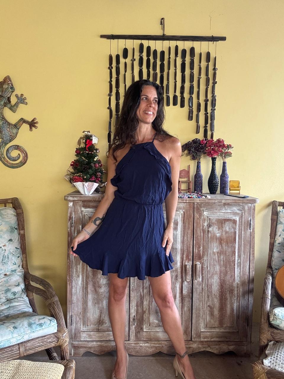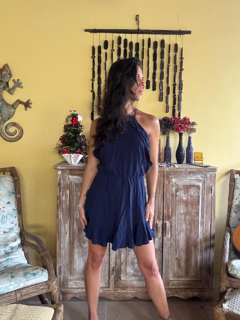 Vestido de comprimento curto com decote frente única, elástico na cintura e babados na barra. Apresenta abertura nas costas com fechamento por amarração, sendo uma escolha versátil para eventos sociais ou passeios noturnos.