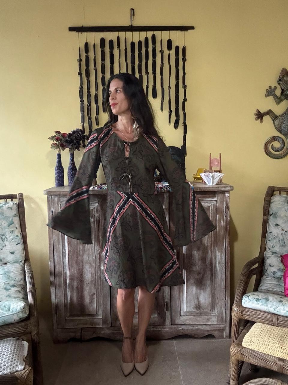 Vestido de comprimento curto em tom verde militar com estampa floral escura e mangas longas amplas no estilo flare. Apresenta decote com amarração e detalhes geométricos coloridos que trazem um ar étnico para produções casuais ou festivais.