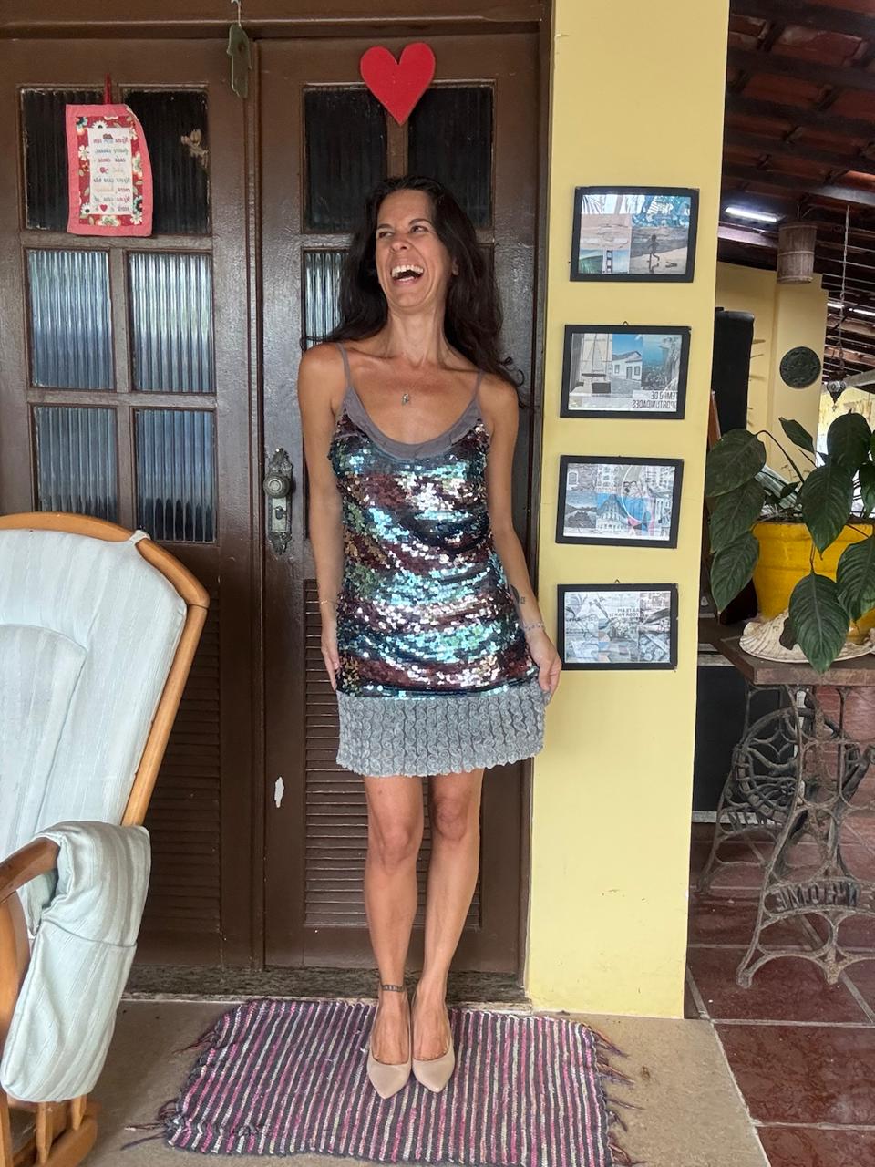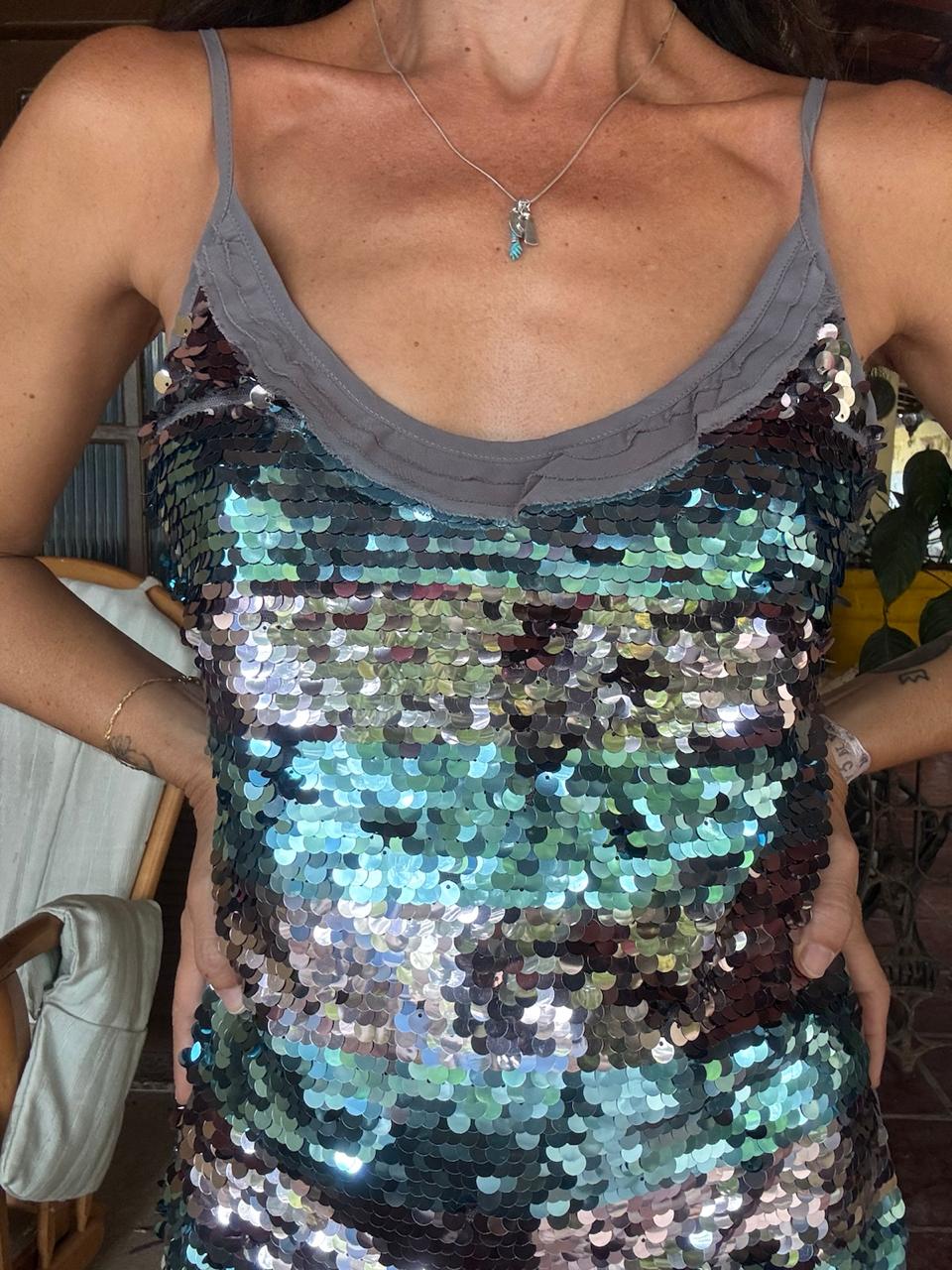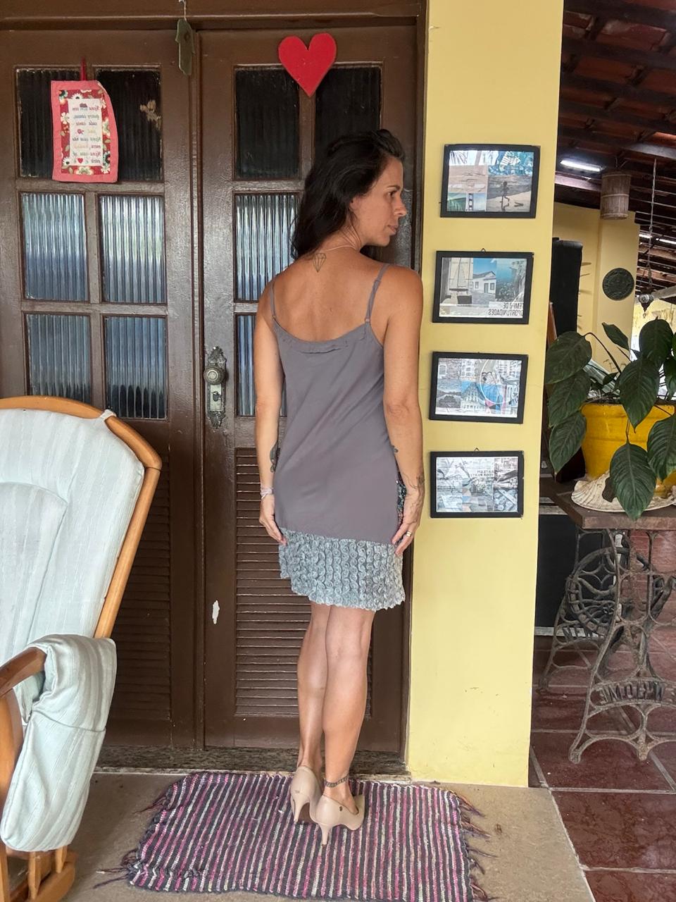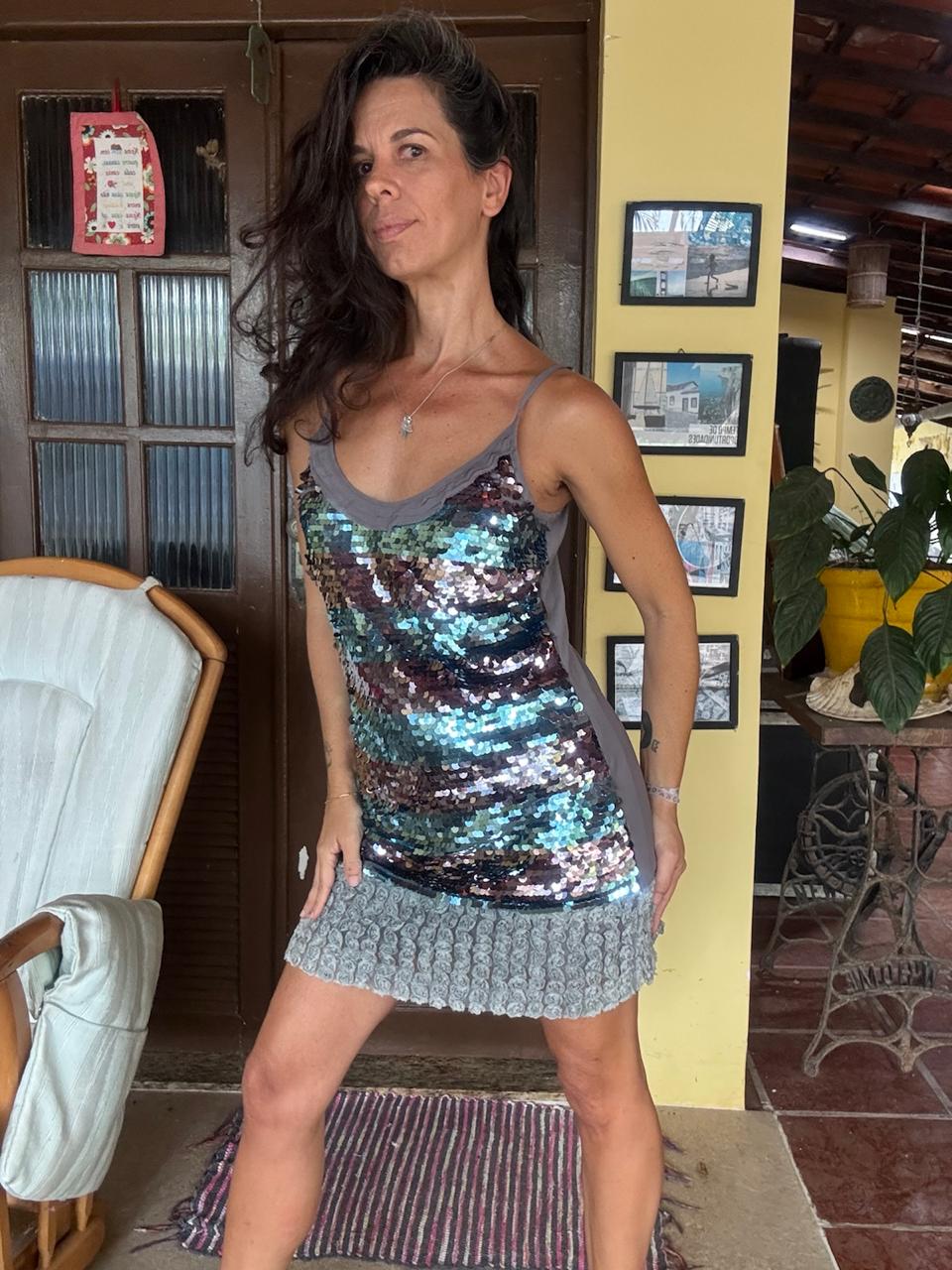 Vestido de alças finas com frente bordada em brilhos furta-cor e barra texturizada cinza. Uma peça de caimento ajustado perfeita para eventos noturnos ou festas.