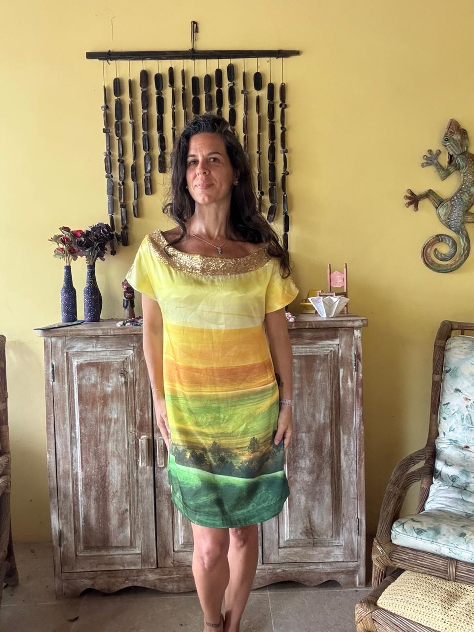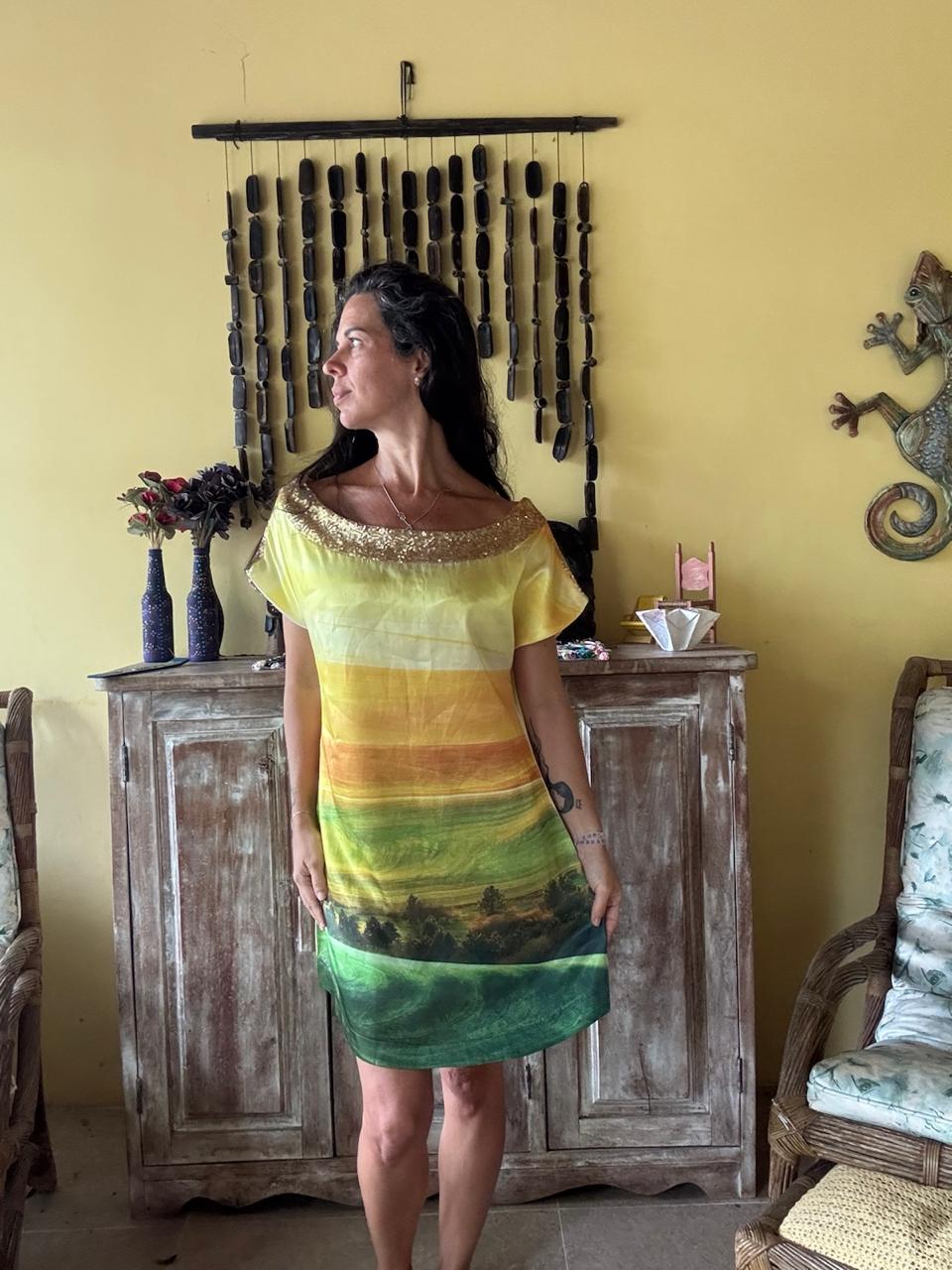 Vestido de modelagem reta com estampa de paisagem em tons verde e amarelo e detalhe de brilho no decote canoa. Uma peça vibrante ideal para eventos diurnos ou passeios de verão.