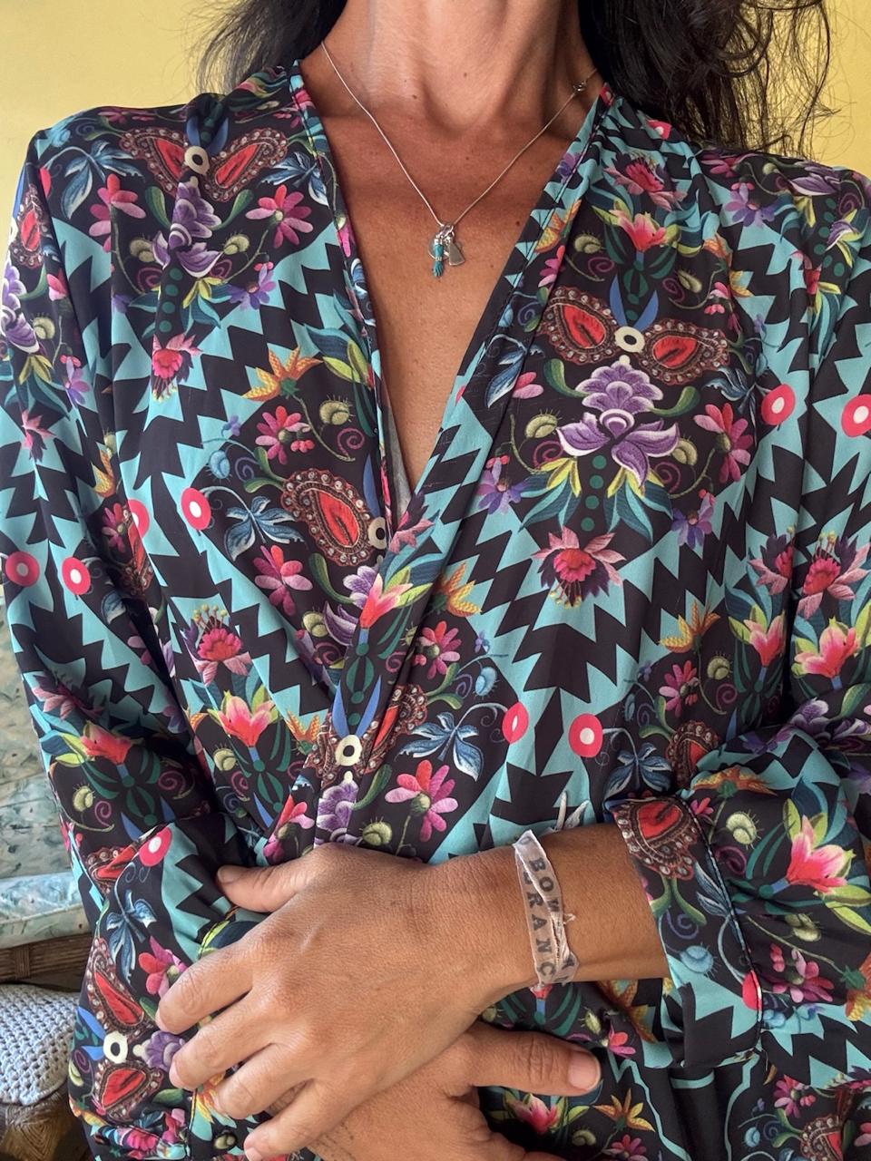 Vestido com decote em V transpassado e padronagem geométrica colorida sobre fundo escuro. Uma peça fluida de comprimento acima do joelho, perfeita para eventos sociais ou passeios diurnos.
