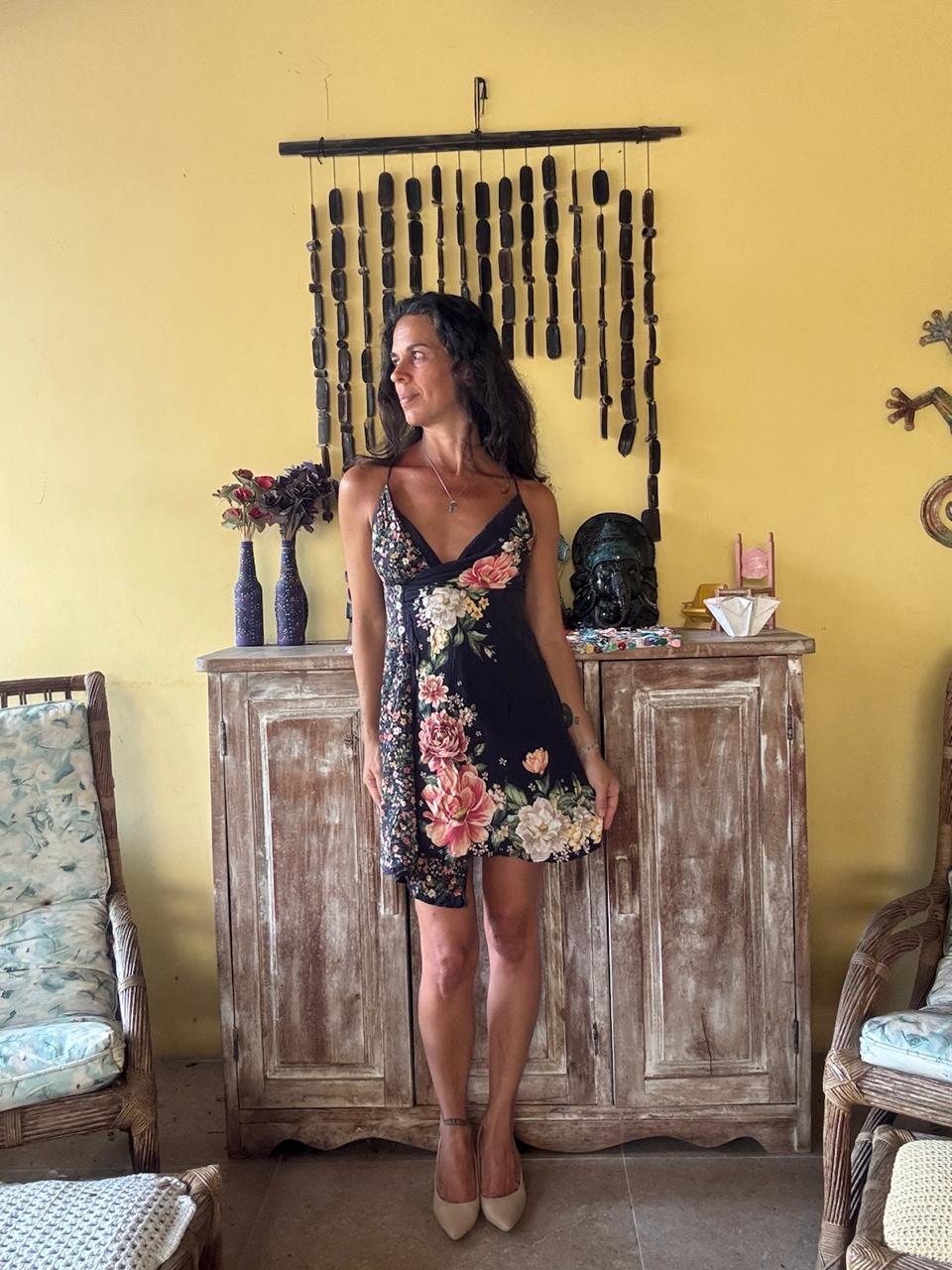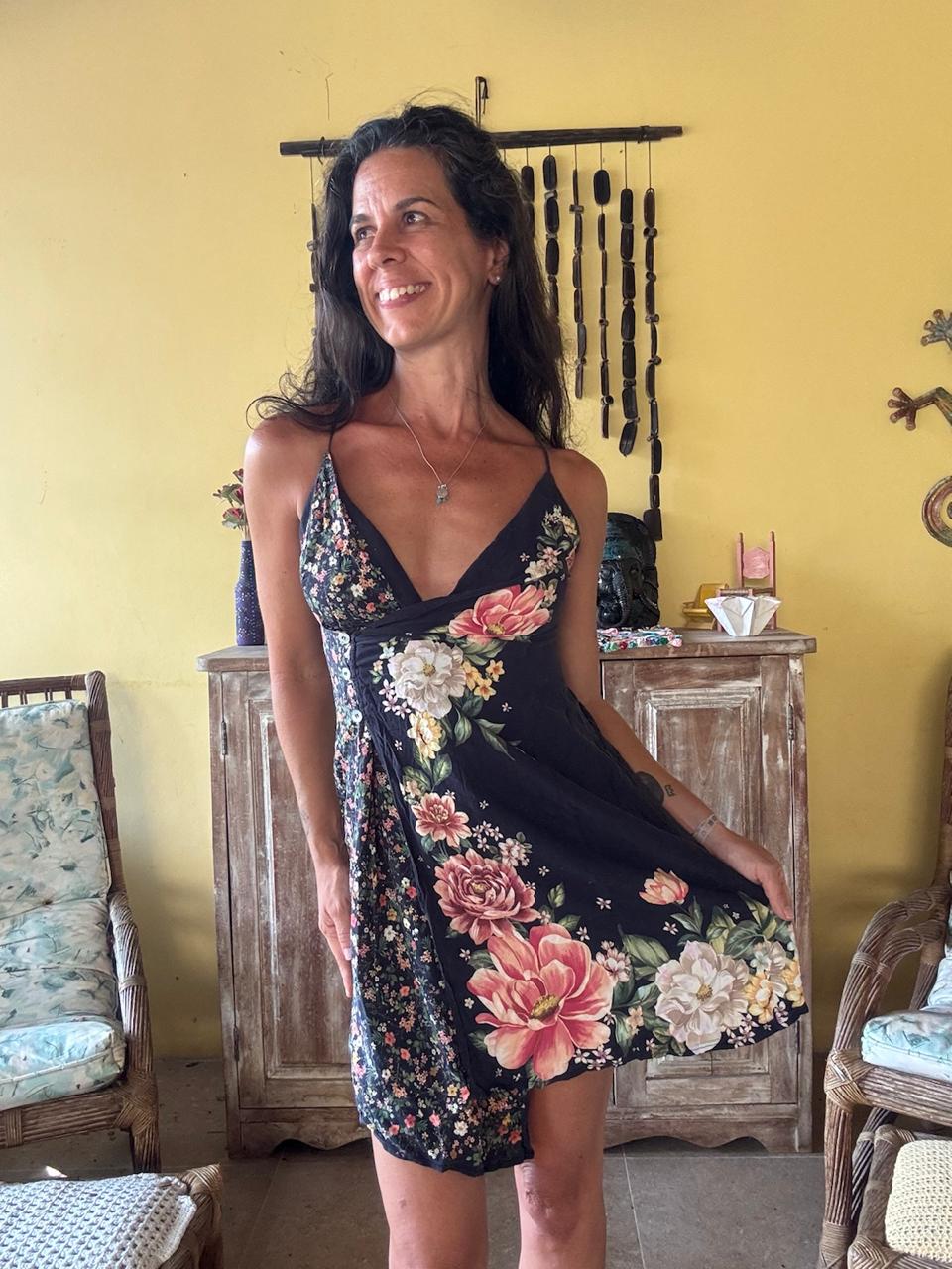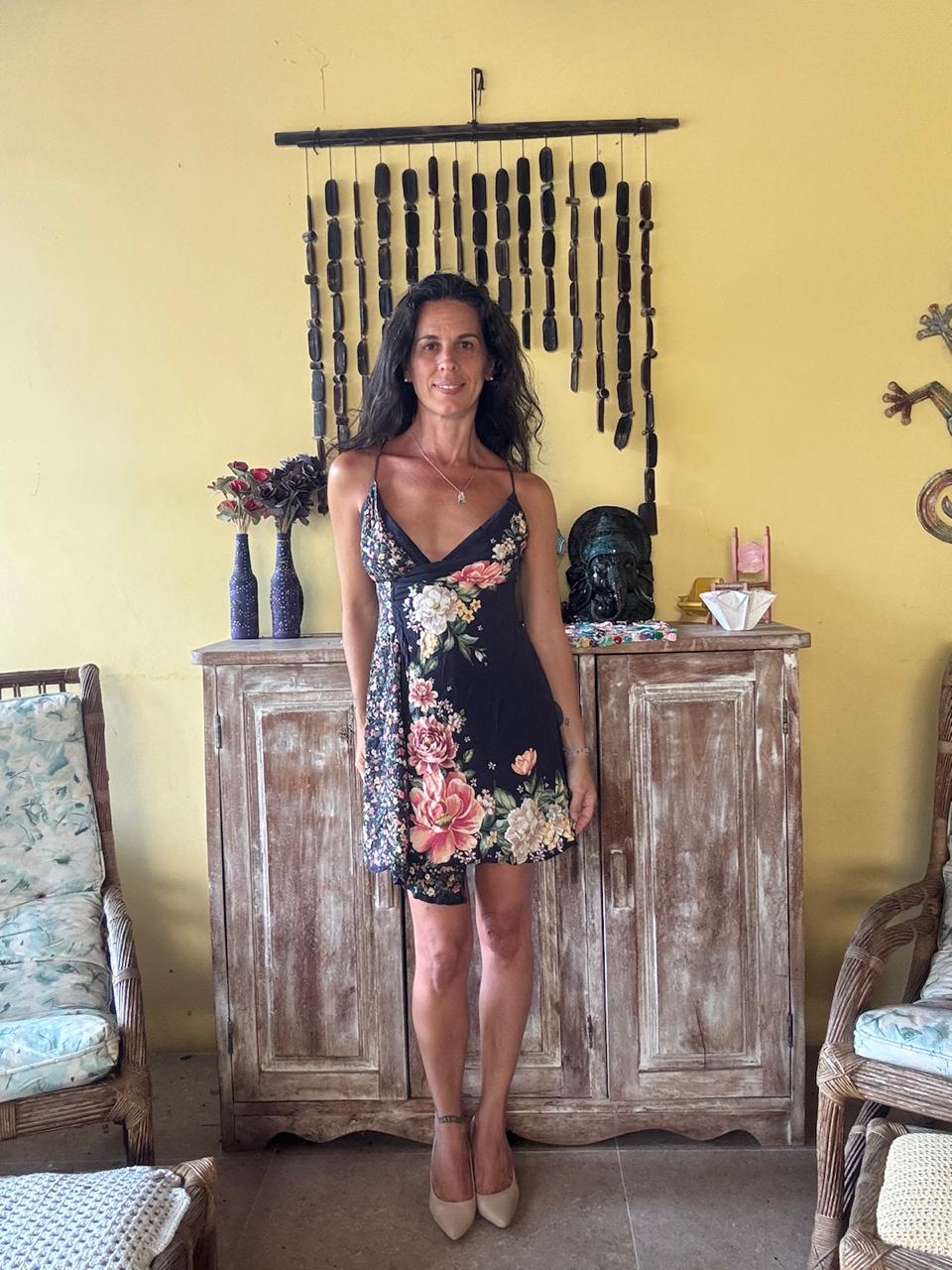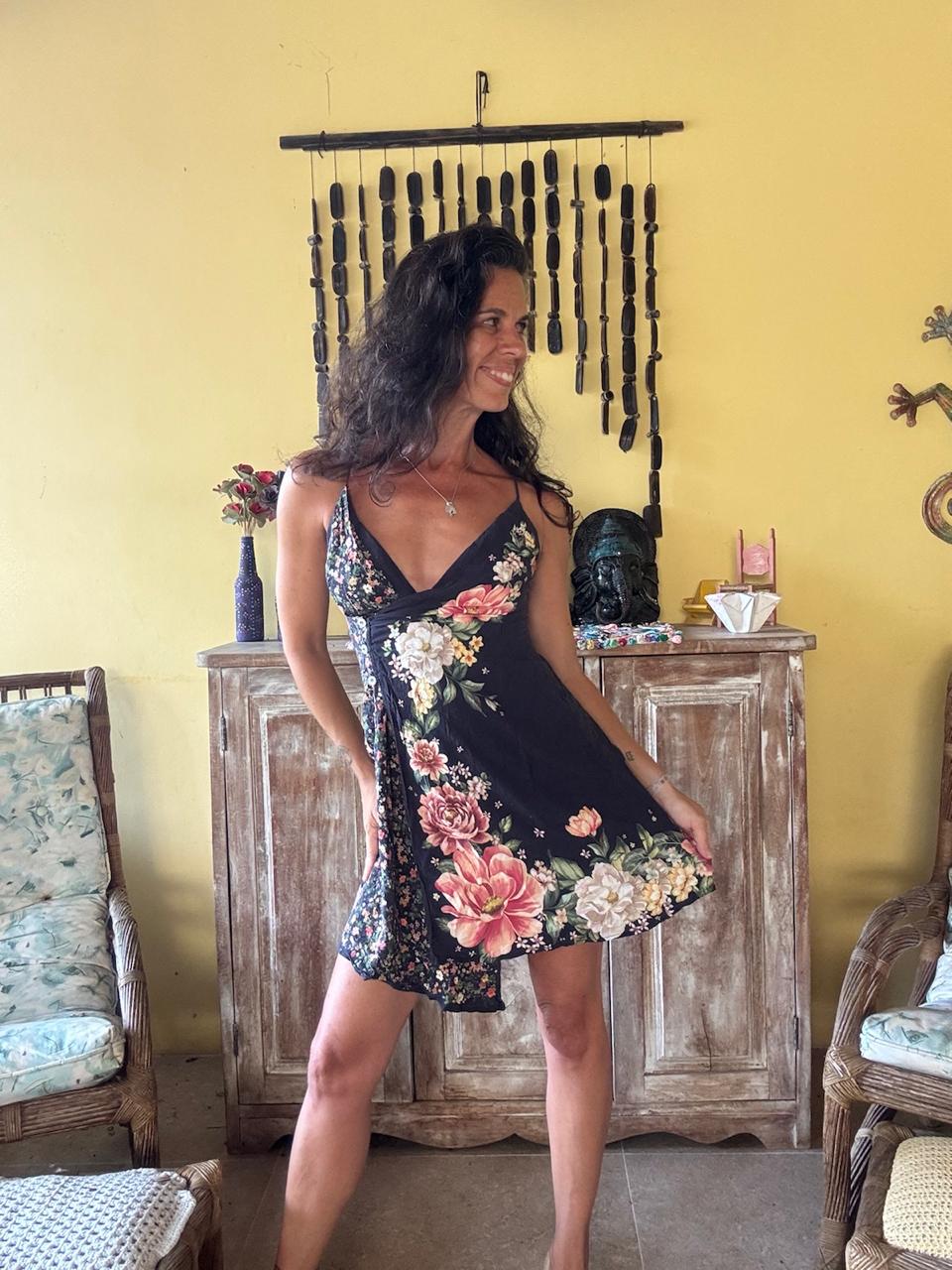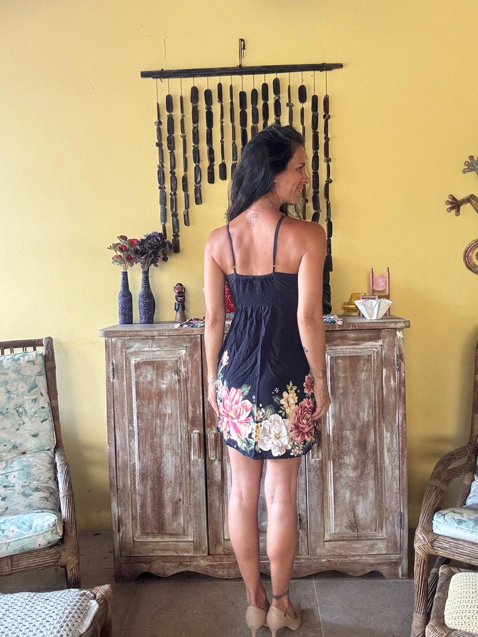 Vestido curto de fundo escuro com estampa floral colorida e decote em V. A peça possui caimento leve e alças finas, sendo ideal para um look casual de verão.