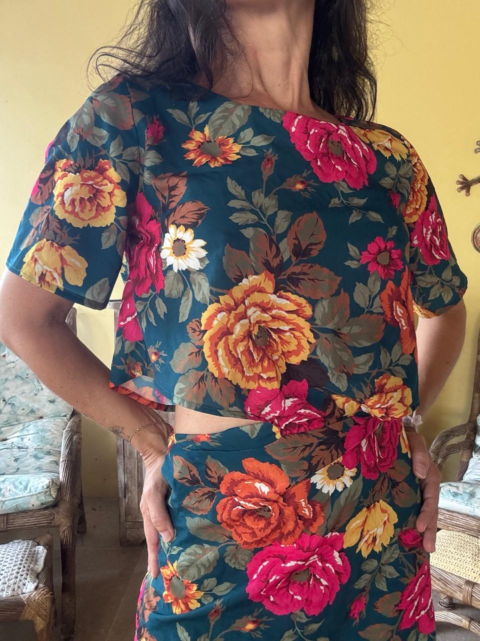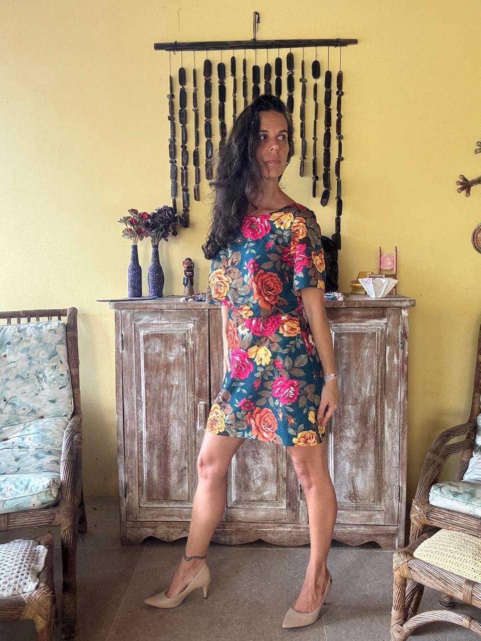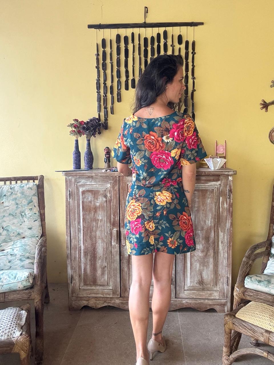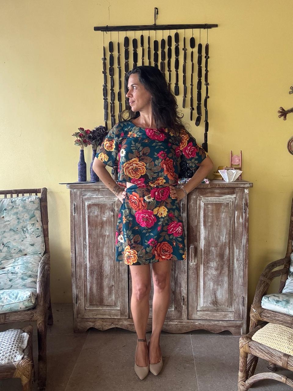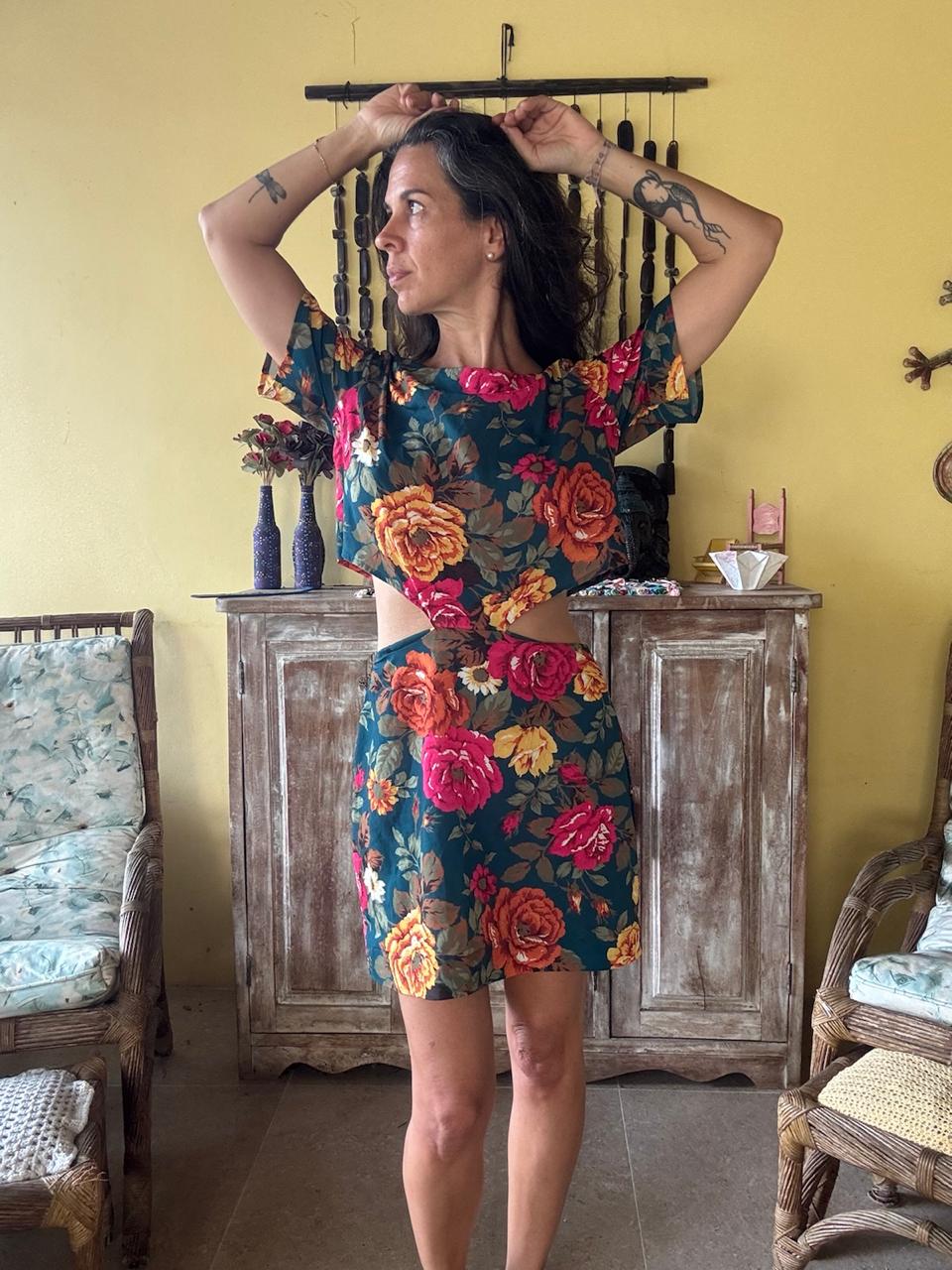 Vestido curto com estampa floral colorida, mangas curtas e detalhe vazado na cintura. Uma peça leve e vibrante, perfeita para eventos diurnos ou passeios ao ar livre.