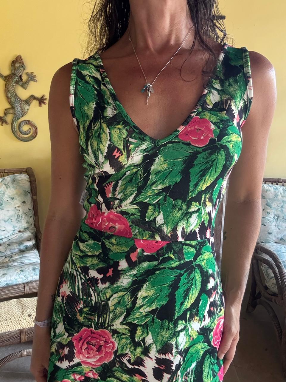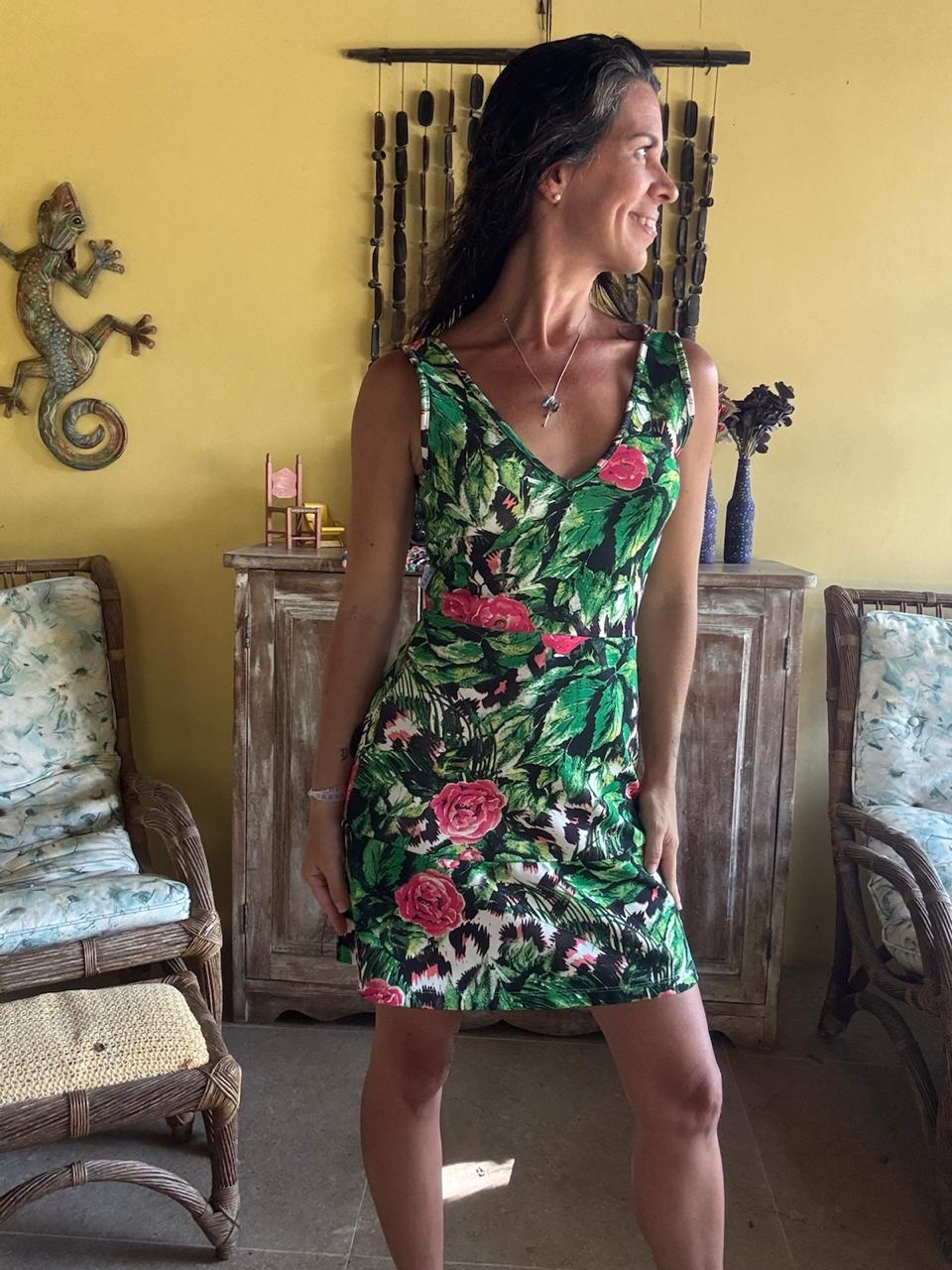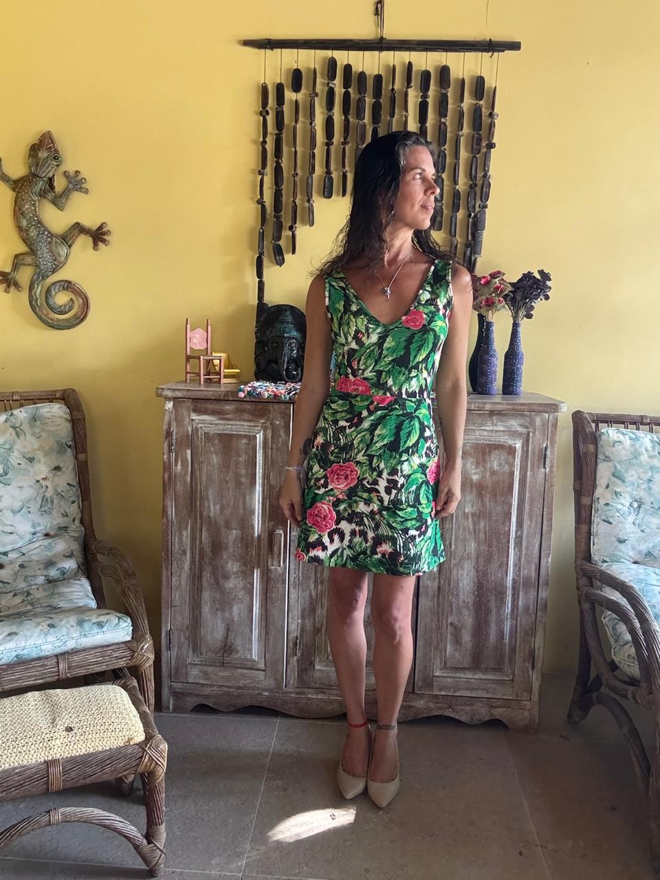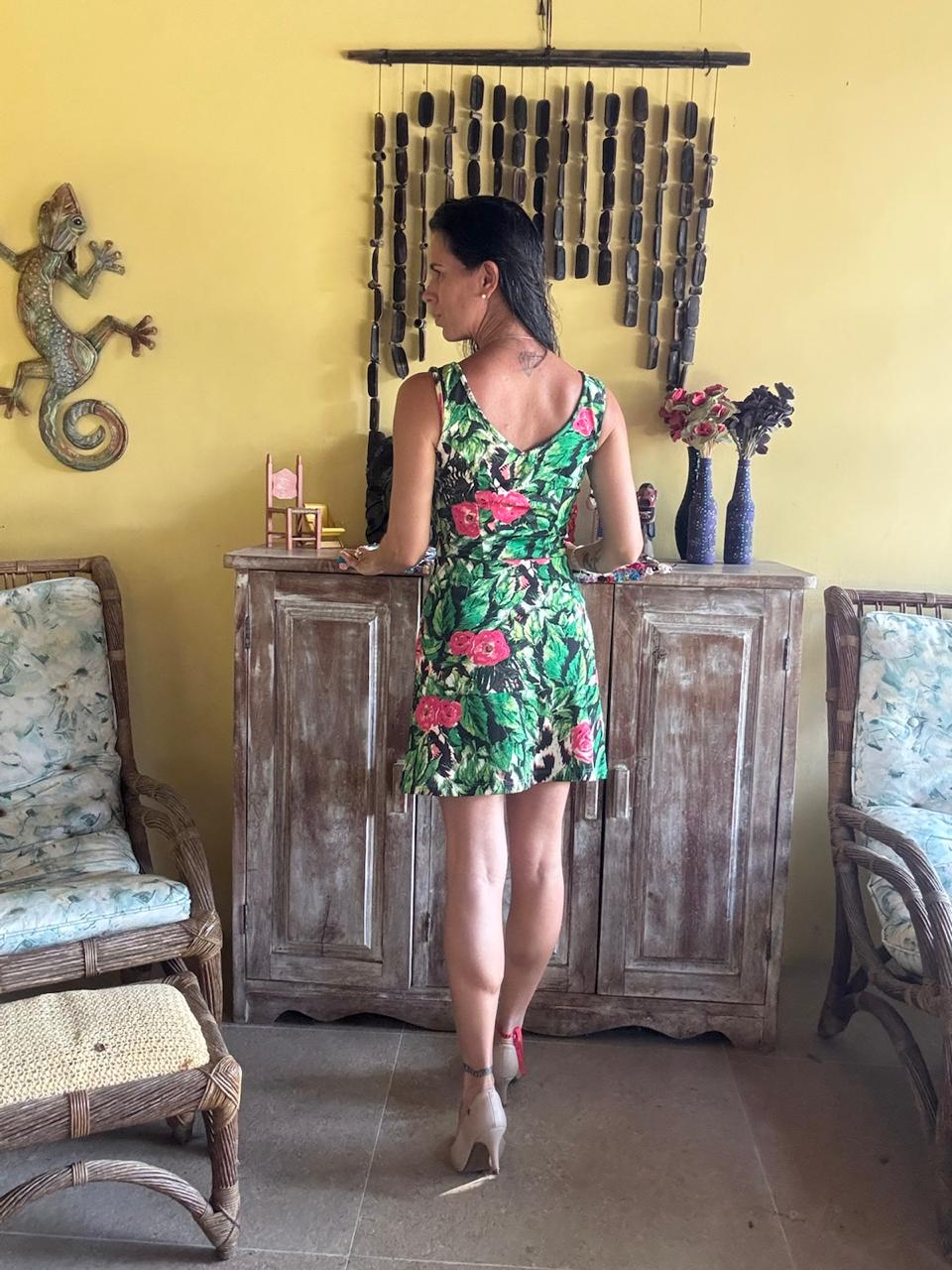 Vestido com comprimento acima do joelho, decote em V na frente e nas costas, sem mangas. Apresenta estampa vibrante de folhagem verde e rosas cor-de-rosa, com cintura marcada e saia levemente rodada, ideal para um almoço casual ou passeio à tarde.