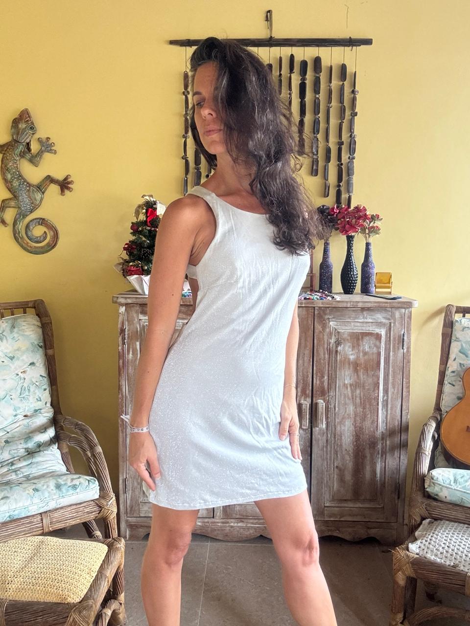 Vestido com decote redondo, acabamento cintilante e abertura profunda nas costas com detalhe cruzado. Peça de caimento ajustado perfeita para festas e eventos noturnos.
