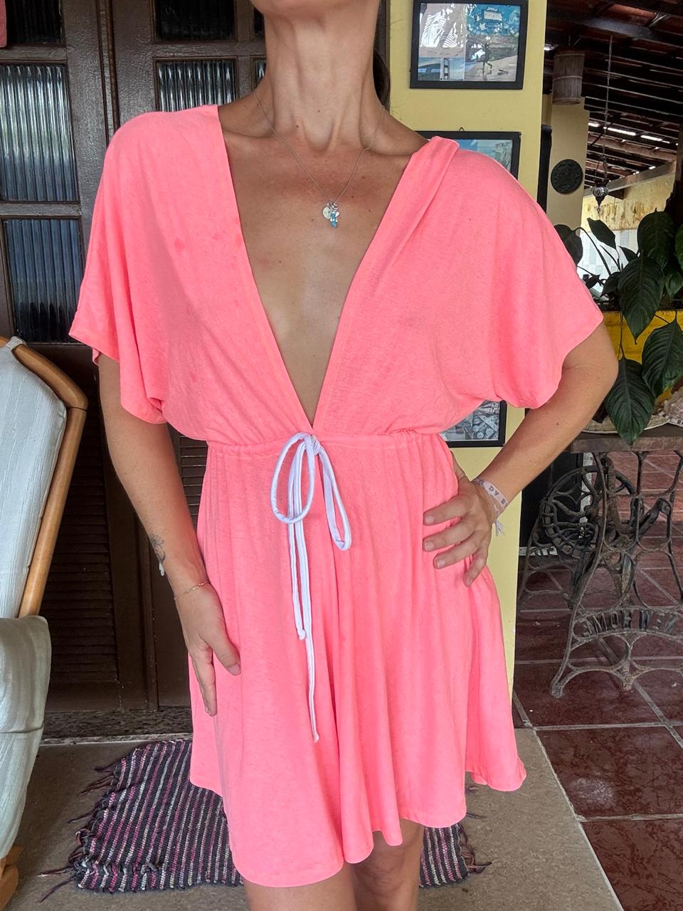 Vestido Curto Rosa Neon Decote Profundo – Maria Clara – tam P