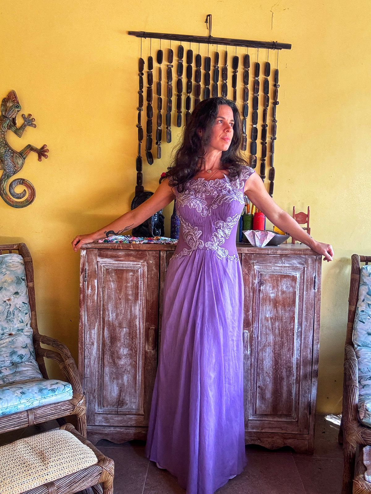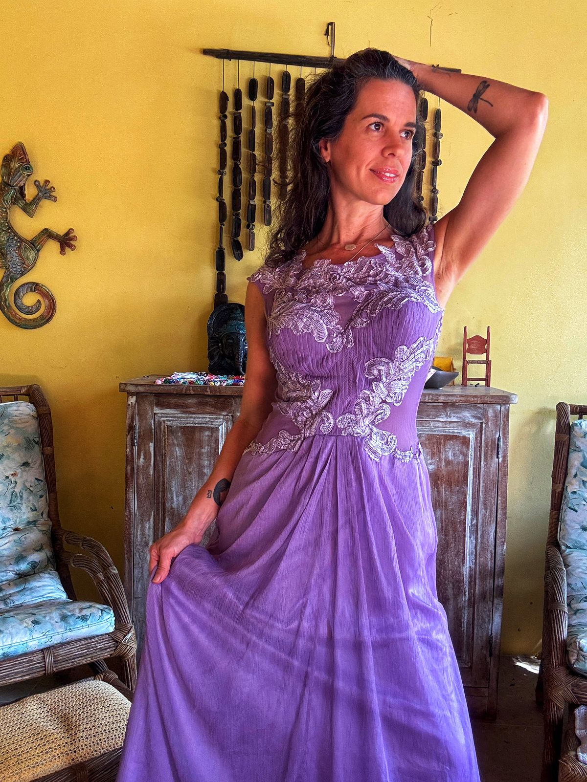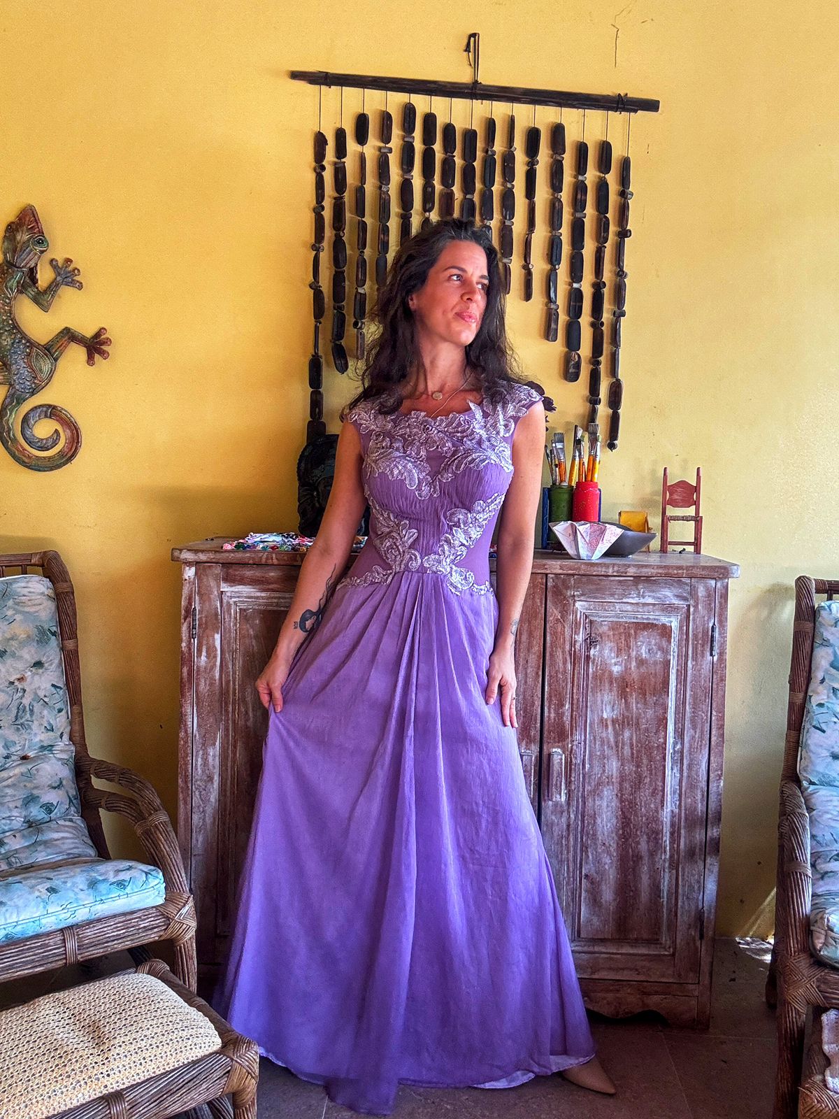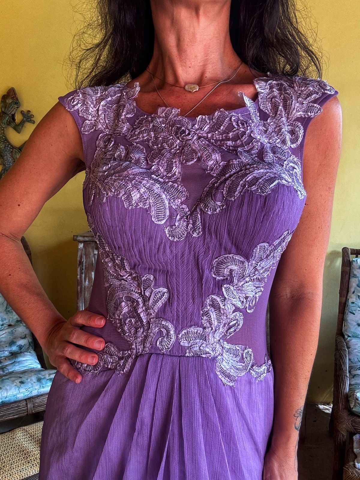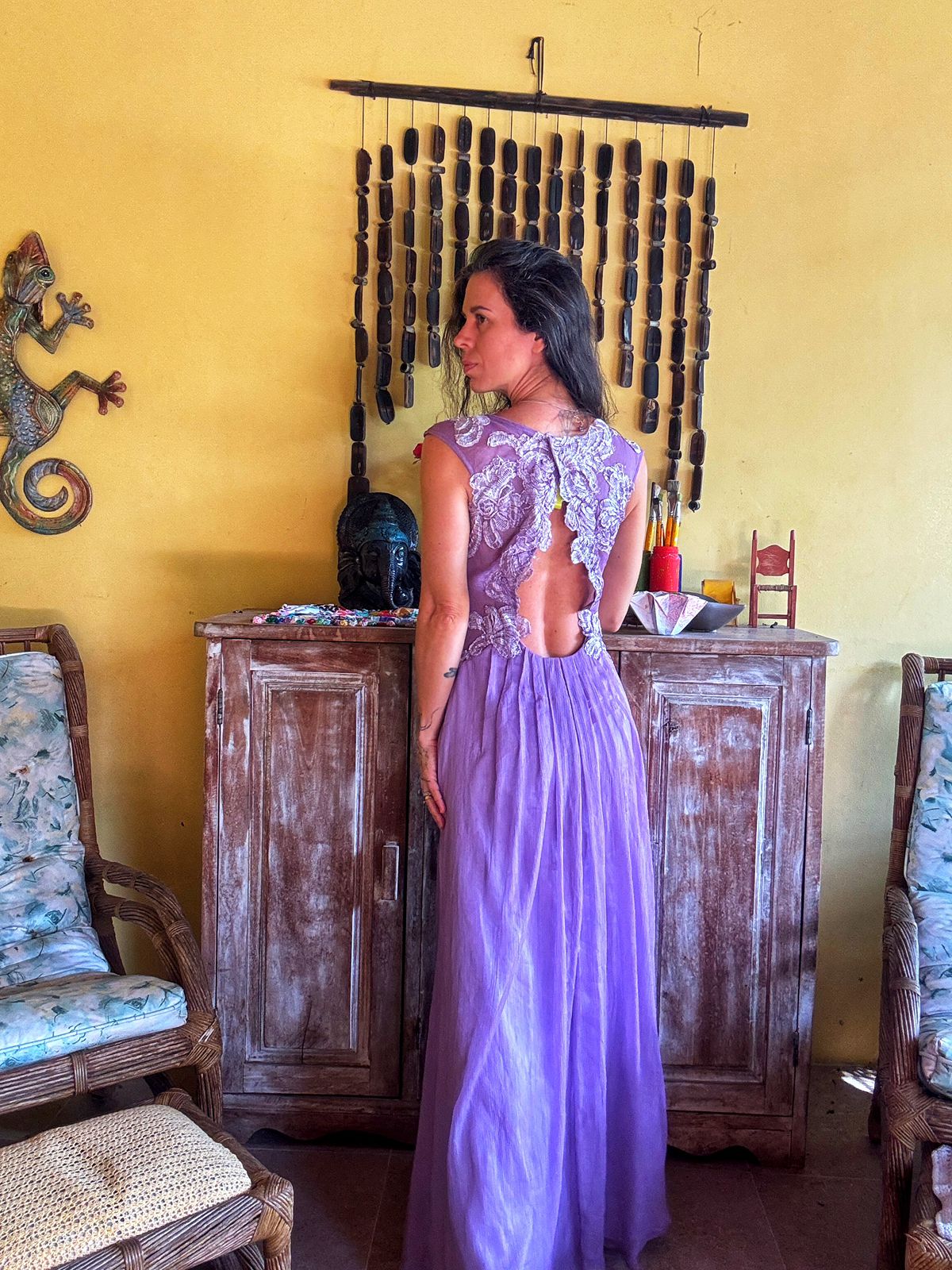 Vestido Longo de Festa Lilás/Lavanda: Corpete estruturado com bordado floral branco e costas abertas em ‘V’ para um visual glamouroso e inesquecível.