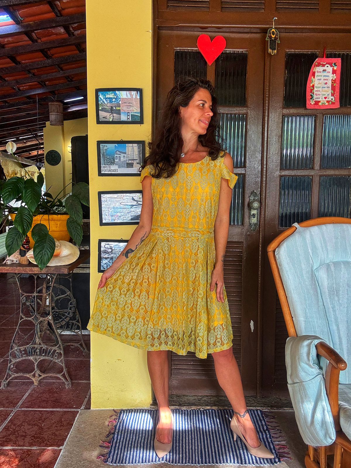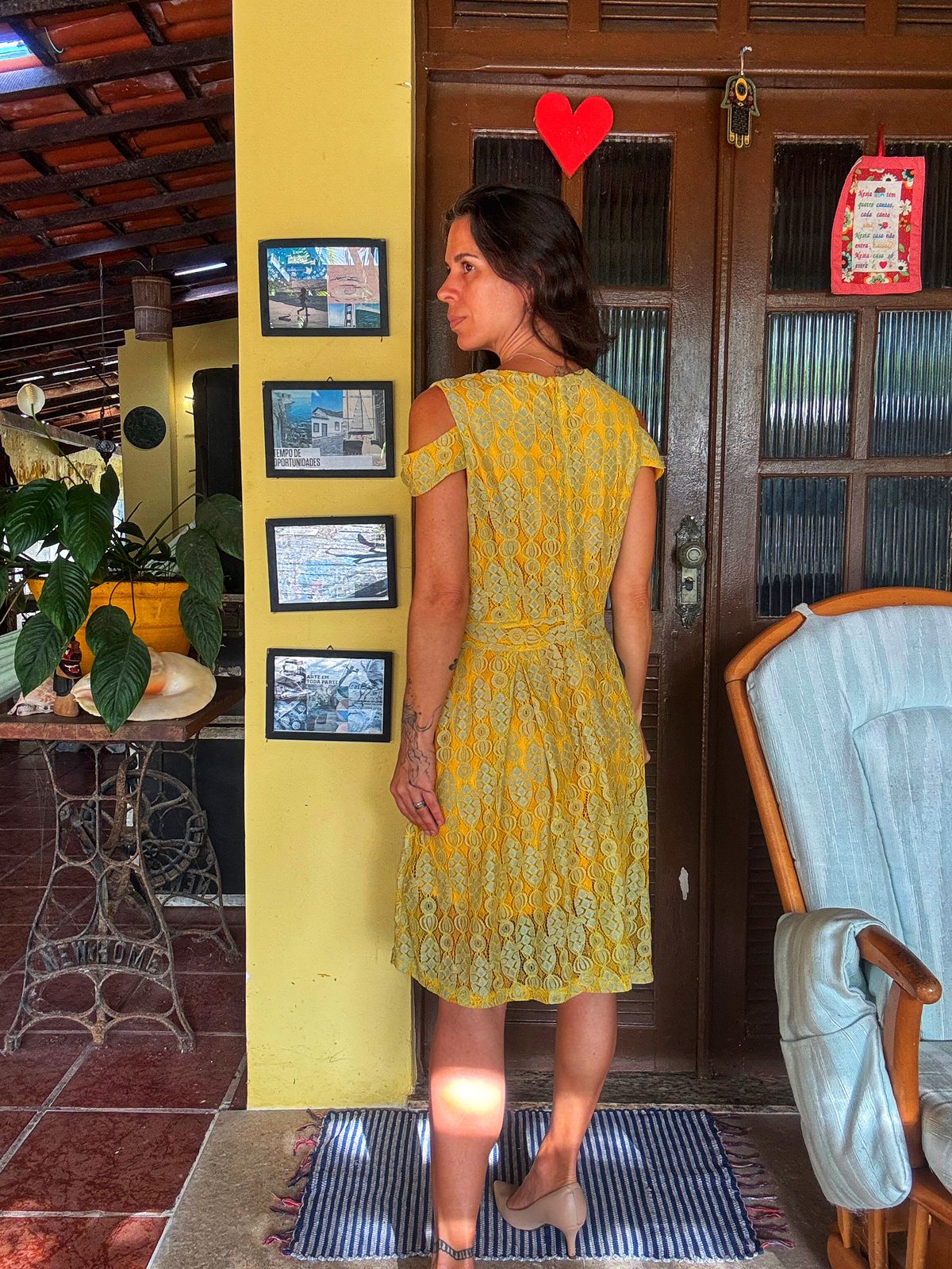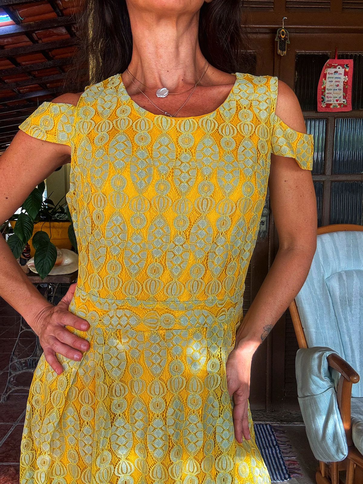 Vestido em renda amarela vibrante com detalhes em verde-água, corte evasê e decote cold shoulder (ombro vazado), combinando romantismo e modernidade. Uma peça única e delicada, perfeita para batizados, casamentos diurnos ou eventos que exijam um toque de cor e feminilidade vintage.
