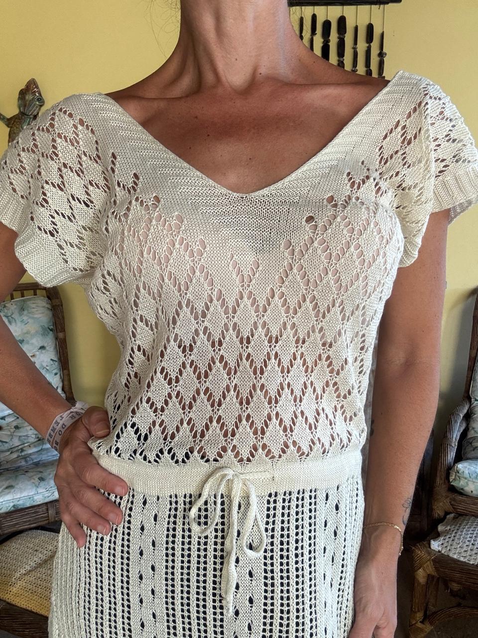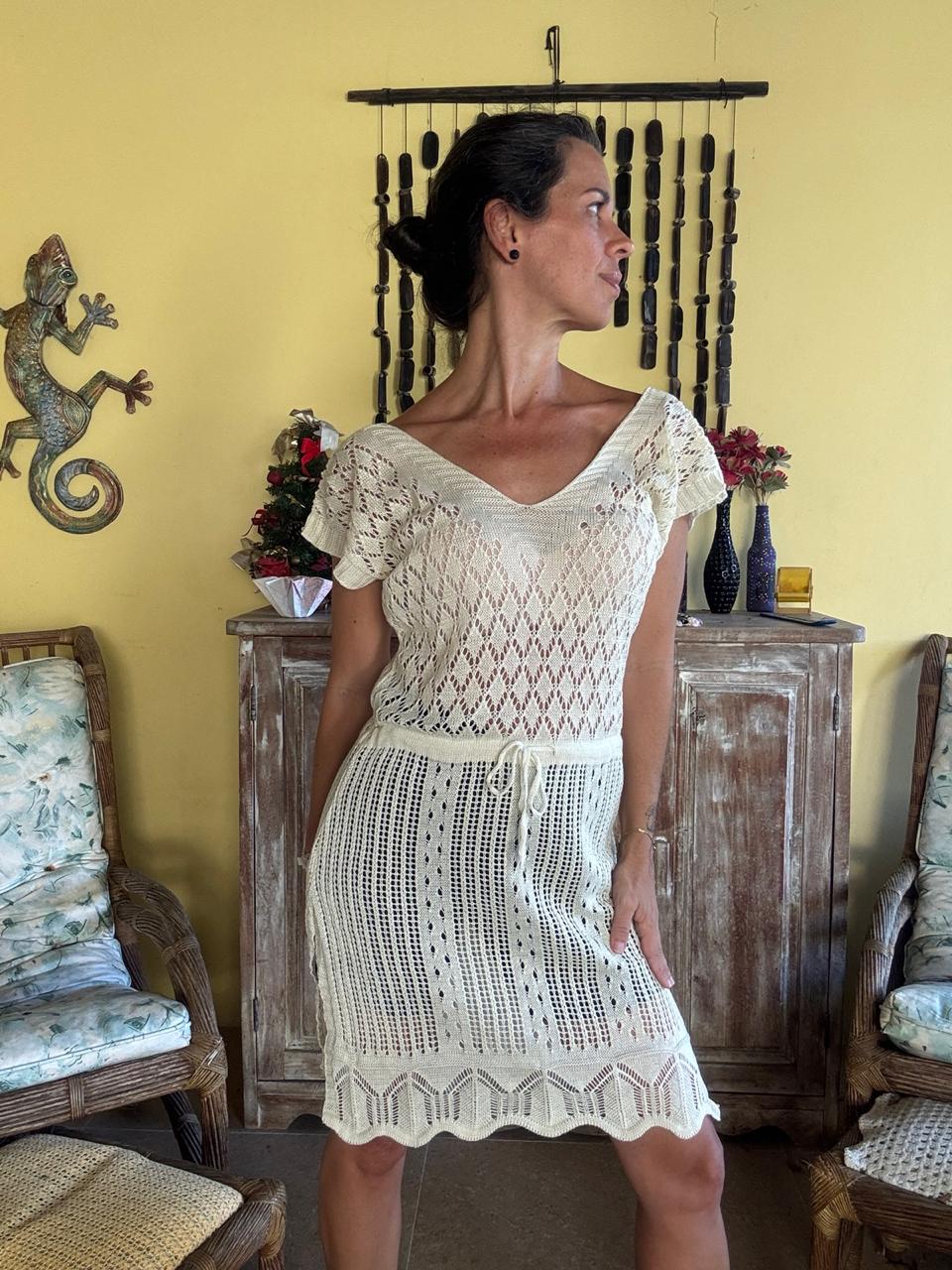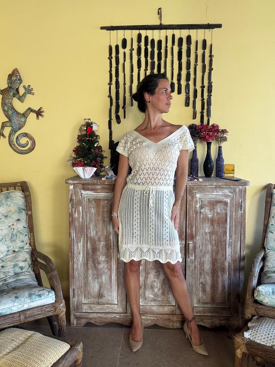 Vestido de tricô leve com decote em V e mangas morcego, apresentando ricos bordados em tons de bege/nude que formam padronagens geométricas nas laterais e ombros. O modelo possui um cordão fino para ajuste na linha da cintura, permitindo criar um efeito blusê delicado.