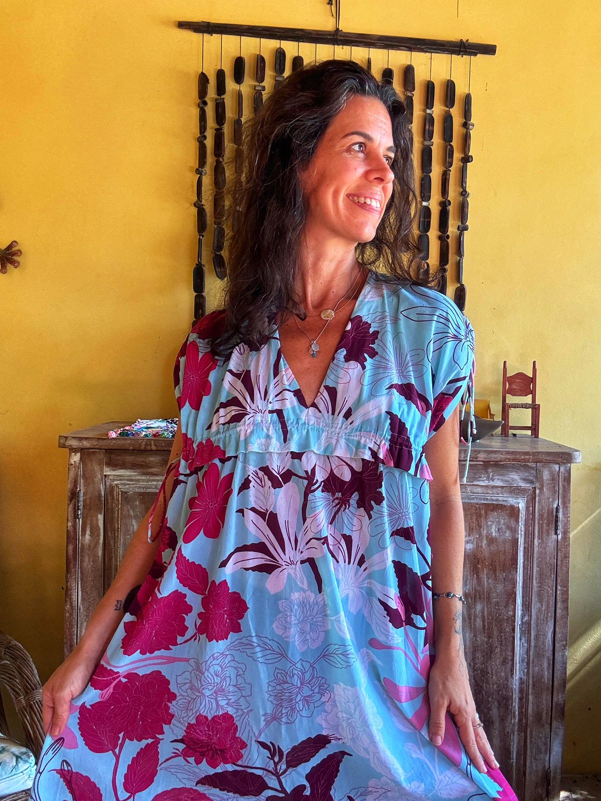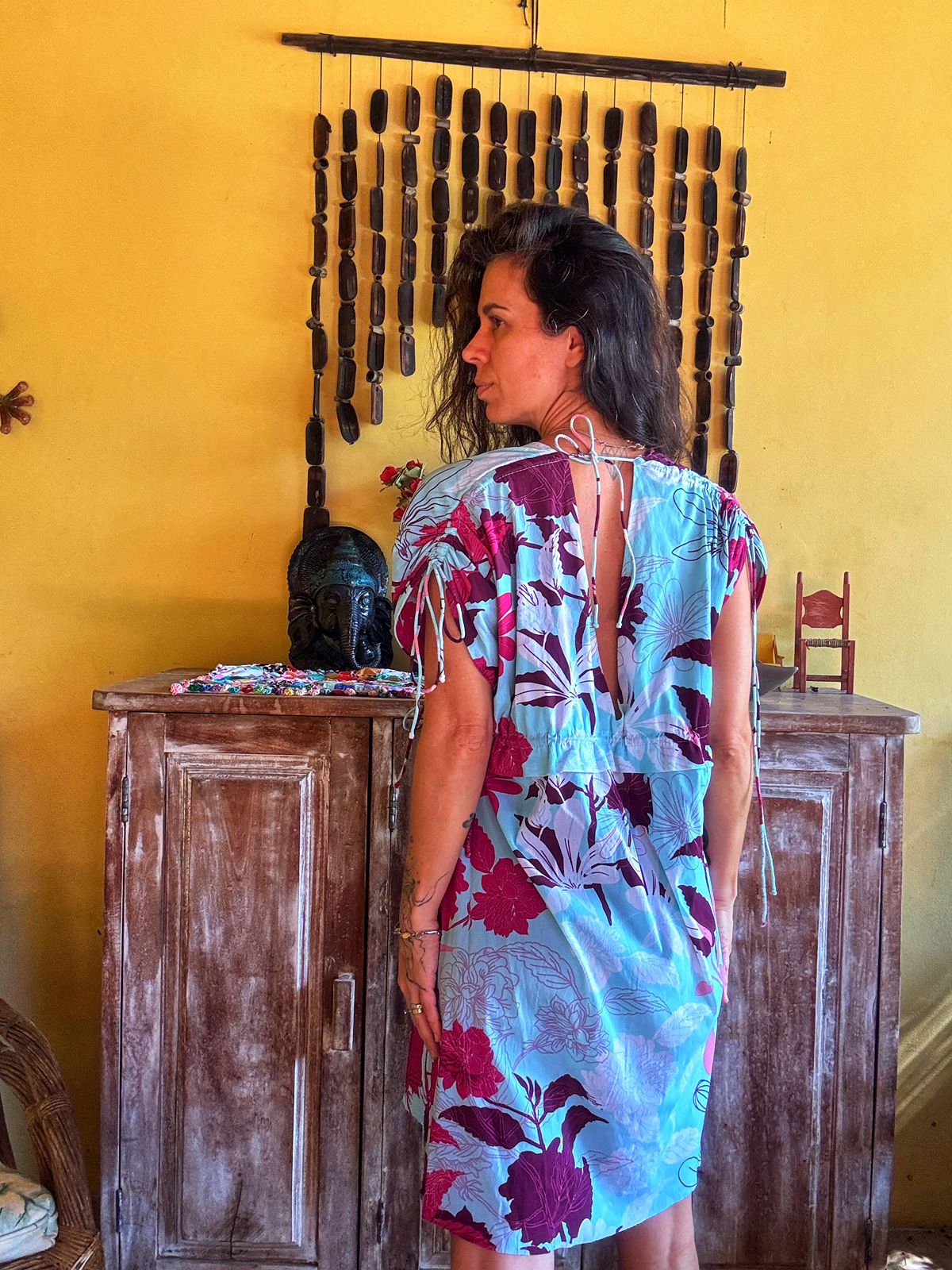 Vestido curto estampado floral em tons de azul e pink, modelo kaftan com decote V e amarração nas mangas/lateral. Peça leve e soltinha, perfeita para o verão e praia.