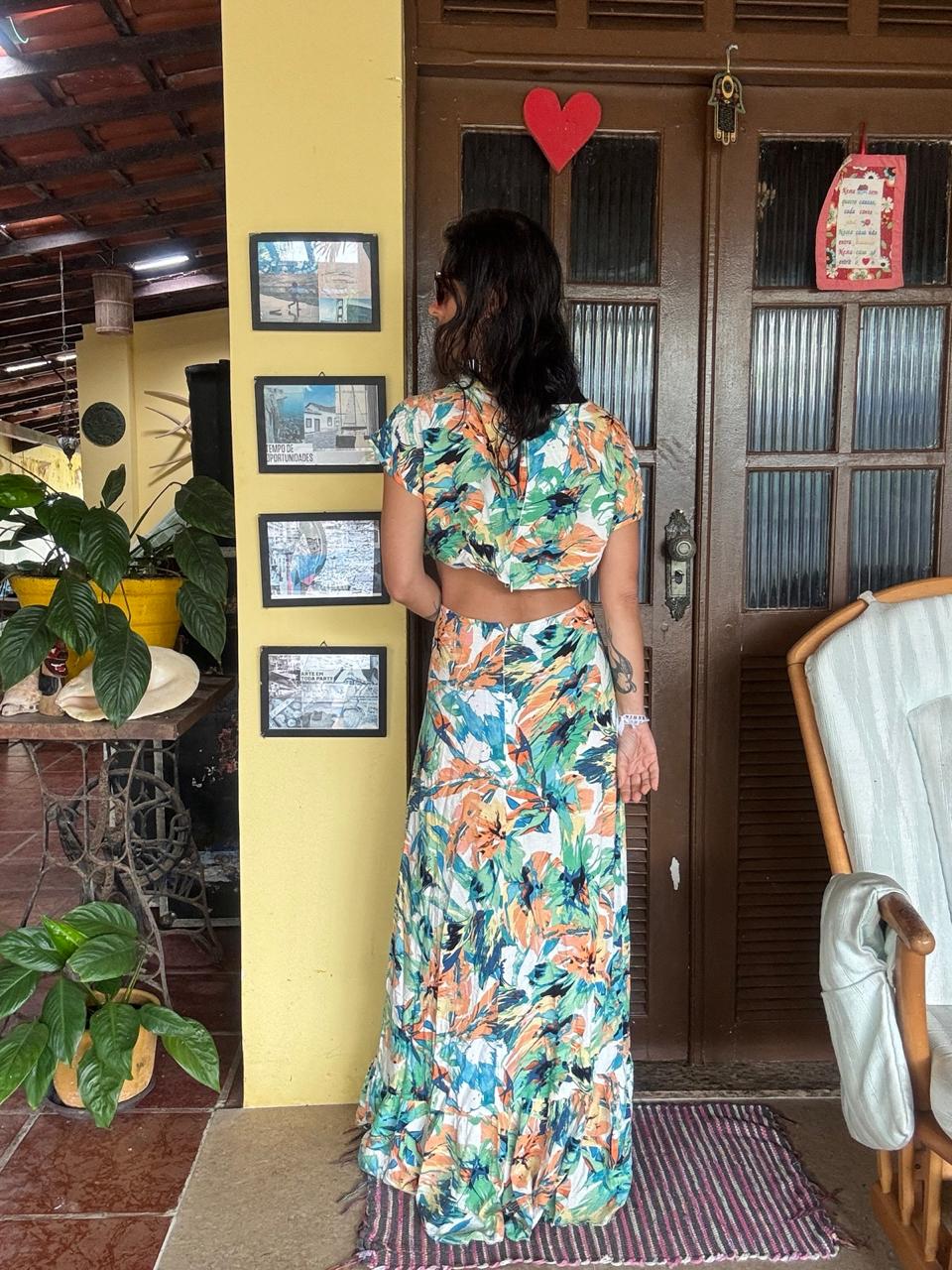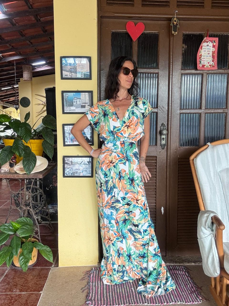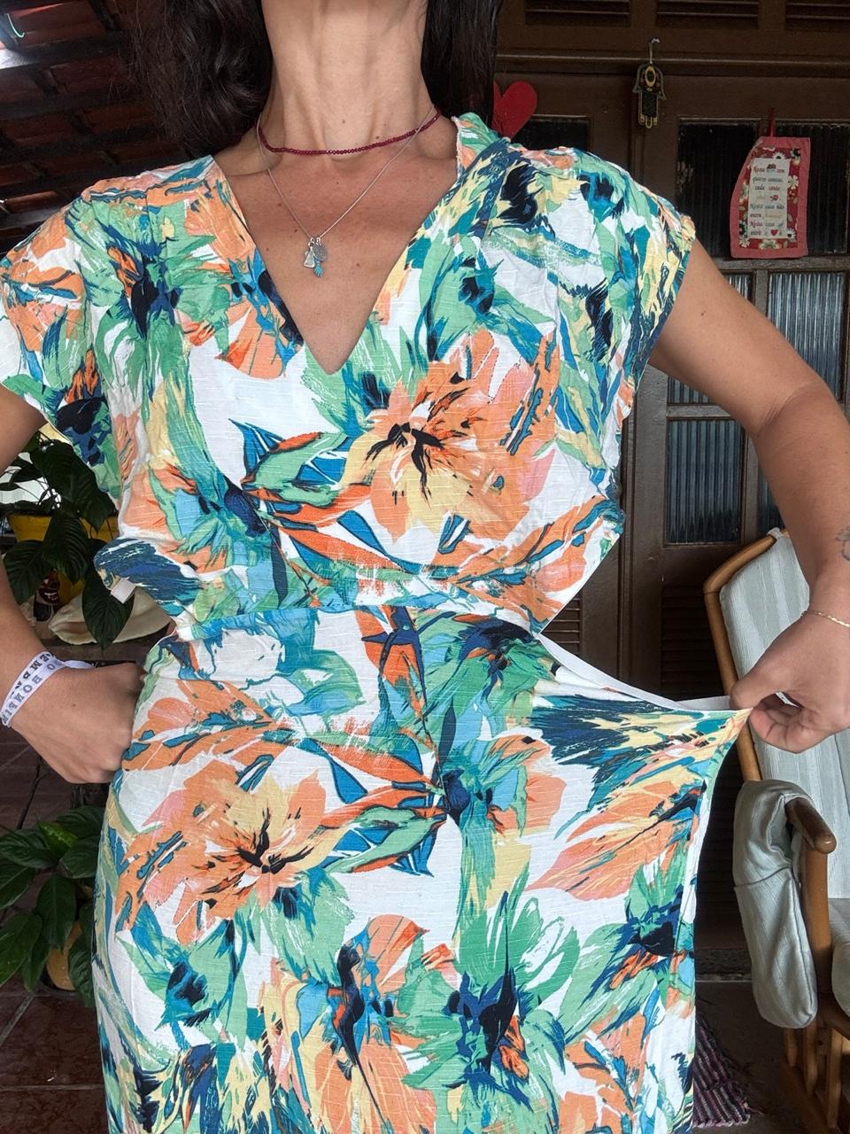 Este modelo exibe uma estampa tropical vibrante em tons de laranja e verde, unindo o frescor do decote em V à ousadia dos recortes laterais “cut out”. Seu comprimento longo e fluído cria um visual moderno e marcante, ideal para quem busca elegância com um toque de personalidade.