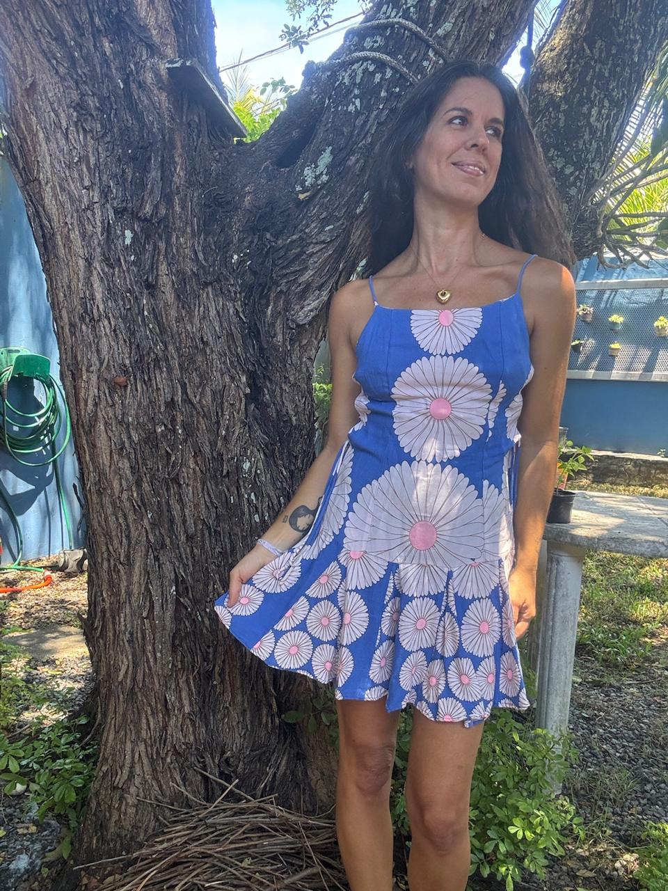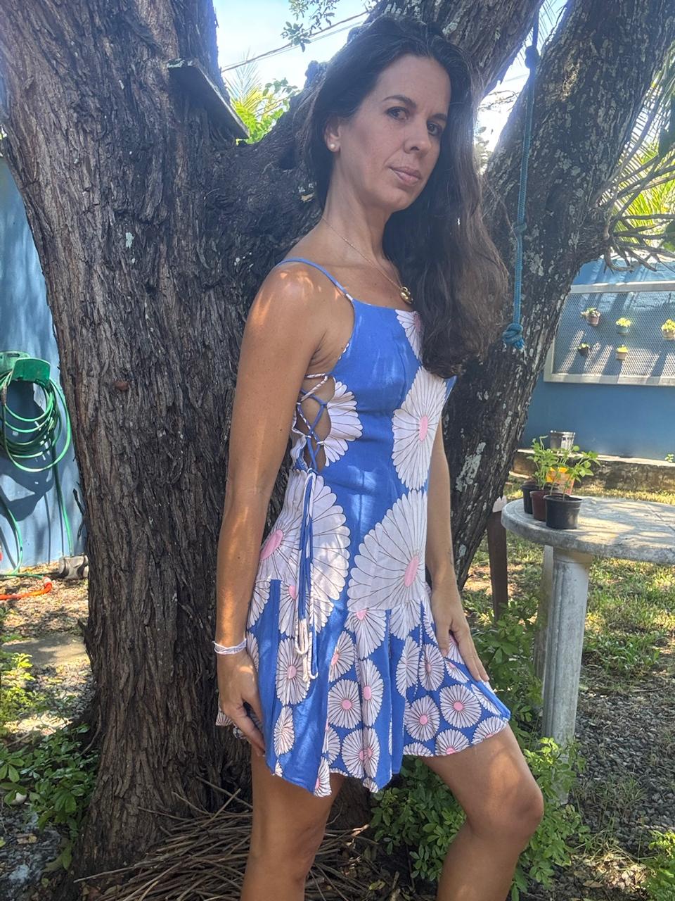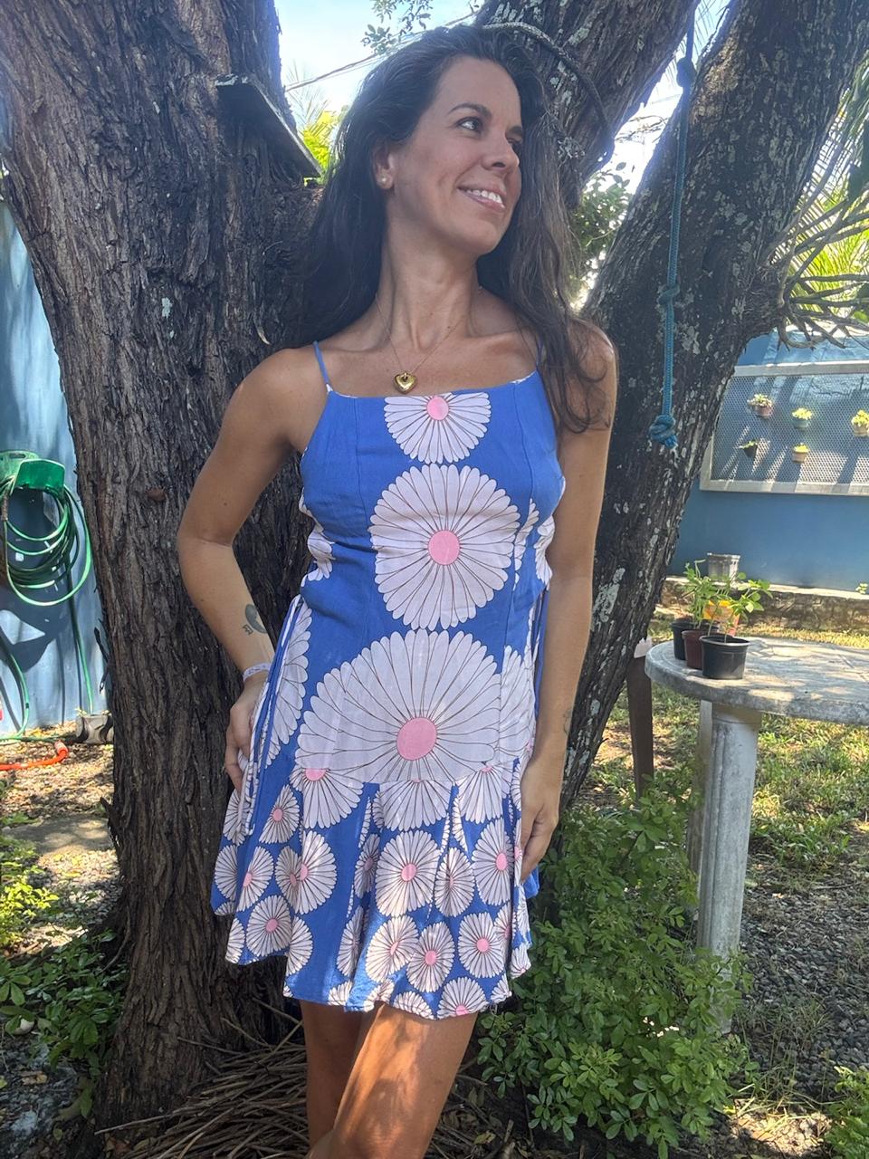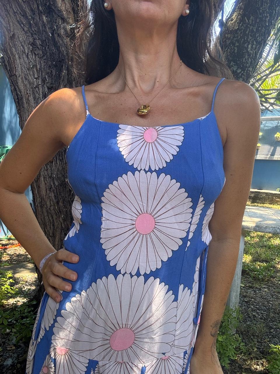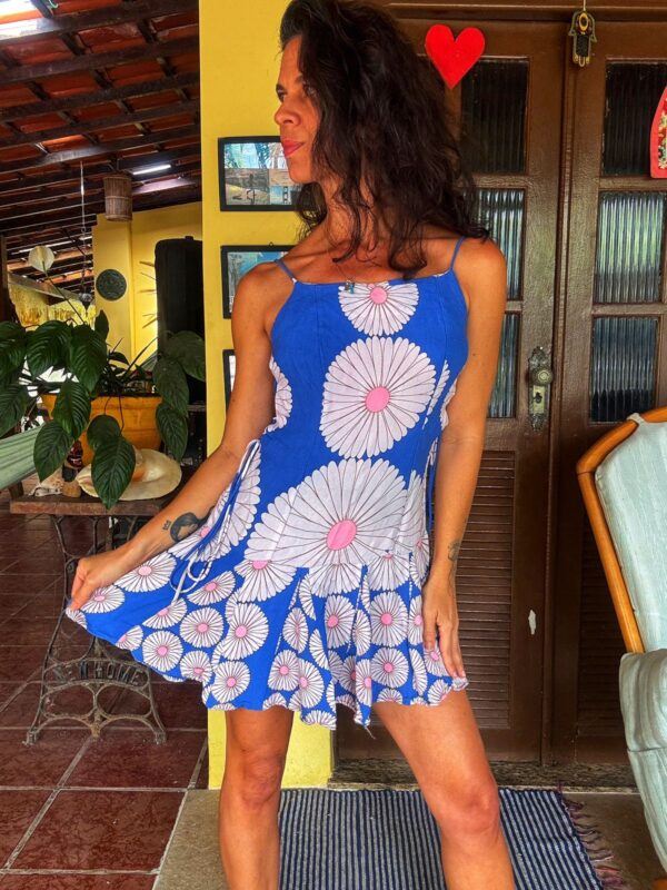 Vestido mini fit and flare em azul vibrante com estampa de margaridas brancas e miolo rosa, detalhe de amarração lateral ajustável e alças finas. Uma peça super fresca e divertida, perfeita para um look de verão com muito estilo, seja na praia ou na cidade, esbanjando charme vintage.
