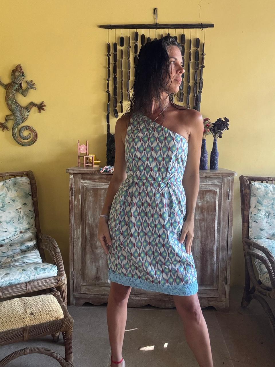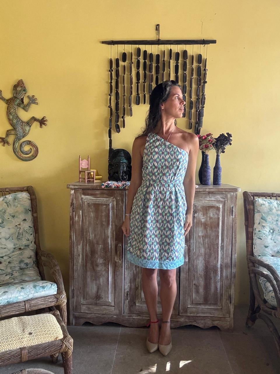 Vestido de comprimento curto com decote assimétrico e estampa geométrica em tons de azul, verde e vinho. A peça possui cintura marcada e detalhe em renda na barra, sendo perfeita para looks casuais e ensolarados.