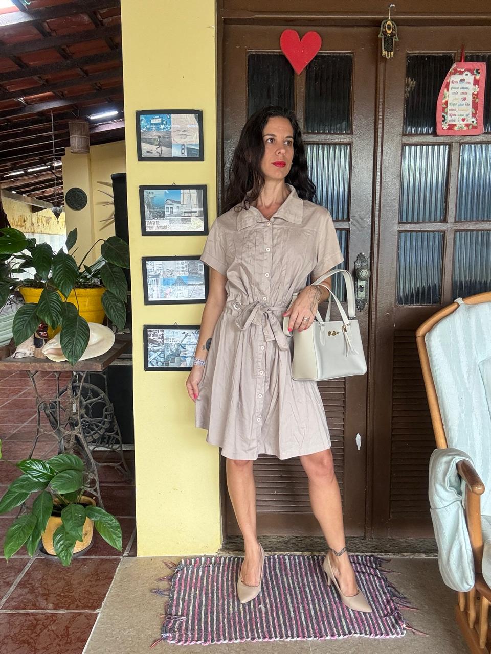 Chemise Urban Nude Vestido estilo chemise em tom nude areia, com abotoamento frontal, gola estruturada e faixa para amarração que redefine a silhueta. Uma peça versátil e atemporal que transita do escritório ao passeio de fim de semana com elegância descomplicada.