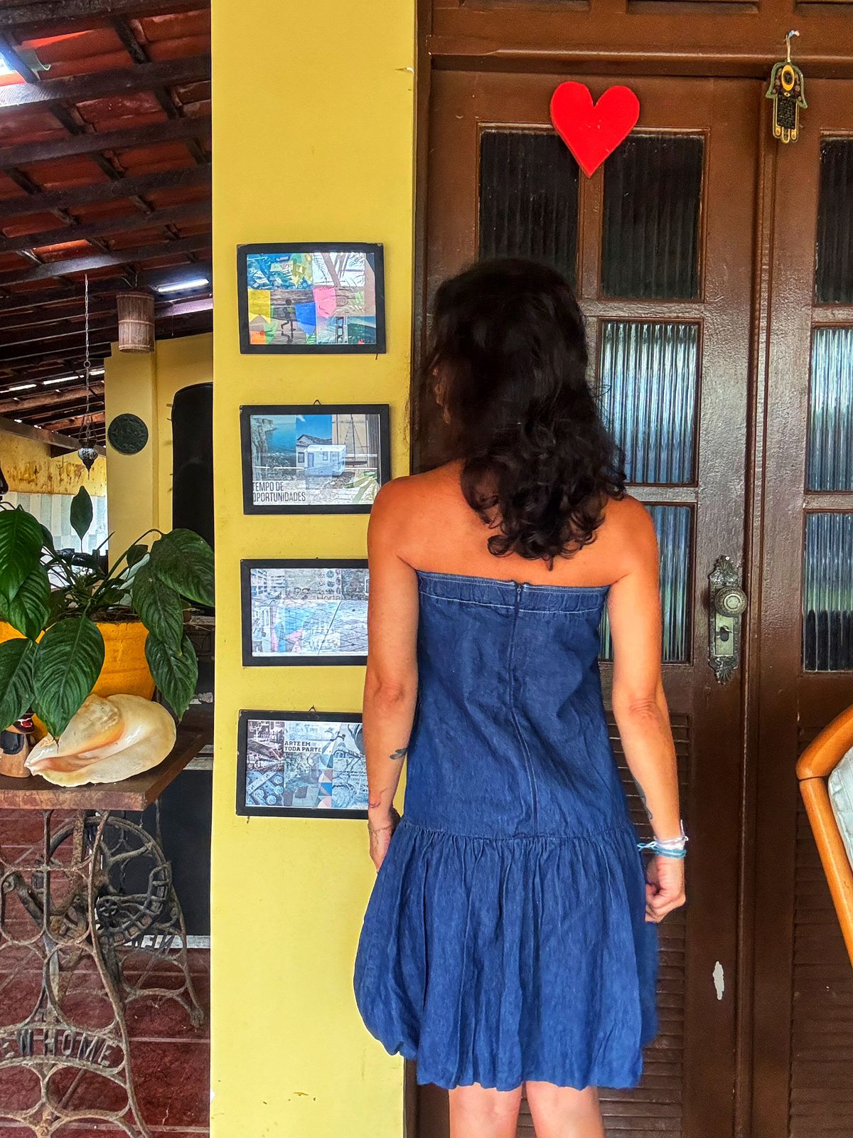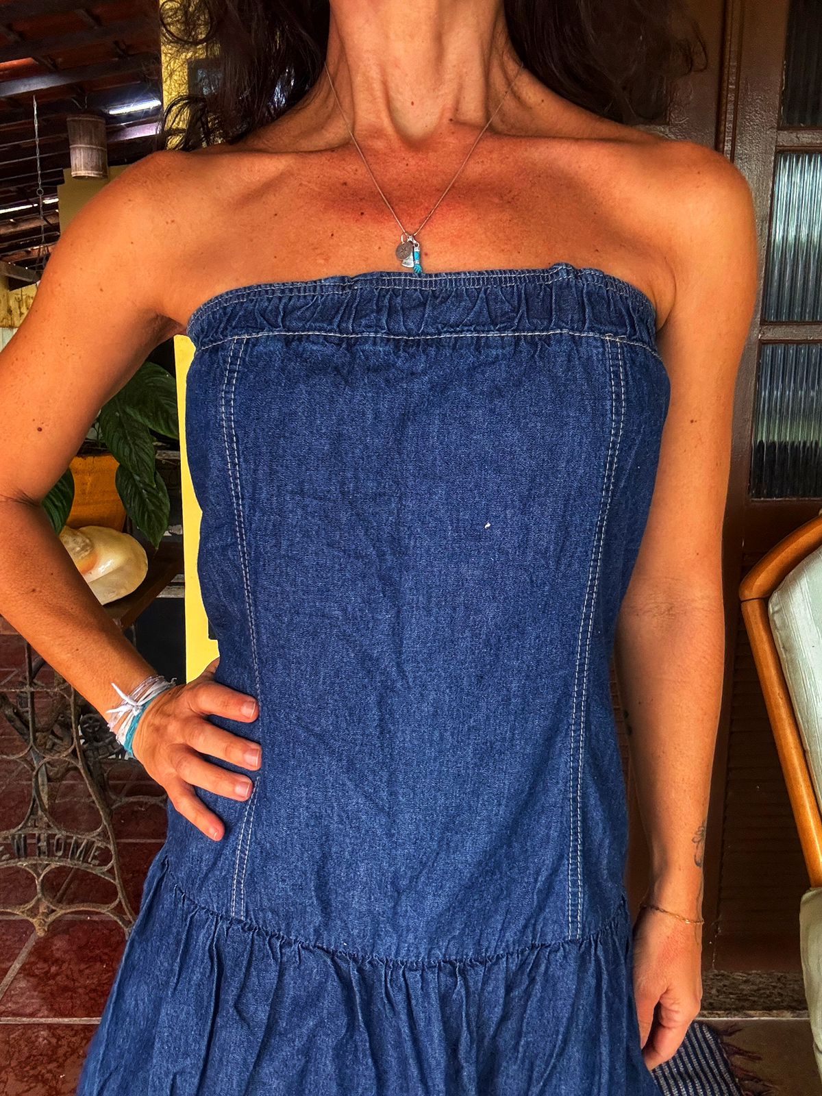 Vestido tomara que caia em jeans escuro, uma peça despojada e charmosa, perfeita para os dias mais quentes. Com detalhe franzido no busto e barra, ele oferece um caimento confortável e um toque de originalidade ao visual