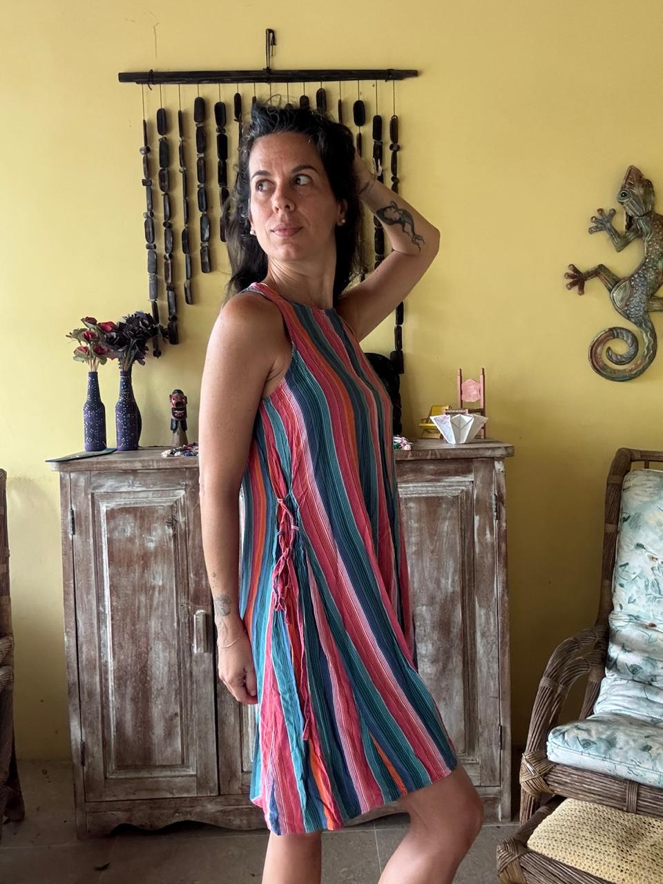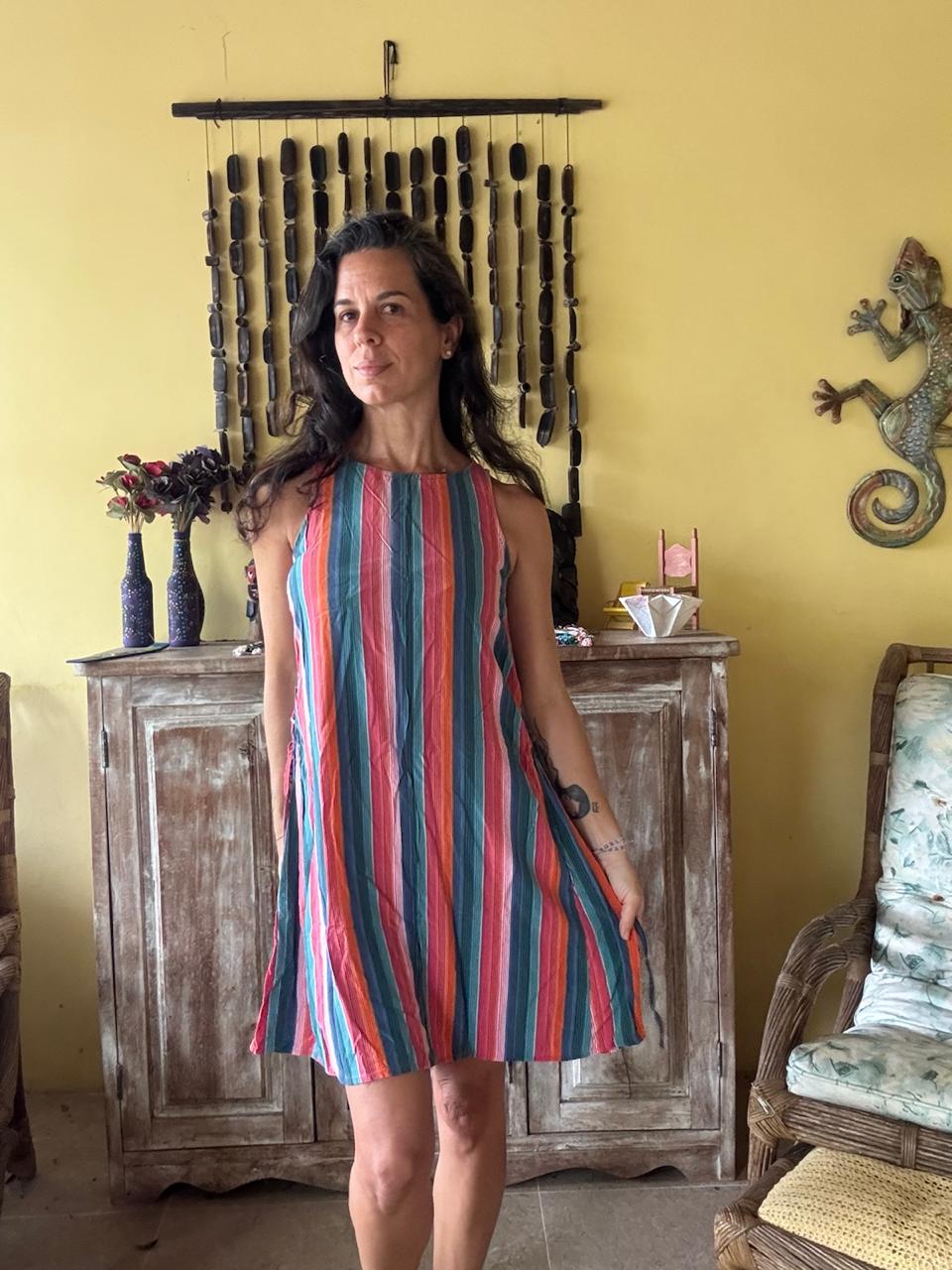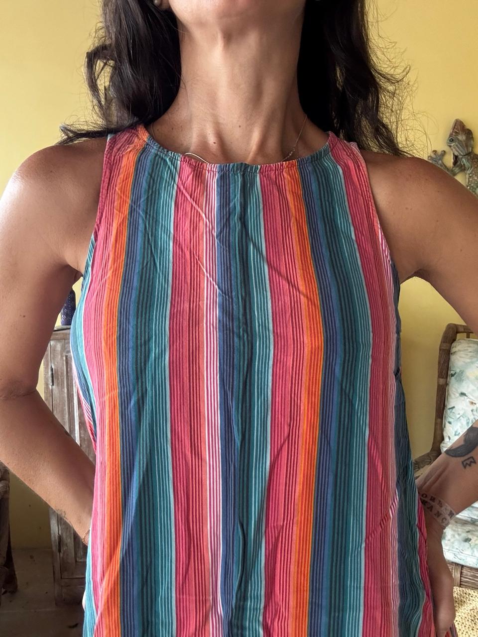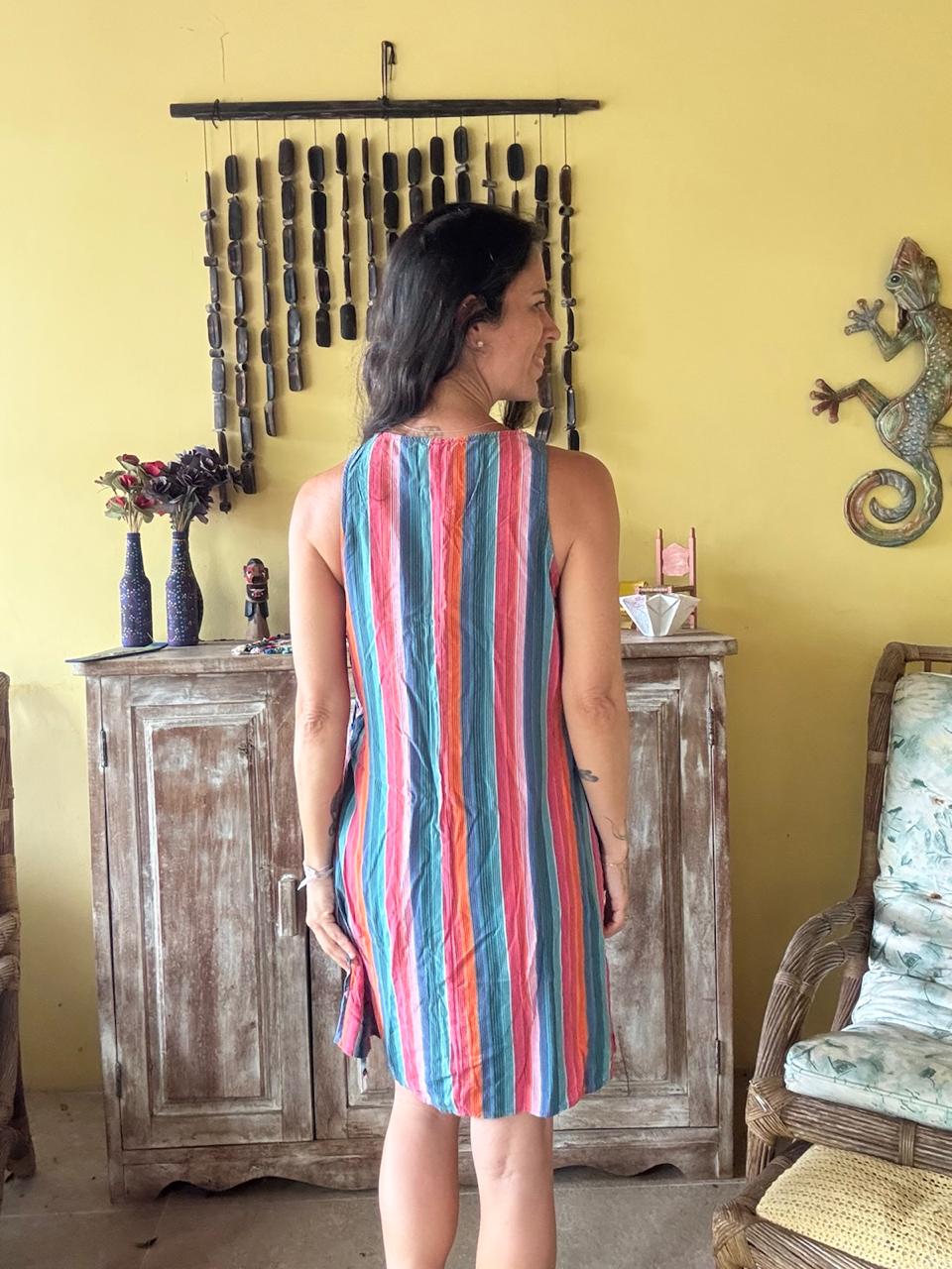 Vestido com estampa de listras verticais vibrantes e modelagem evasê sem mangas. Esta peça leve é ideal para dias ensolarados, passeios ao ar livre ou momentos de lazer.
