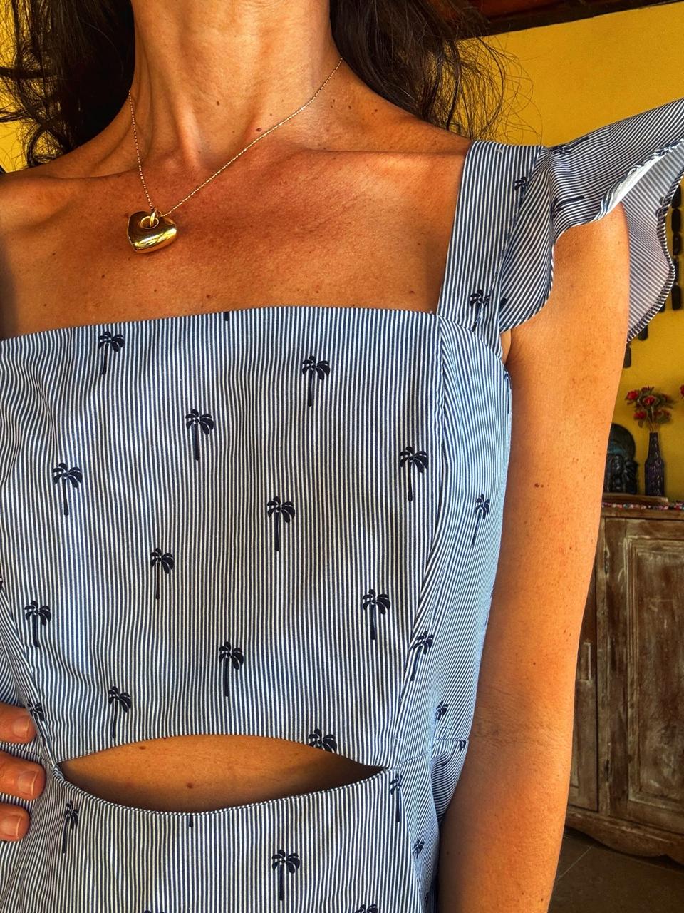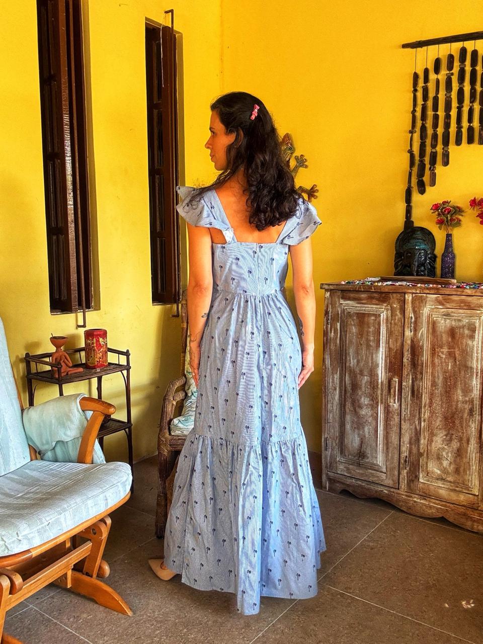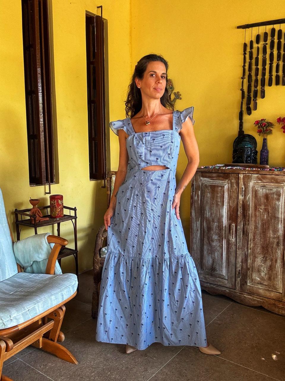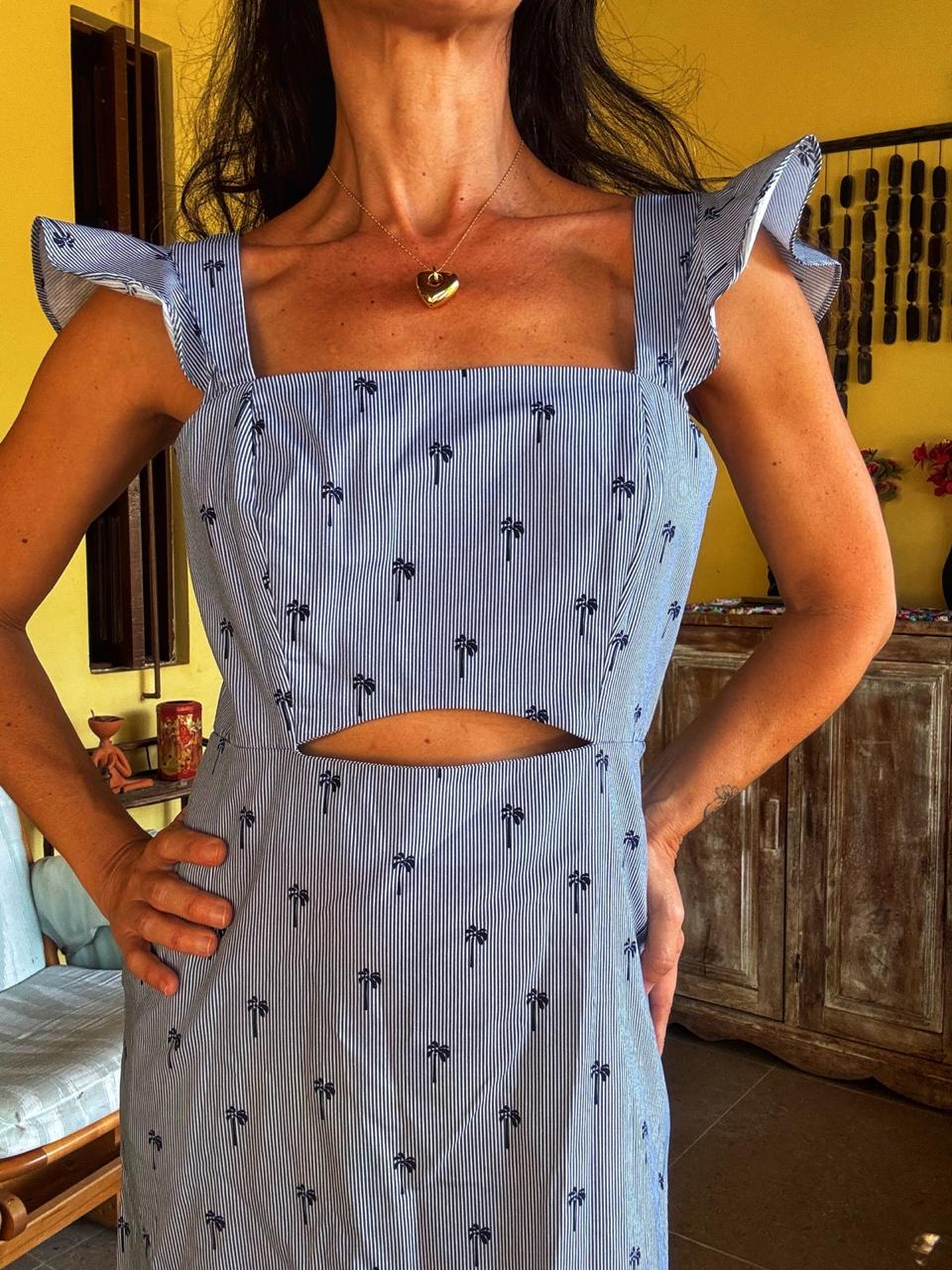 Vestido longo listrado com coqueiros – Elementais – tam P