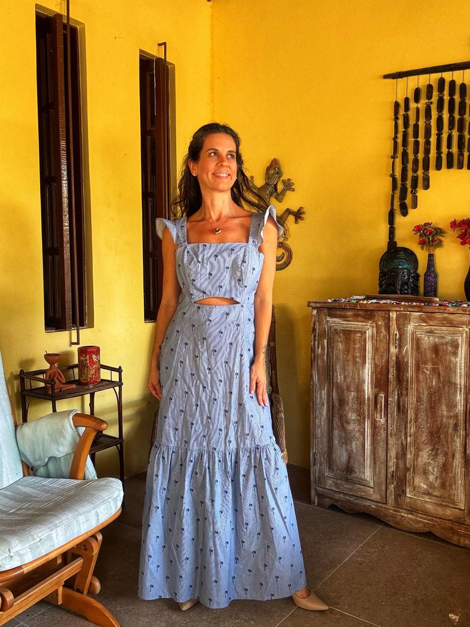 Vestido Maxi Listras e Coqueiros: Peça longa e fluida, com delicadas alças de babados, decote quadrado e um charmoso recorte estratégico na cintura. A estampa de listras e pequenos coqueiros torna este vestido ideal para um look de verão sofisticado.