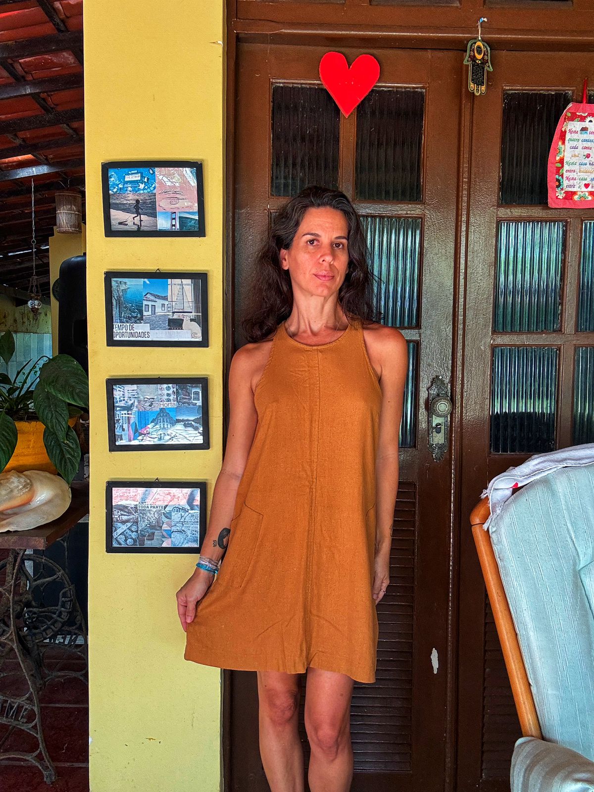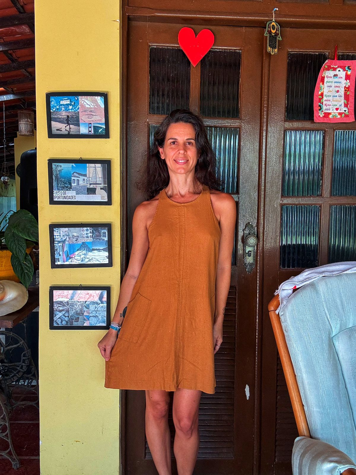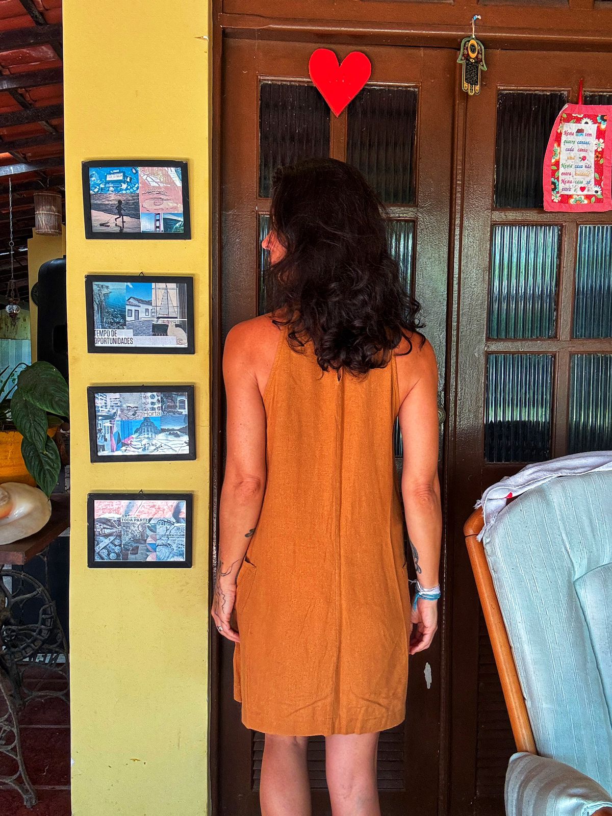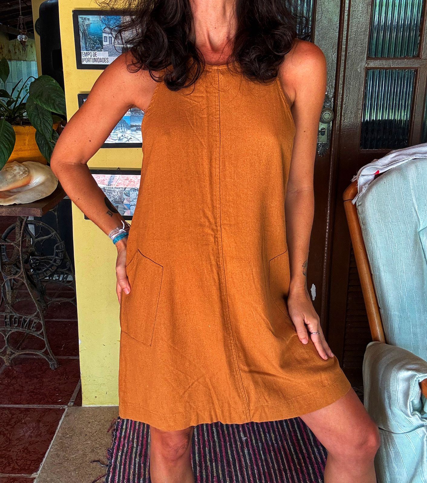 Versátil e confortável, este vestido curto em tom terracota possui modelagem trapézio, alças largas e um charmoso bolso estilo canguru. Perfeito para um look casual e descontraído.
