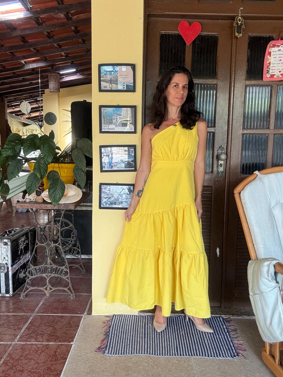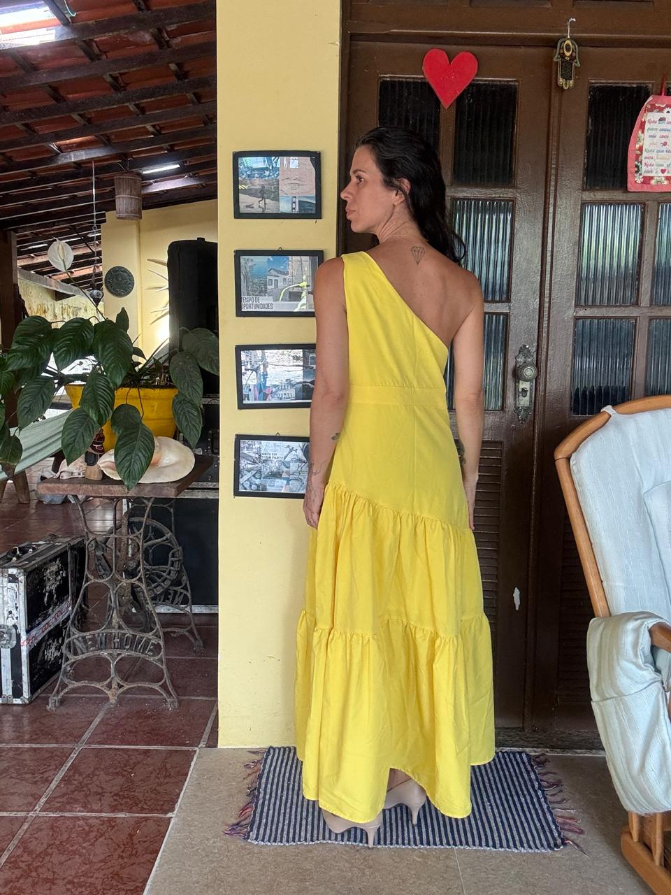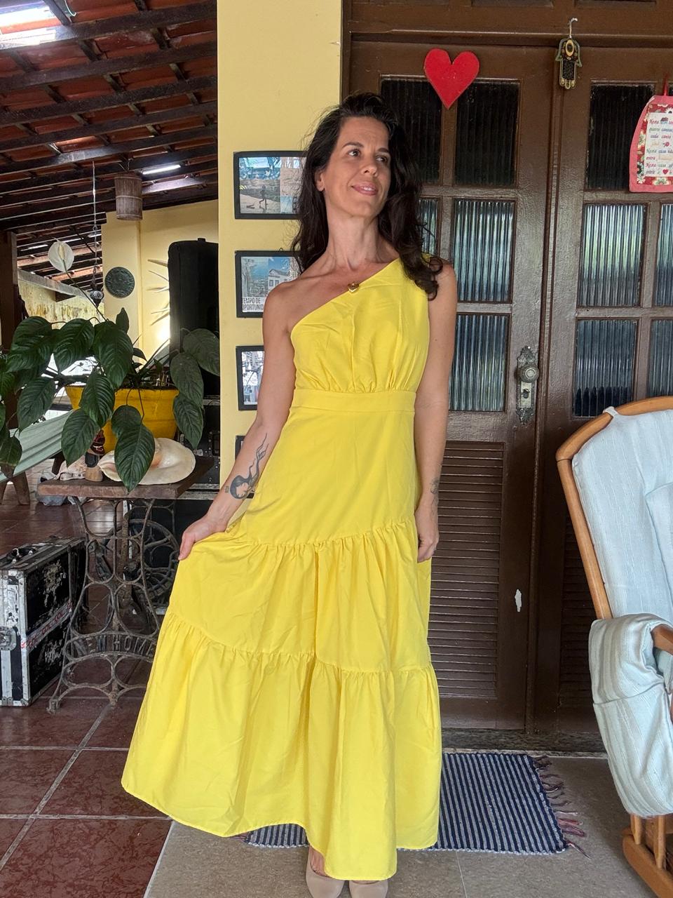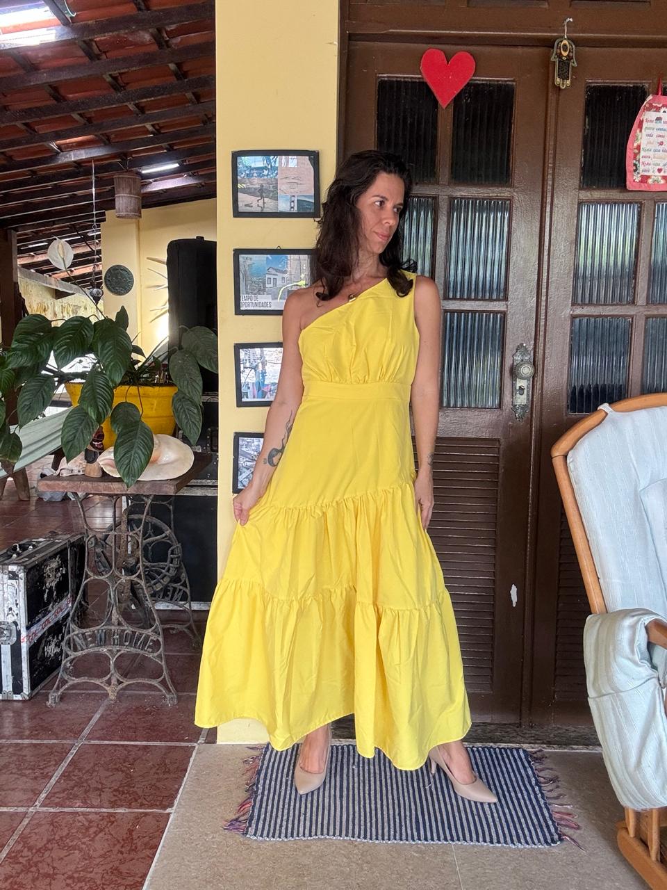 Vestido midi em tom vibrante de amarelo, com decote de um ombro só e cintura marcada, perfeito para eventos diurnos. Saia ampla de três camadas (babados) que confere movimento e leveza, garantindo um visual alegre e super elegante.