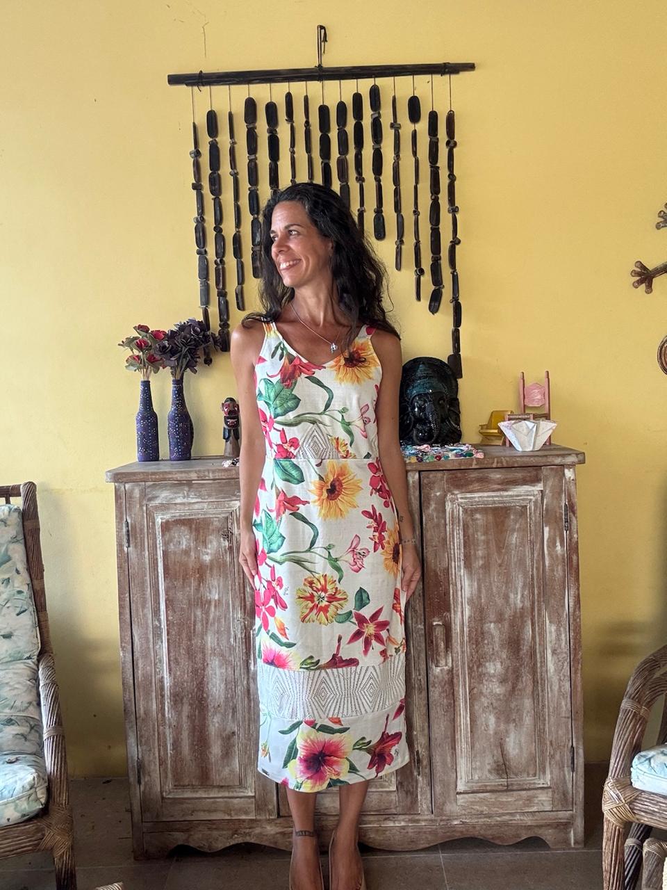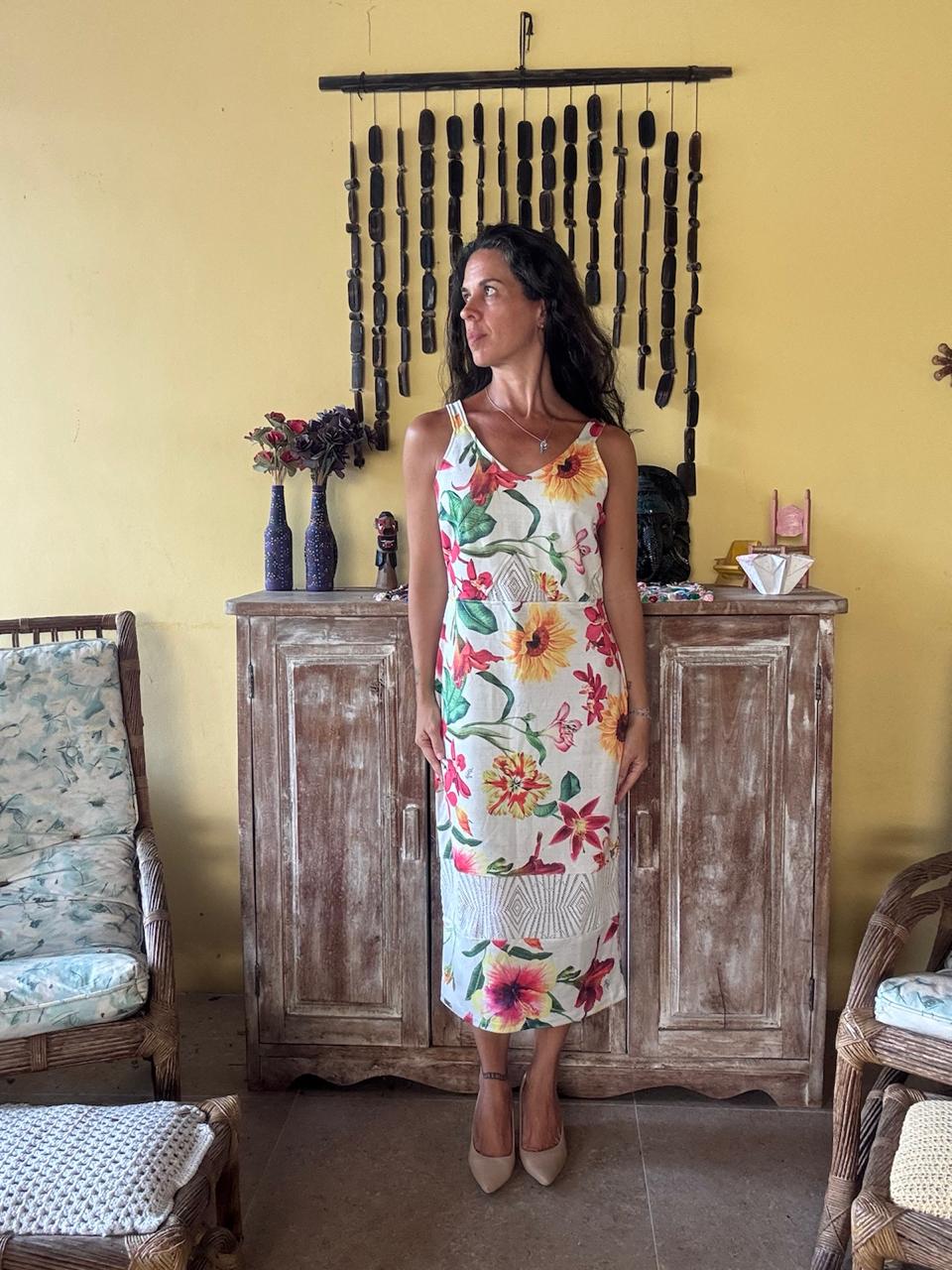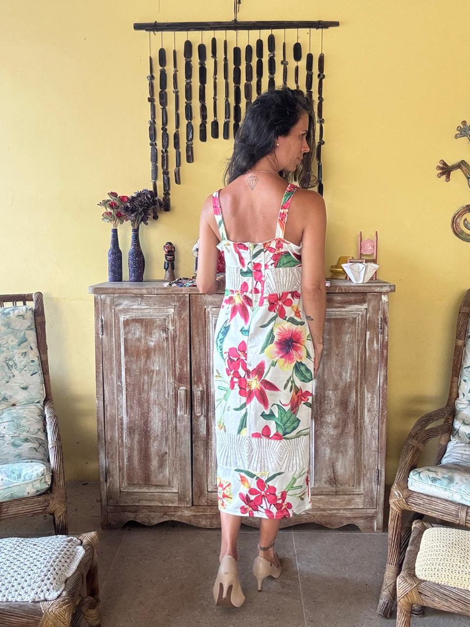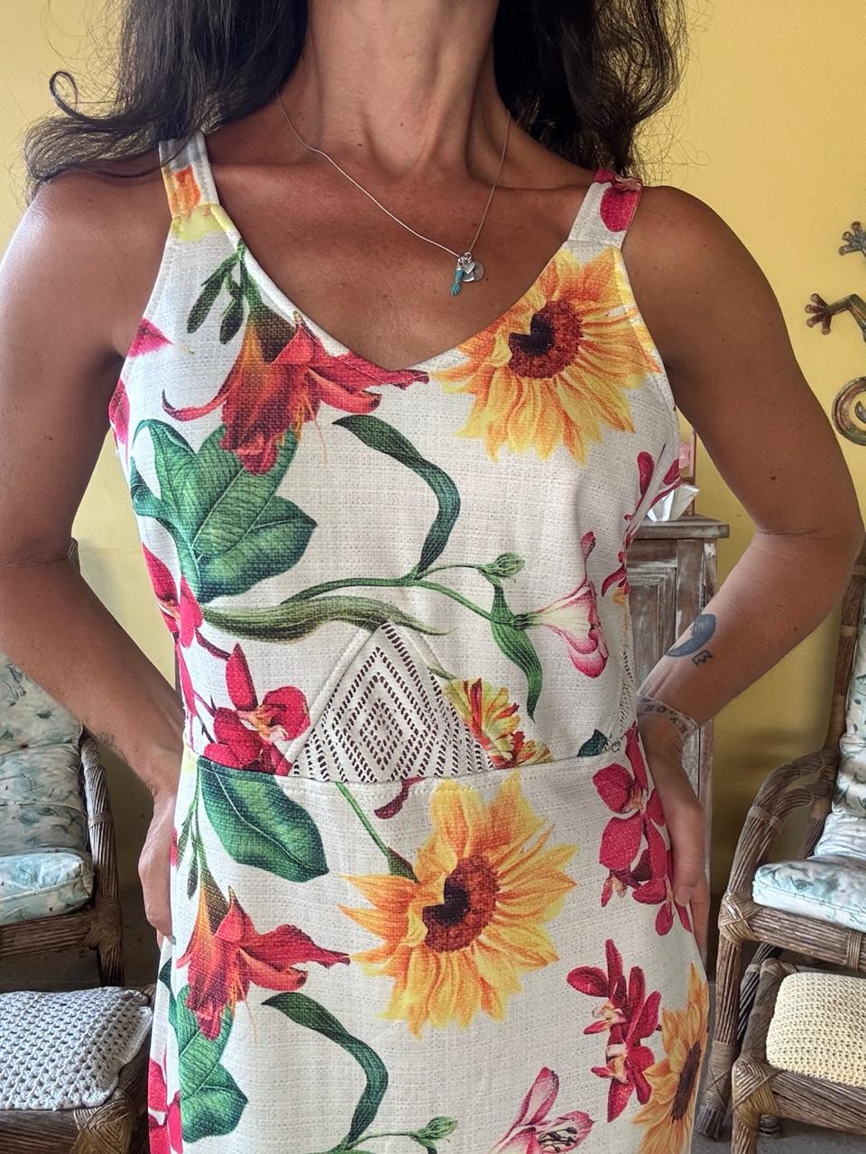 Vestido de comprimento midi com estampa de flores coloridas e detalhes em renda vazada na cintura e barra. Possui alças médias e caimento reto, sendo uma escolha fresca para eventos diurnos.