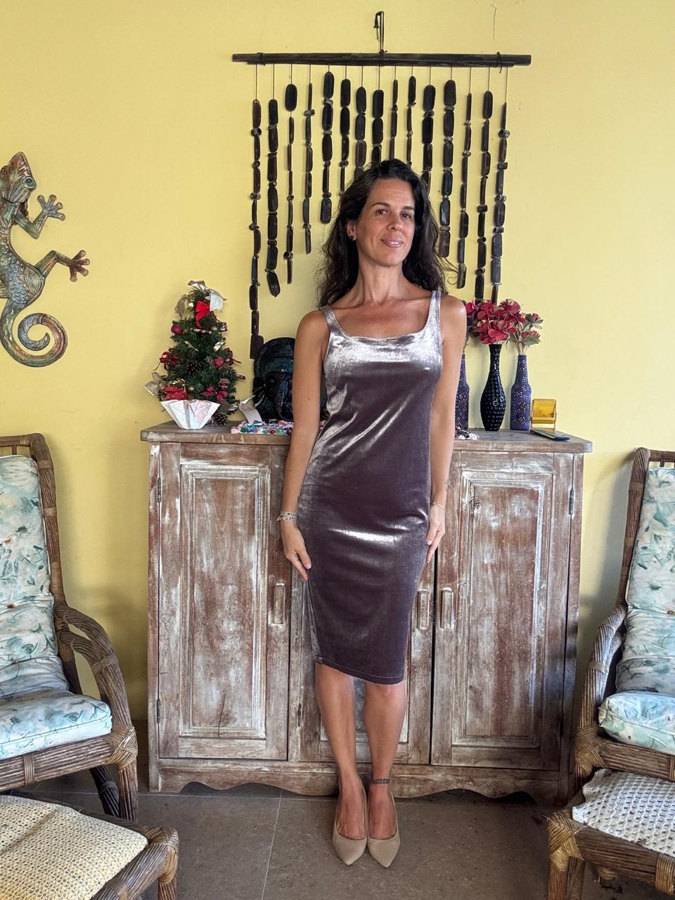 Vestido com brilho acetinado e tonalidade chumbo, apresentando decote quadrado e alças largas que valorizam o colo em jantares noturnos. A modelagem ajustada de comprimento midi proporciona um caimento impecável, unindo a textura suntuosa do tecido a um design minimalista e marcante.