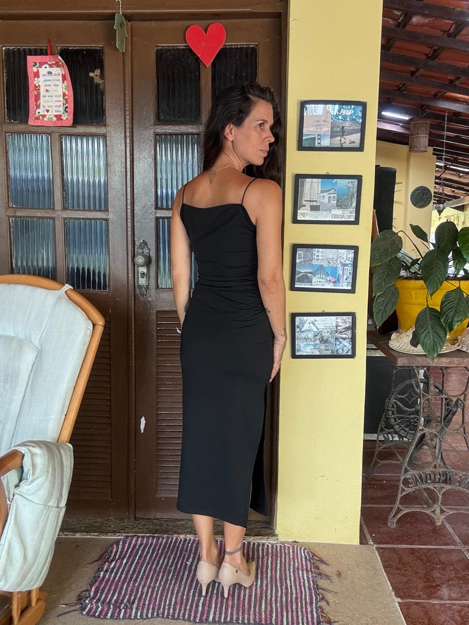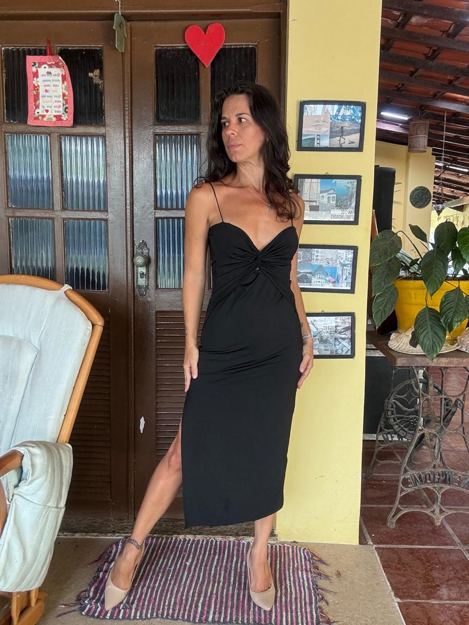 Vestido justo de alças finas com detalhe torcido no busto e fenda lateral discreta. Uma peça clássica e sofisticada para jantares ou ocasiões especiais.
