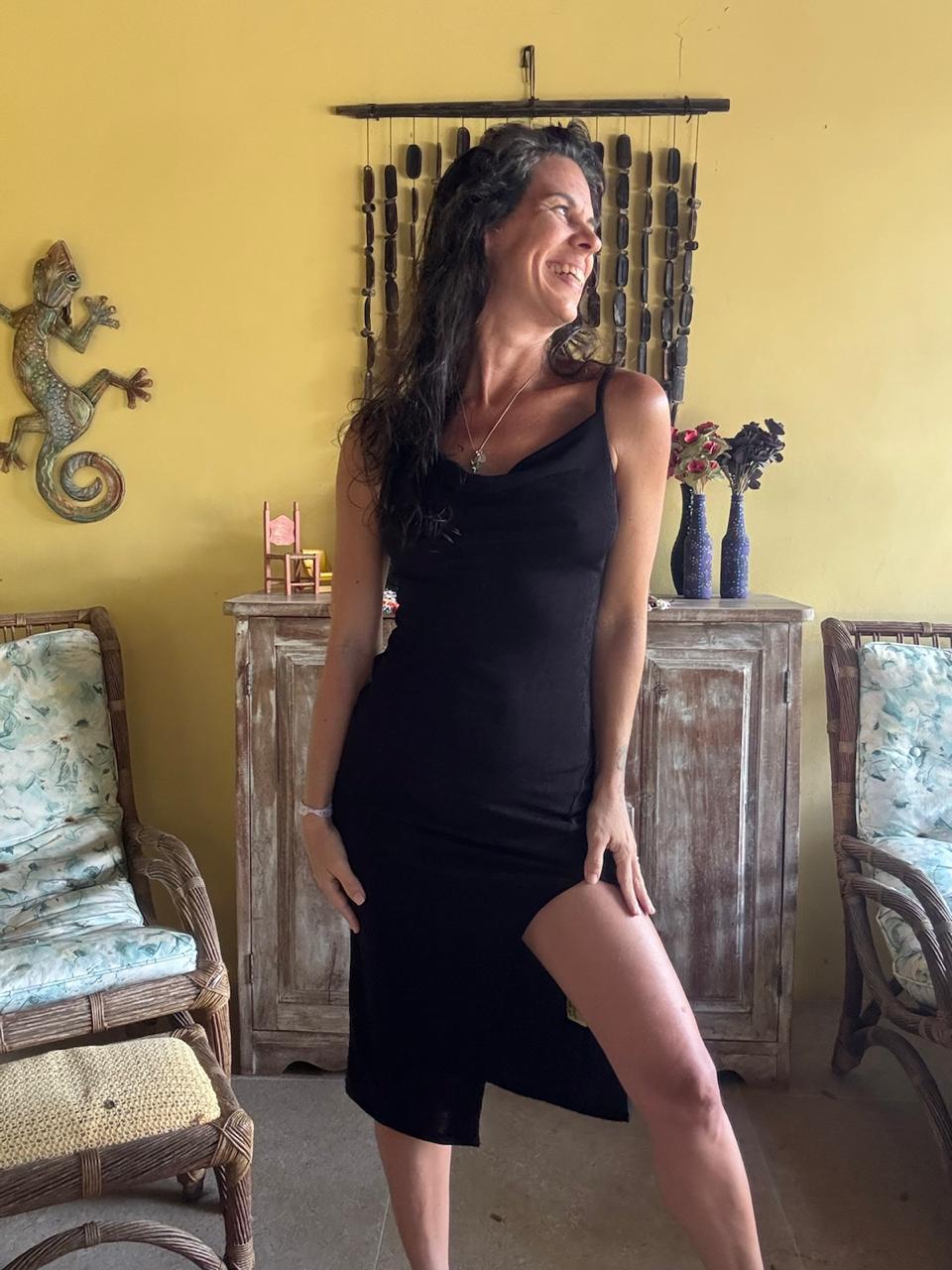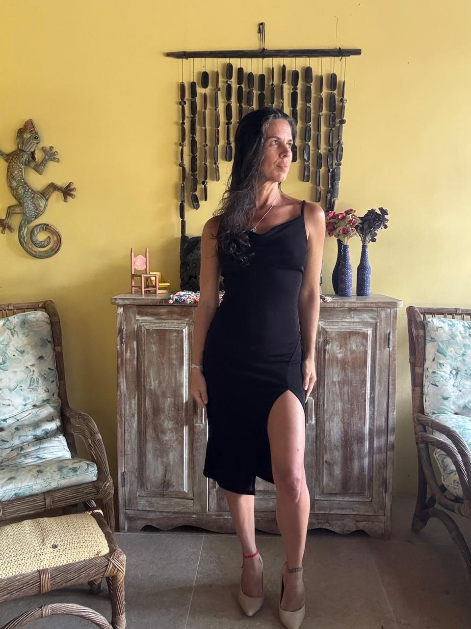 Vestido de alças finas com decote degagê e abertura lateral profunda na saia. Peça elegante de caimento ajustado, ideal para produções noturnas ou ocasiões especiais.