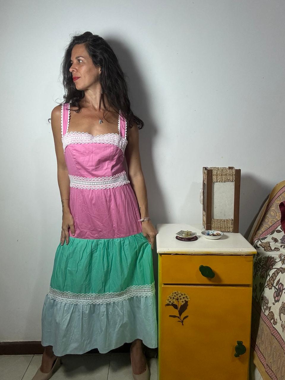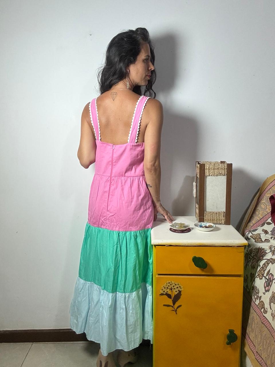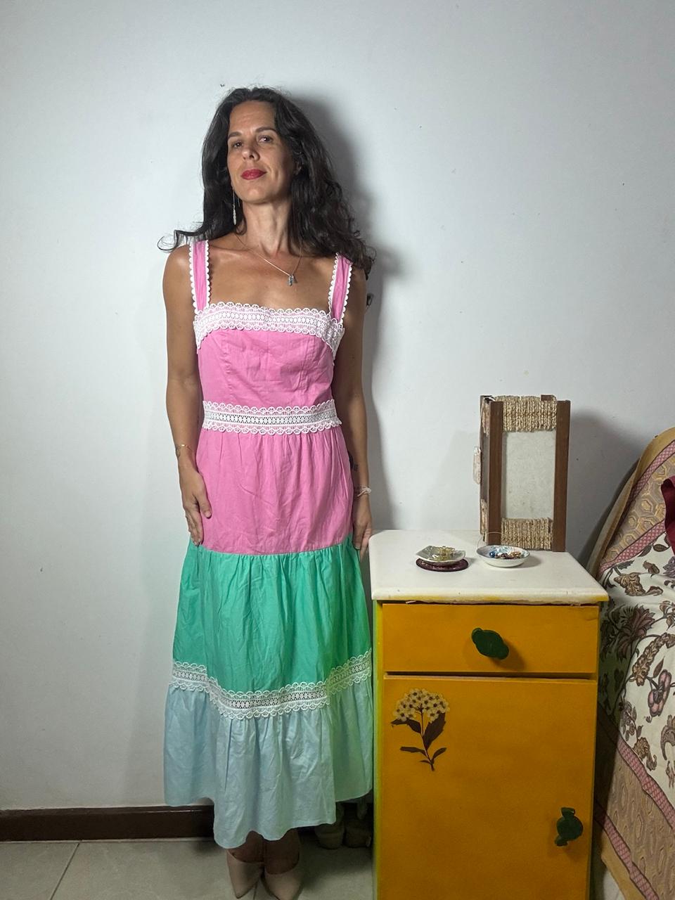 Vestido de comprimento médio com faixas horizontais em rosa, verde e azul, adornado por rendas brancas delicadas. A peça conta com alças largas e fechamento por zíper traseiro, garantindo um look romântico para passeios de fim de semana.